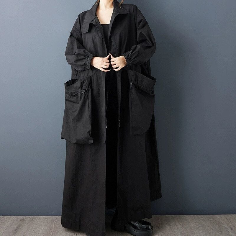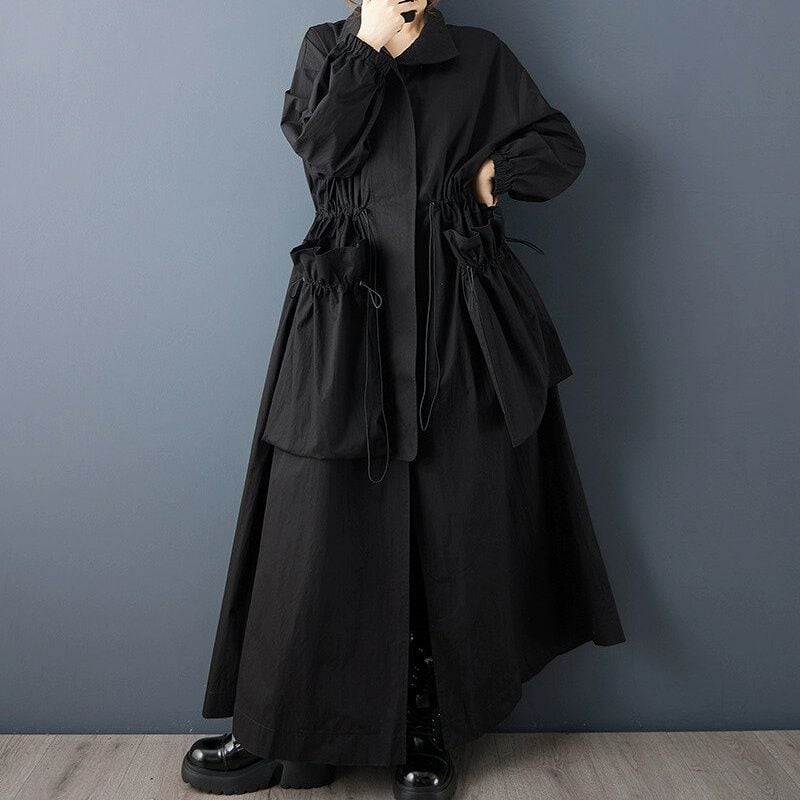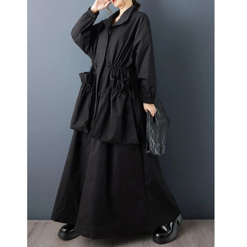 BLACK DRAWCORD WAIST A-LINE MAXI FULLZIP WINDBREAKER COAT 1color M-14852