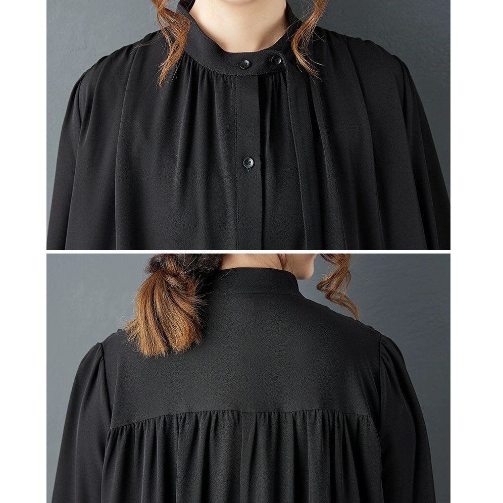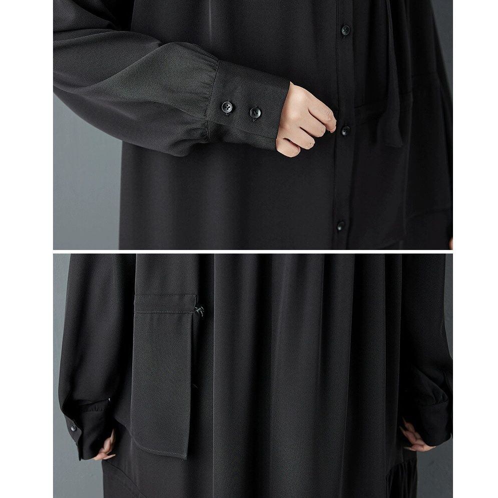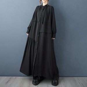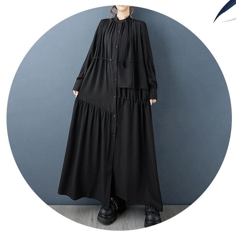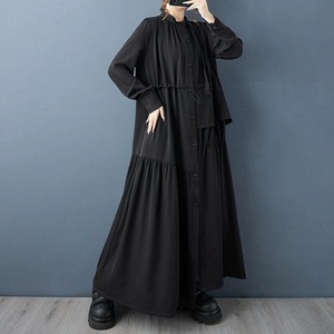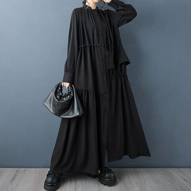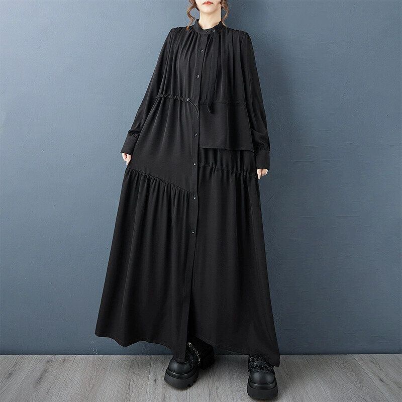 アシンメトリックなデザインがお洒落な、ブラックのスタンドカラー・長袖・マキシ丈のシャツワンピースです。ドローコードでシルエットをアレンジできる、エレガントでクールな印象のアイテムです。