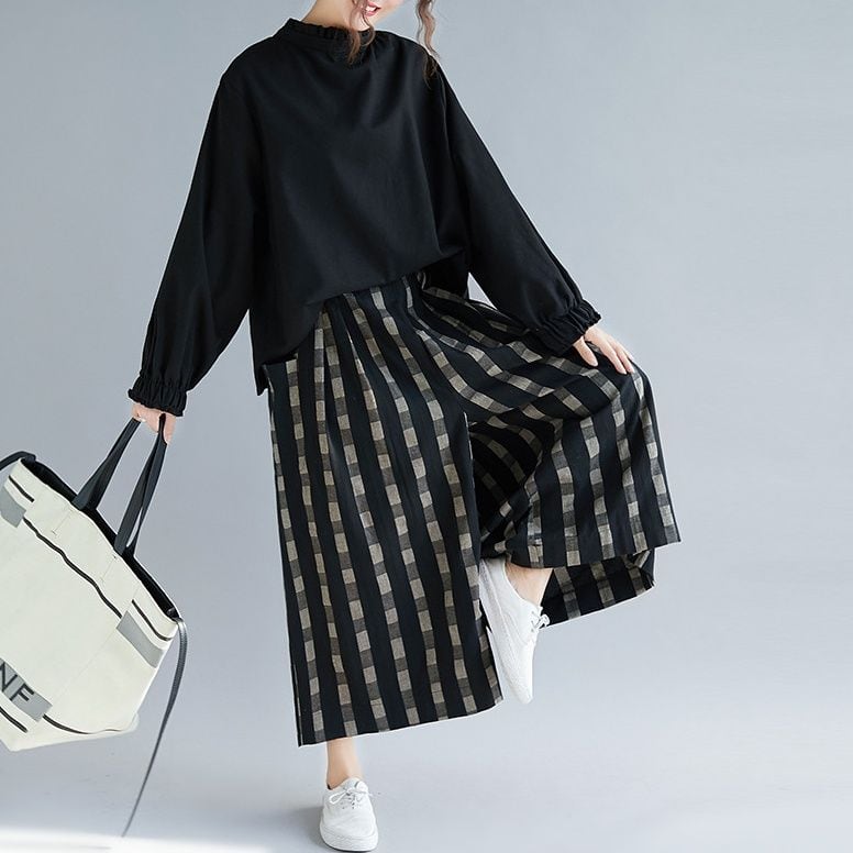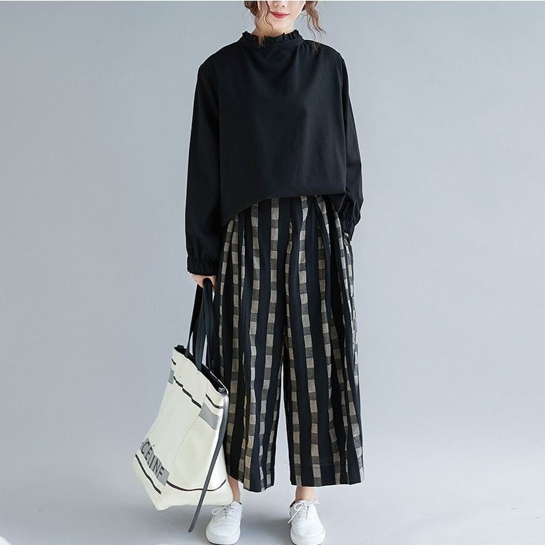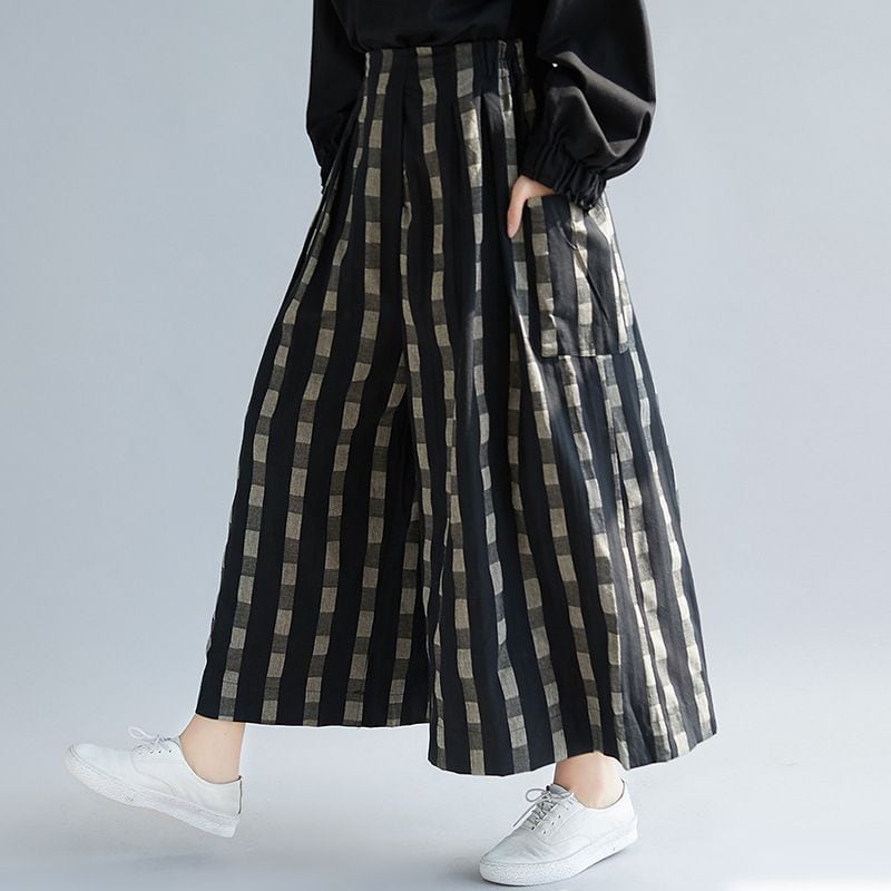ブラックのデザインチェック柄麻素材でできた、ワイドレッグ・クロップドパンツです。ウエストはサイドからバックがゴムなので、着脱が簡単で履き心地が良いです。コーディネートの主役になる、キュートなカジュアルアイテムです。