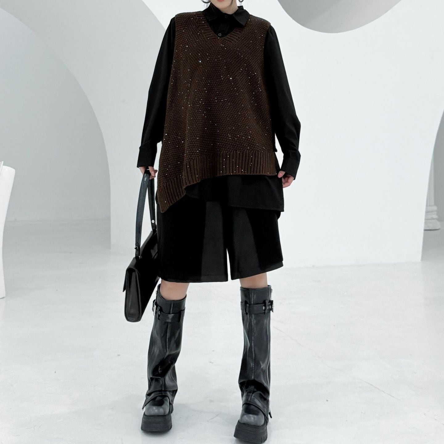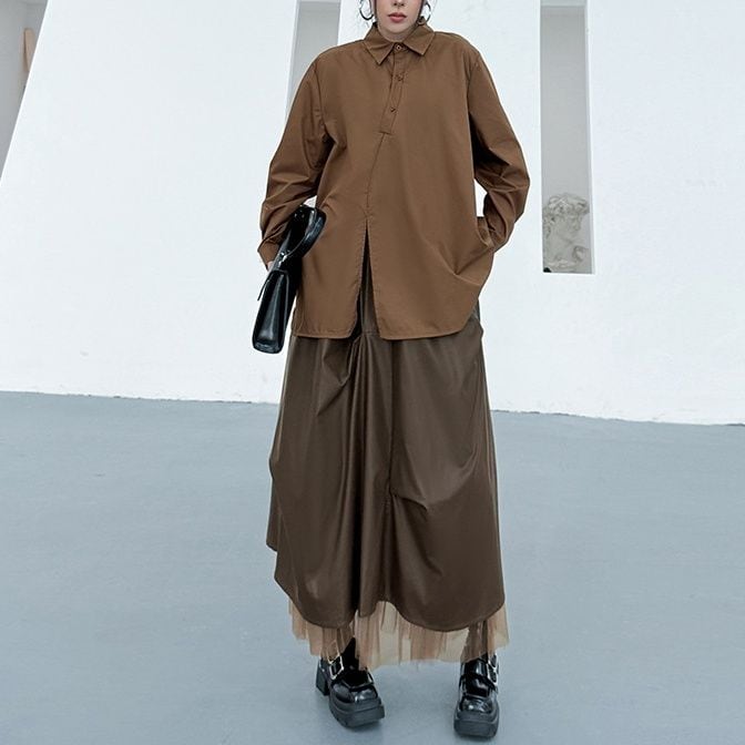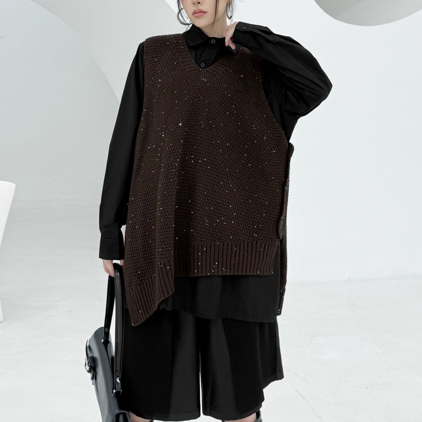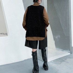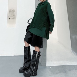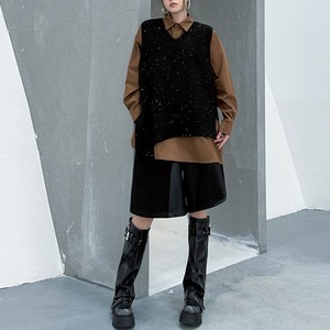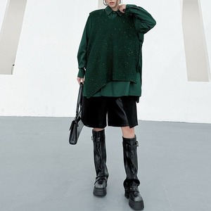 アシンメトリックなデザインがお洒落な、ポロ襟・長袖・ハーフボタン・プルオーバーシャツと、Vネック・ニットベストです。シャツはウェイビーなボタンラインや裾のスリットが特徴的です。ニットはラメの入ったゆったりしたシルエットで、サイドにスリットが入っています。色は各3色から選べます。 SIZE:※測り方によって2-3cmの差が生じる場合がございます。 【FREE SIZE】 <Vest>バスト122cm 肩幅39cm ウエスト120cm 着丈74cm <Shirt>バスト122cm 肩幅43cm 袖丈60cm ウエスト132cm 着丈85cm COLOR:Green(Vest)、Brown(Vest)、Black(Vest)、Green(Shirt)、Brown(Shirt)、Black(Shirt) 素材:ポリエステル、その他 モデル情報:身長166cm 体重52kg バスト80cm ウエスト66cm ヒップ86cm STYLE CALENDAR:春〇 夏〇 秋◎ 冬〇 お届けについて こちらの商品は海外店舗より直接発送となる為、 ご決済から到着までは、多くの場合【10日-2週間前後】でお届けしております。 ※在庫状況や輸送の混雑により、4週間前後かかる場合がございます。 注意事項 ・商品在庫切れにより注文キャンセルとさせていただく恐れもございますので、予めご了承くださいませ。 ・仕入れ工場を変えることがあるため、記載サイズと若干異なる場合がございます。 ・商品の色味は、お手持ちのスマートフォンの画面によって実物と若干異なる場合がございます。 ・イメージ違いやサイズ交換等、お客さまご都合による交換・返品はご遠慮ください。 送料について 全国一律580円。ただし10,000円以上のご注文で送料無料となります。 お支払い方法について ・クレジットカード決済(VISA/Mastercard/JCB/アメリカン・エクスプレス/ Diners Club) ・コンビニ決済/Pay-easy ※前払いのお支払い方法 ・Pay ID あと払い(コンビニ払い、口座振替) ※あと払いのお支払い方法 ・キャリア決済(d払い/au PAY(auかんたん決済)/ソフトバンク・ワイモバイルまとめて支払い) 管理番号:M-14862