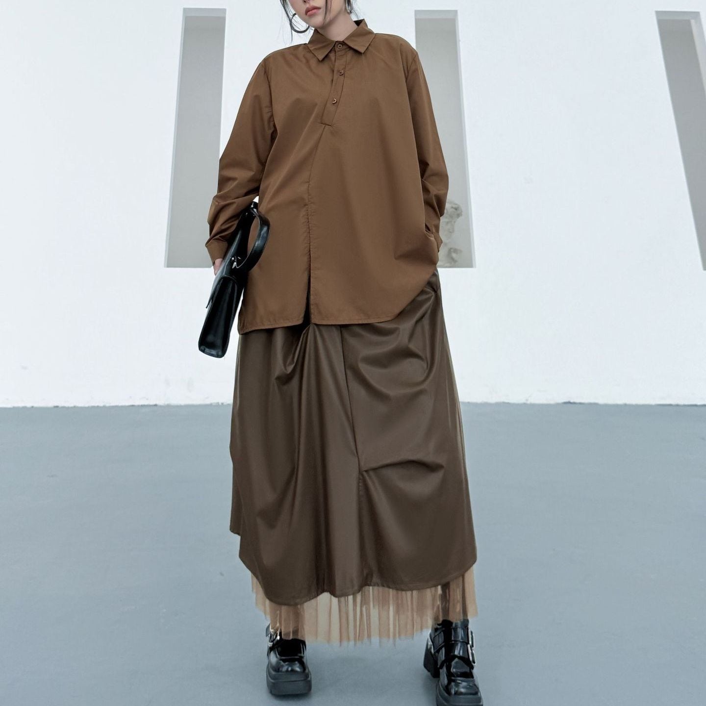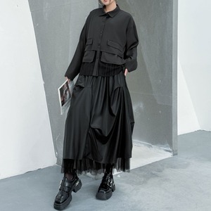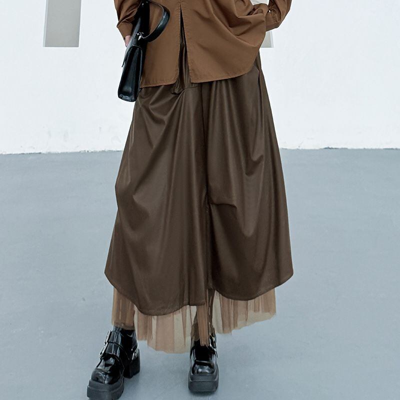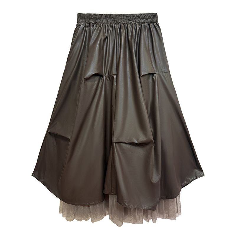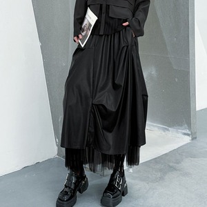 PU素材にメッシュの裾がお洒落な、Aライン・ロング丈のデザインスカートです。ウエストはゴムなので、着脱が簡単で履き心地が良いです。イレギュラーなピンチプリーツが作り出すシルエットが特徴的な、単色で合わせやすいアイテムです。ブラックとブラウンの2色から選べます。