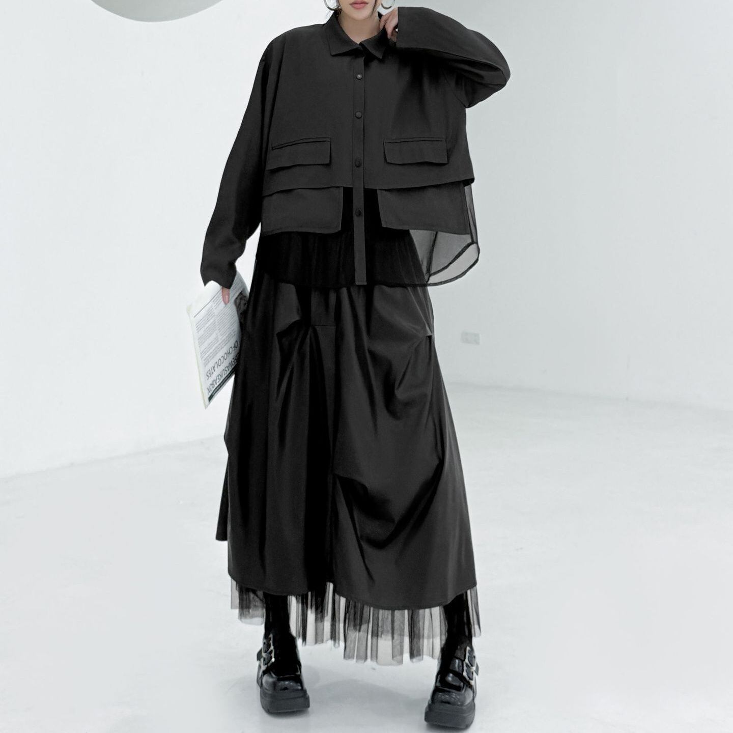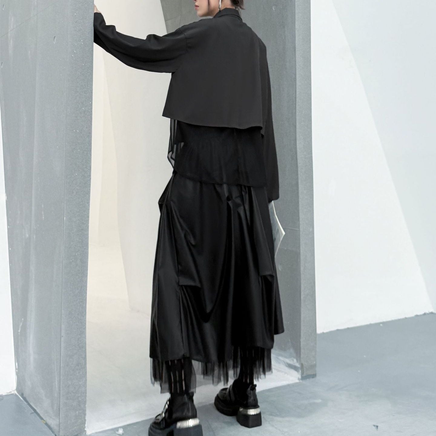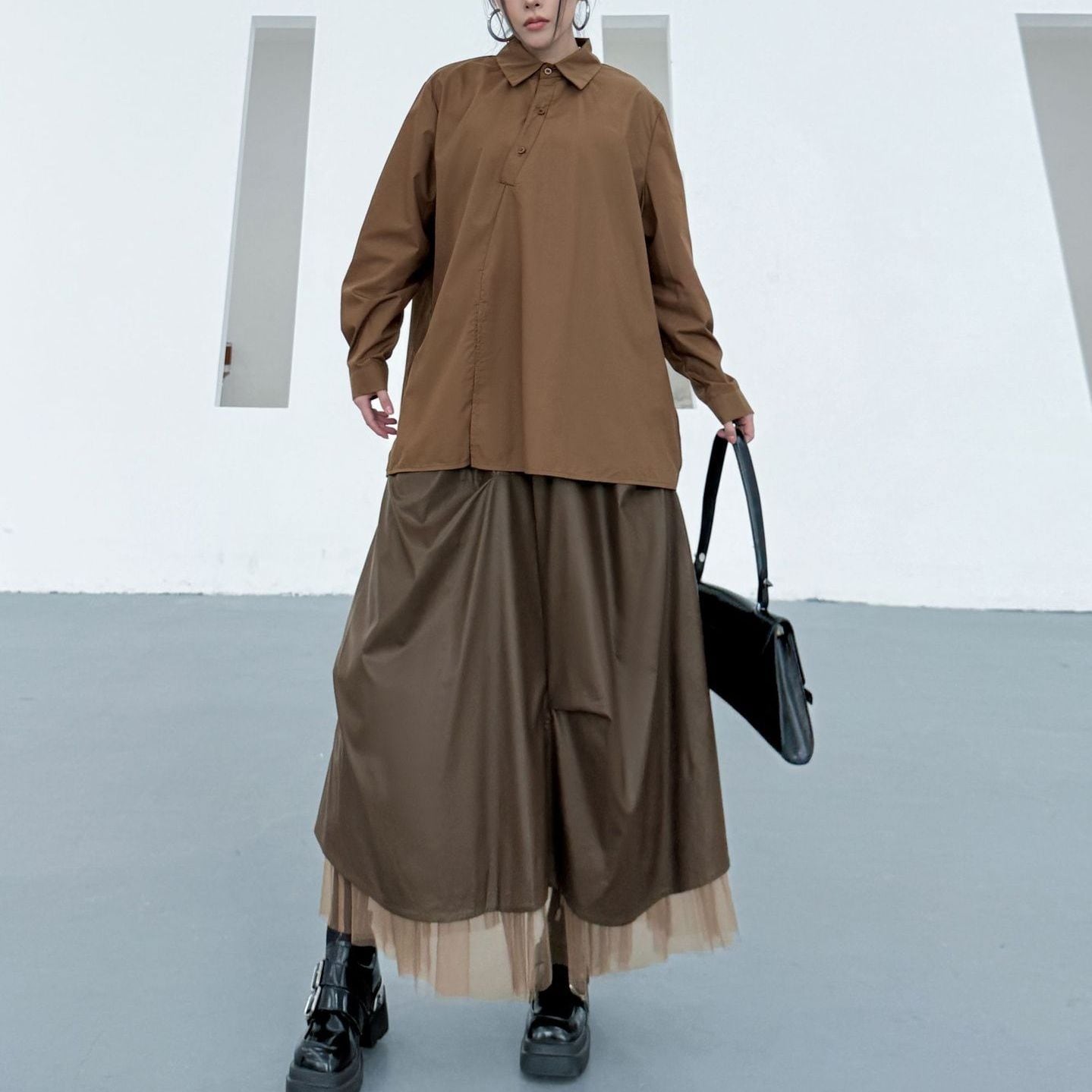 PU素材にメッシュの裾がお洒落な、Aライン・ロング丈のデザインスカートです。ウエストはゴムなので、着脱が簡単で履き心地が良いです。イレギュラーなピンチプリーツが作り出すシルエットが特徴的な、単色で合わせやすいアイテムです。ブラックとブラウンの2色から選べます。