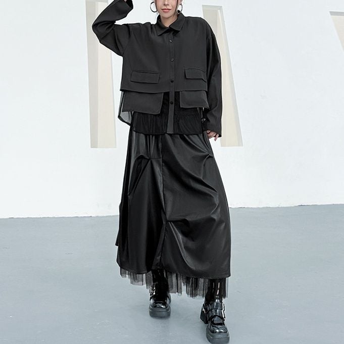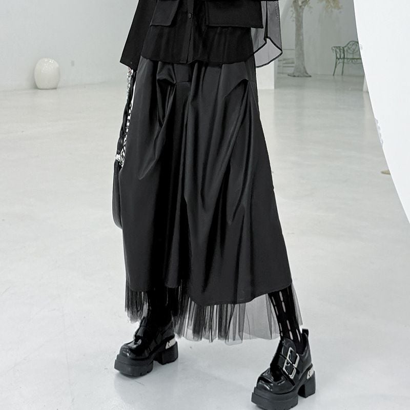 PU ELASTIC WAIST MESH HEM LONG SKIRT 2colors M-14864