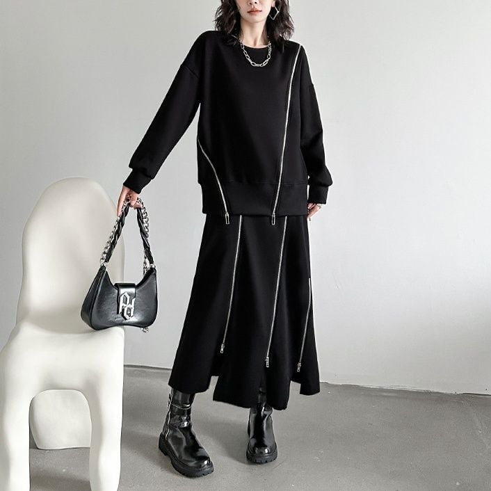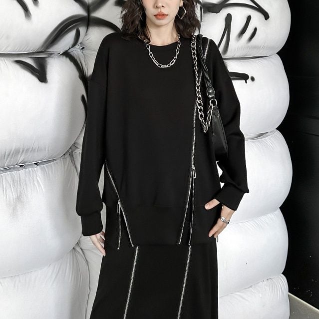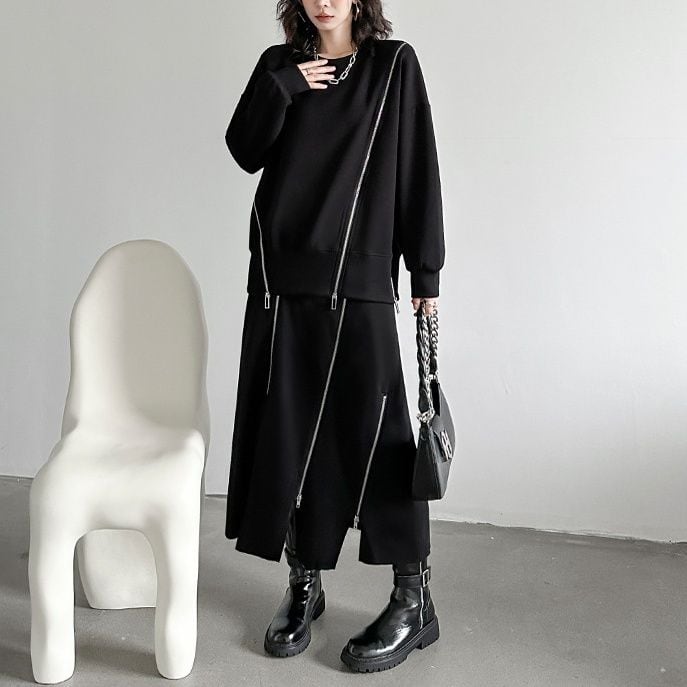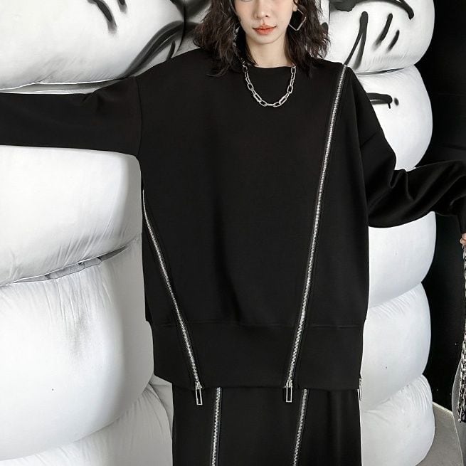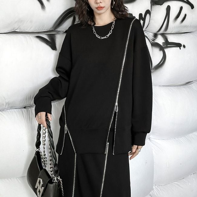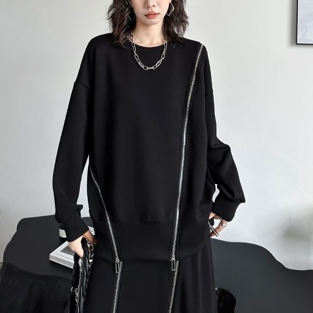 イレギュラーに施された3本のジップライン飾りがアクセントになった、ラウンドネックのスウェットシャツです。ブラックにシルバーのジップがクールな、何にでも合わせやすいカジュアルアイテムです。