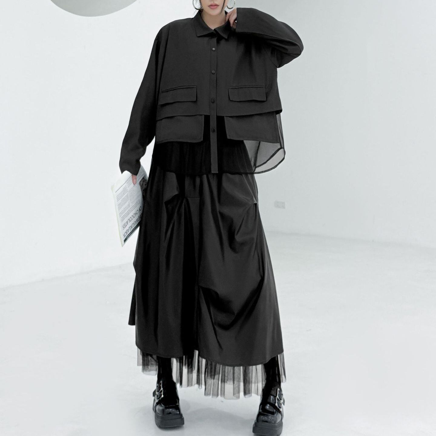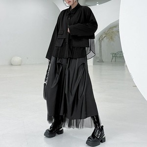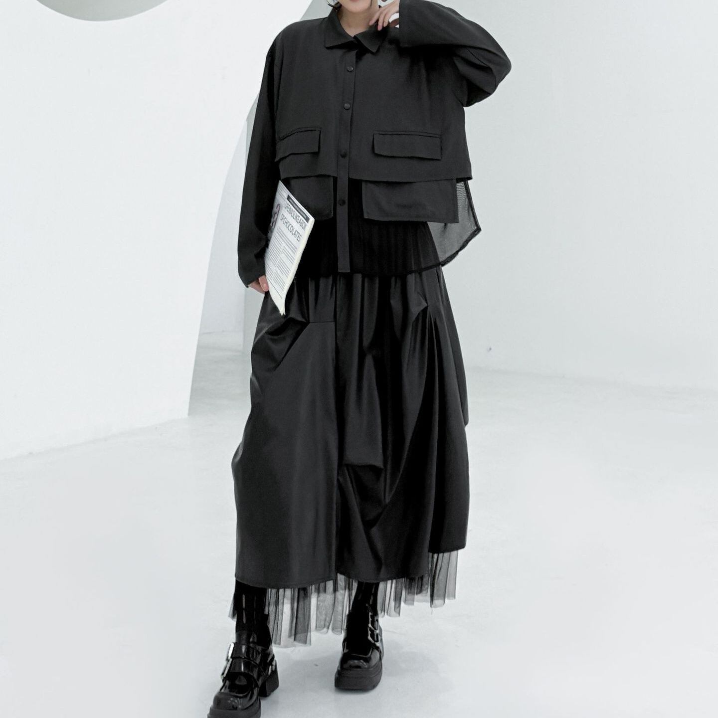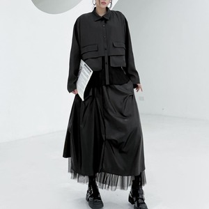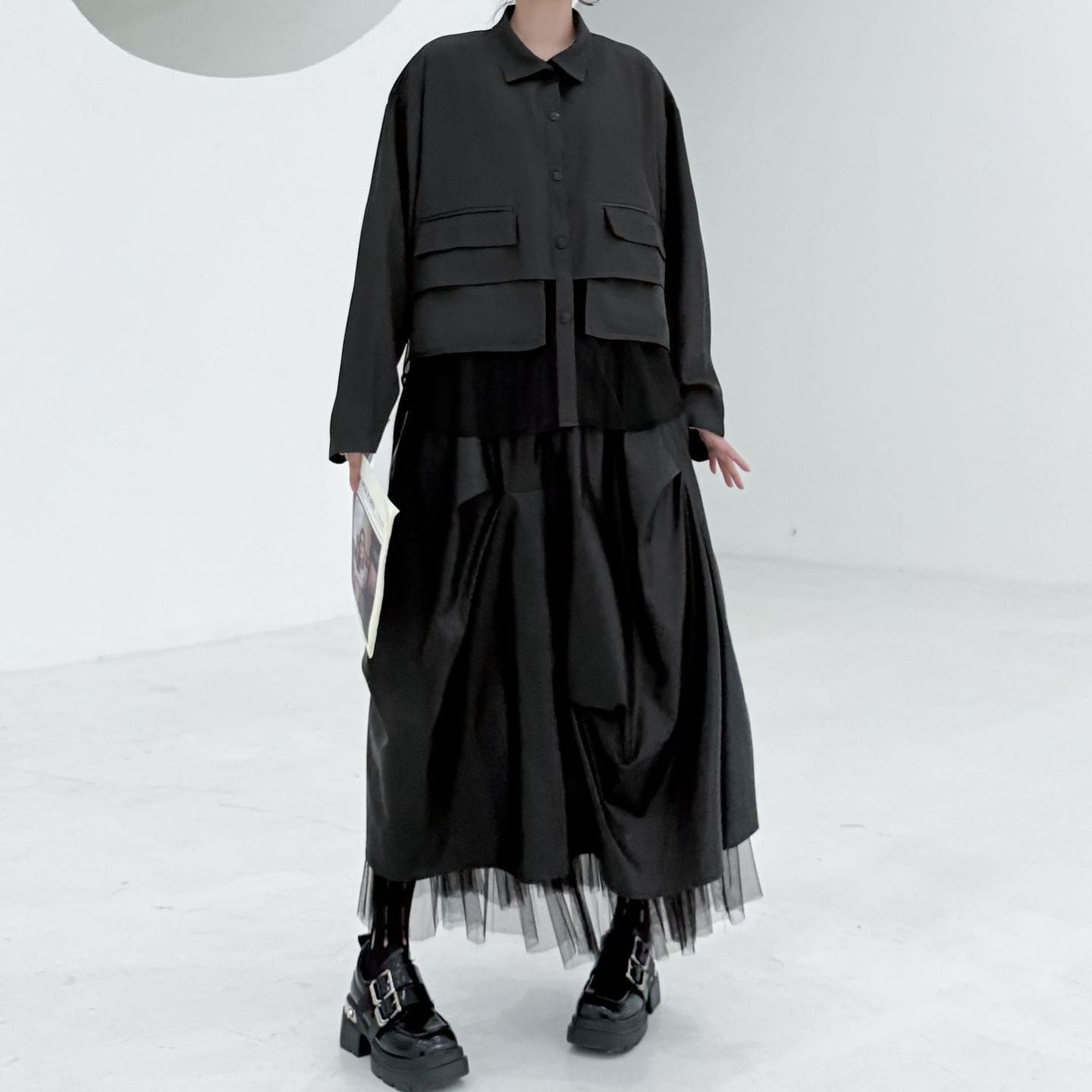 デザインポケットやメッシュの裾がお洒落な、ポロ襟・長袖・ラウンドカットのシャツジャケットです。単色で何にでも合わせやすい、デザインにこだわりを感じるモードな印象のアイテムです。ブラックとダークグレーの2色から選べます。
