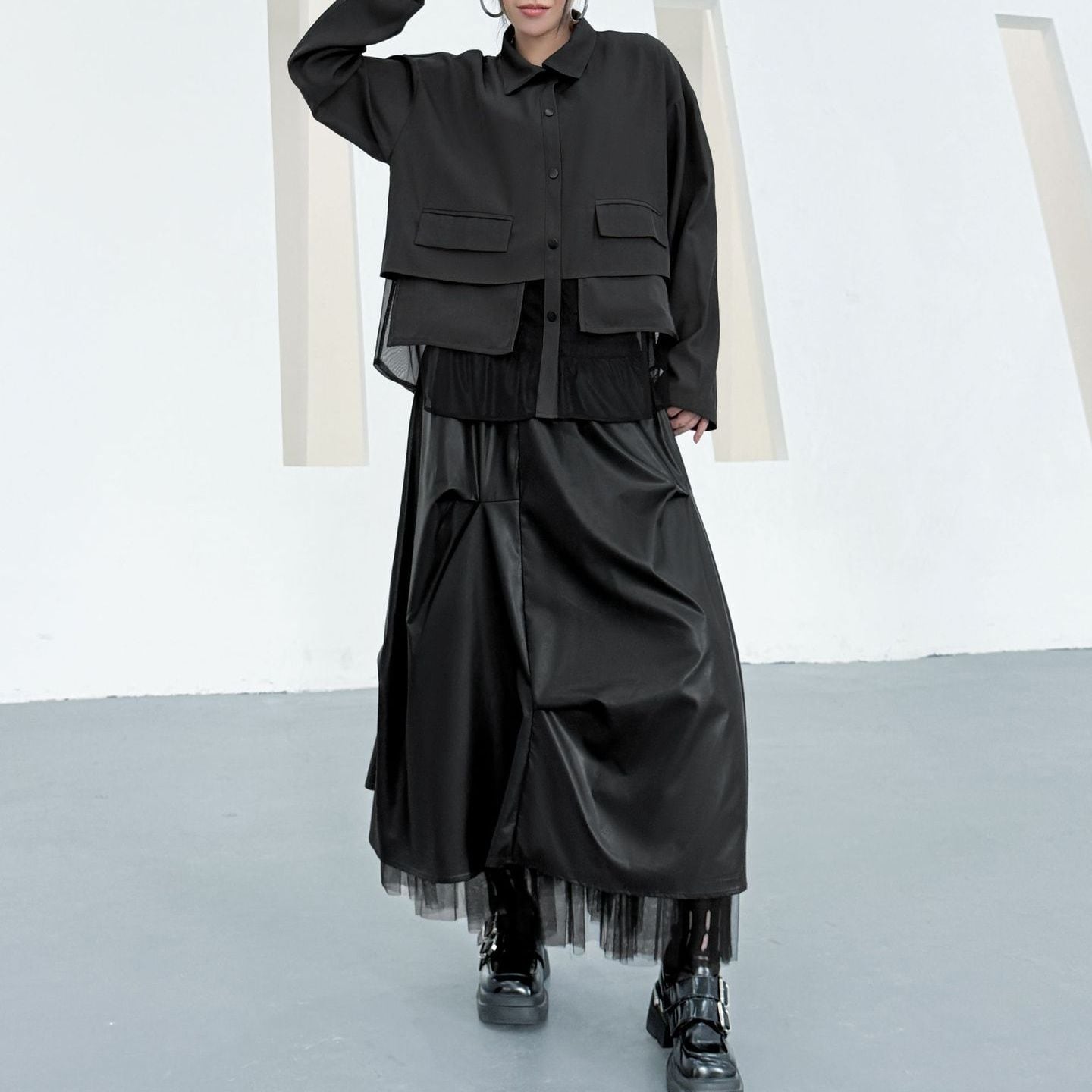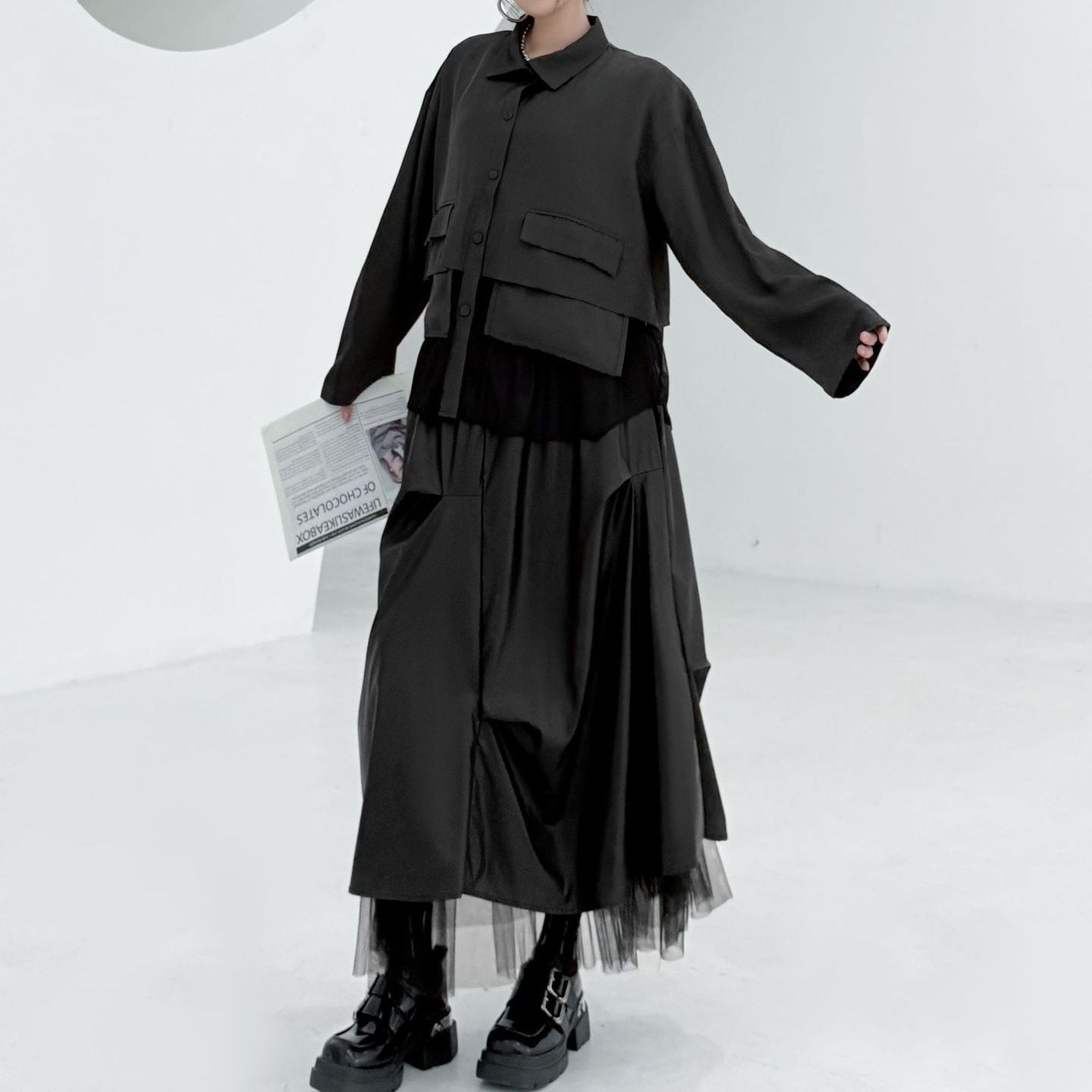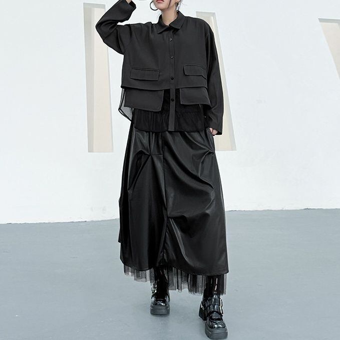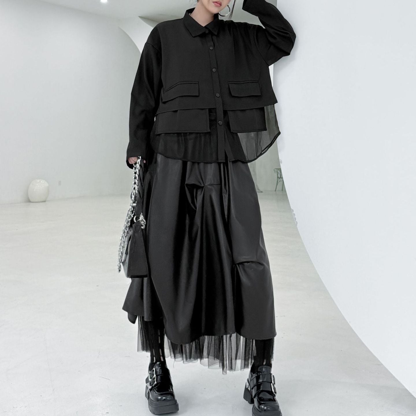 デザインポケットやメッシュの裾がお洒落な、ポロ襟・長袖・ラウンドカットのシャツジャケットです。単色で何にでも合わせやすい、デザインにこだわりを感じるモードな印象のアイテムです。ブラックとダークグレーの2色から選べます。