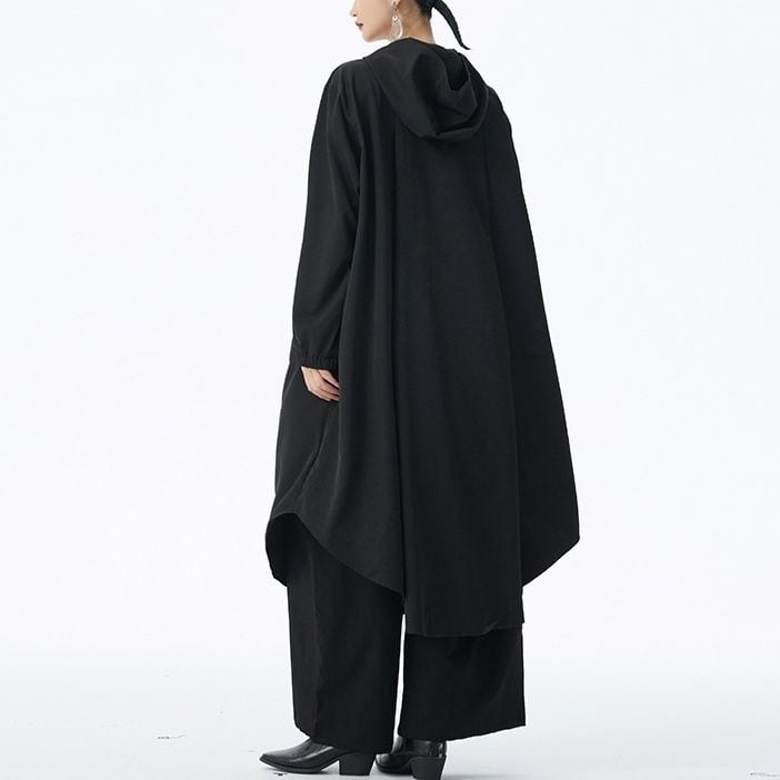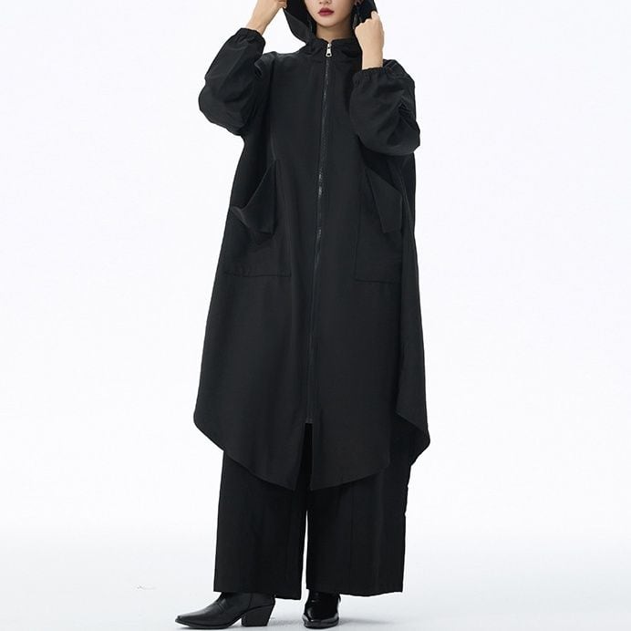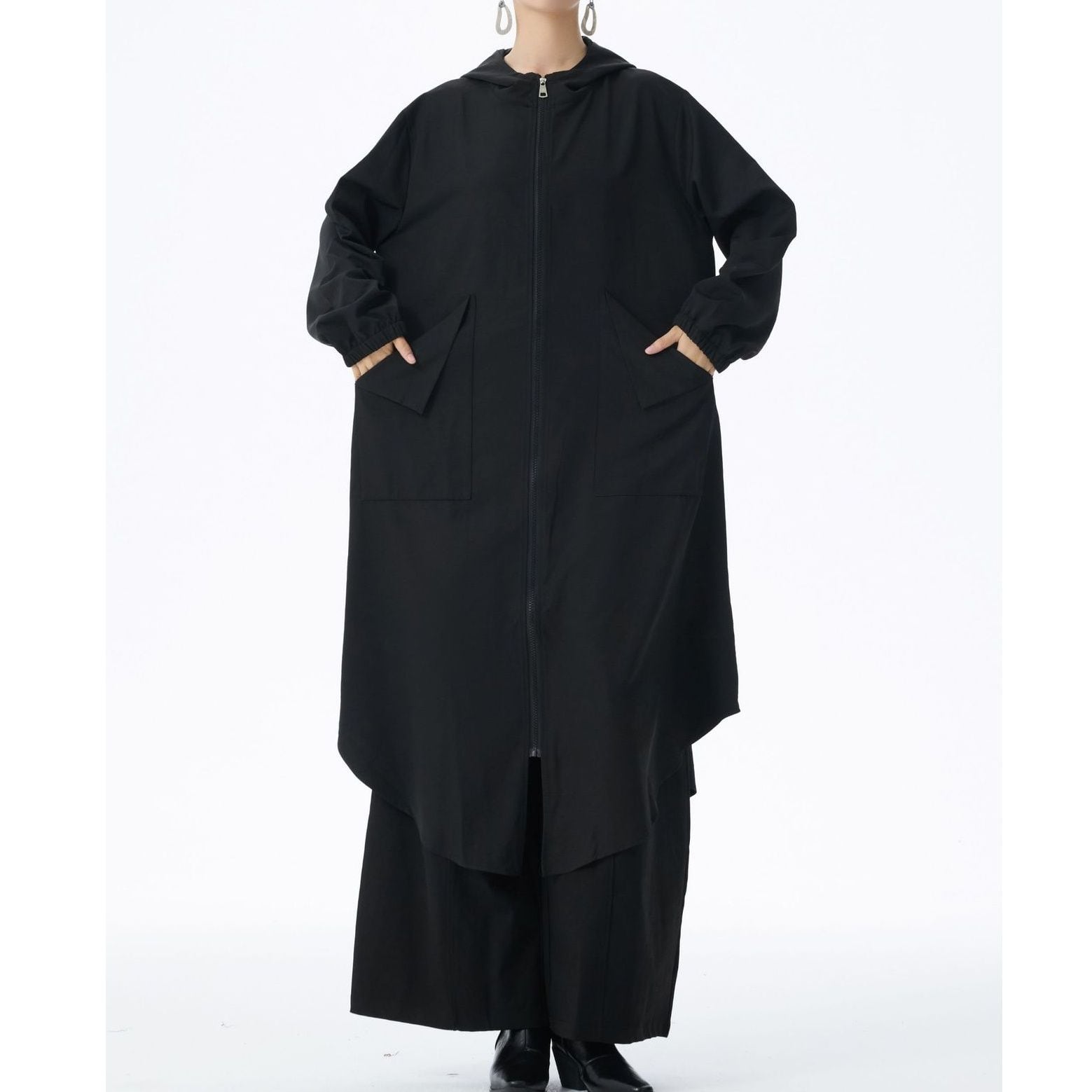 SOLID HOODED FULLZIP LONG WINDBREAKER COAT 2colors M-14869