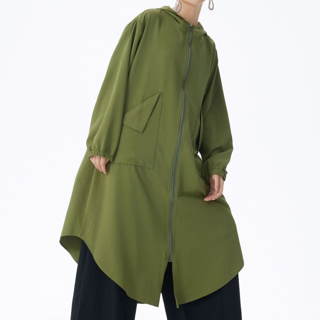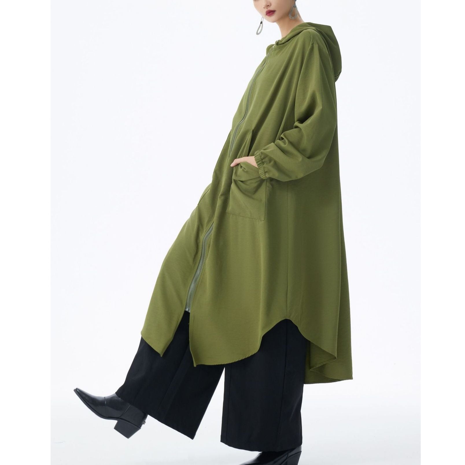 ドッグイヤーのような大きなポケットが付いた、フード付き・長袖・膝下丈のウインドブレーカーコートです。袖口がゴム加工されたラウンドカットのAラインで、フルジップとシンプルなデザインが使いやすいアイテムです。ブラックとアーミーグリーンの2色から選べます。