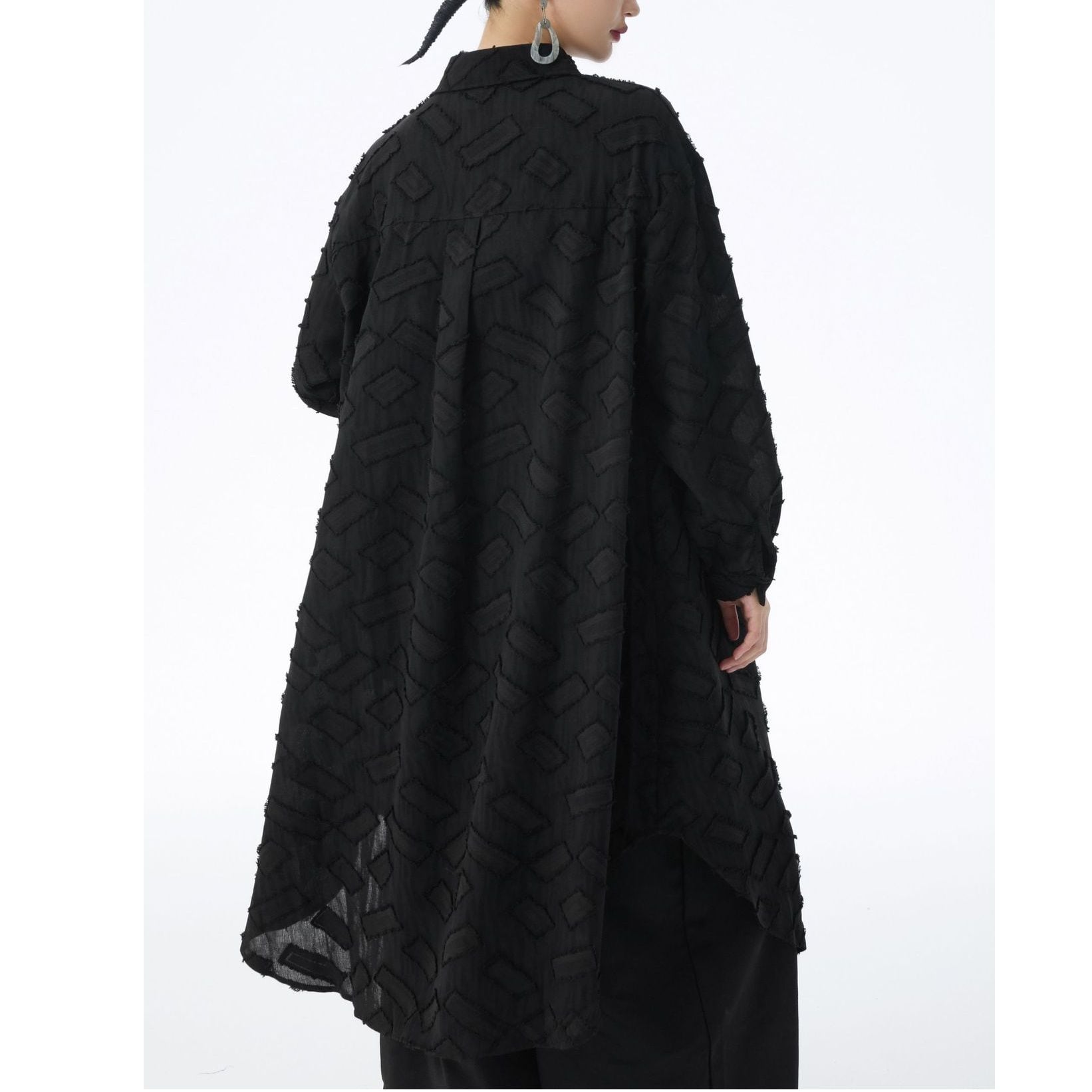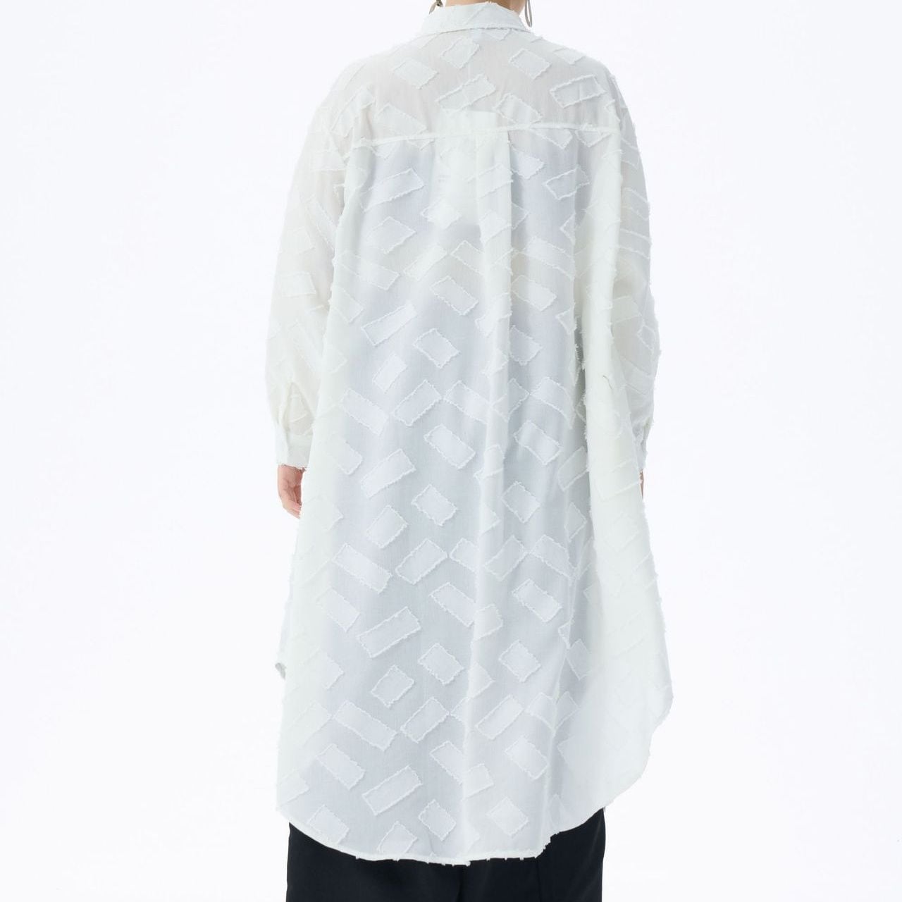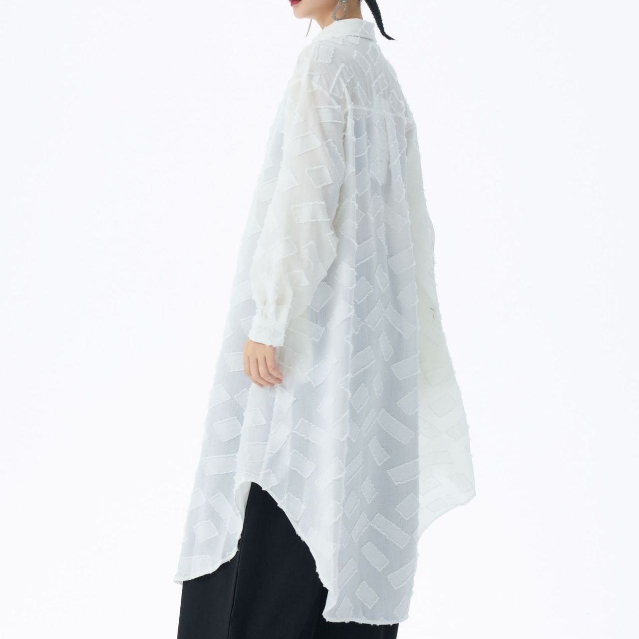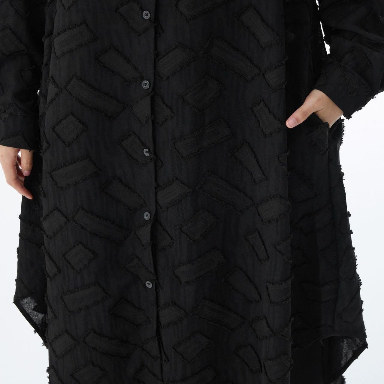 立体的な長方形の柄生地がお洒落な、ポロ襟・長袖・ラウンドカットのロングラインシャツです。ワンピースやシャツジャケットとしても使える、単色でコーディネートしやすいアイテムです。ブラックとホワイトの2色から選べます。