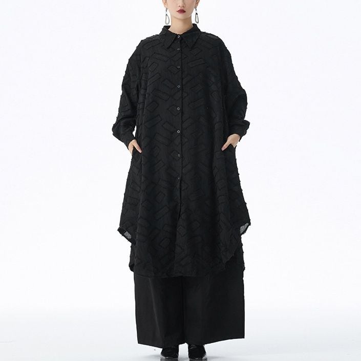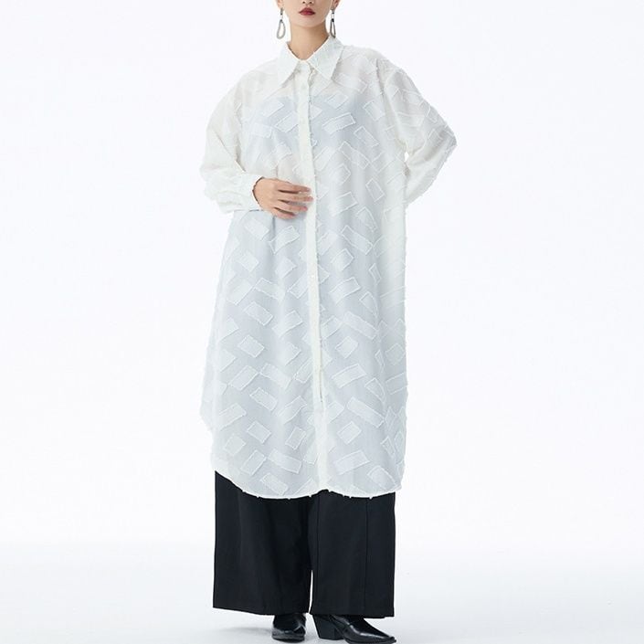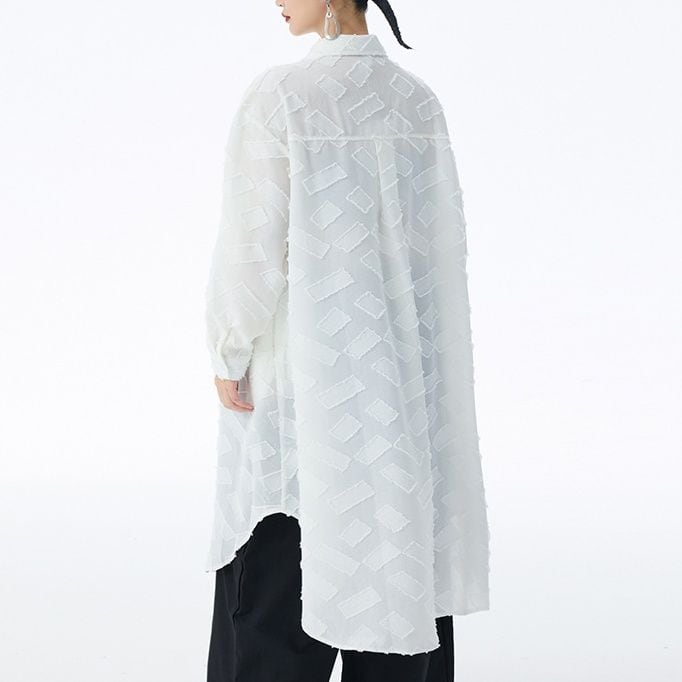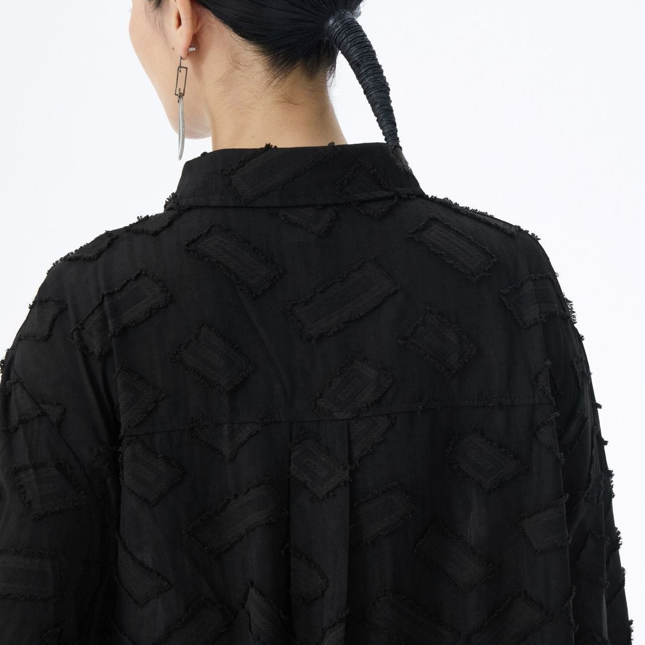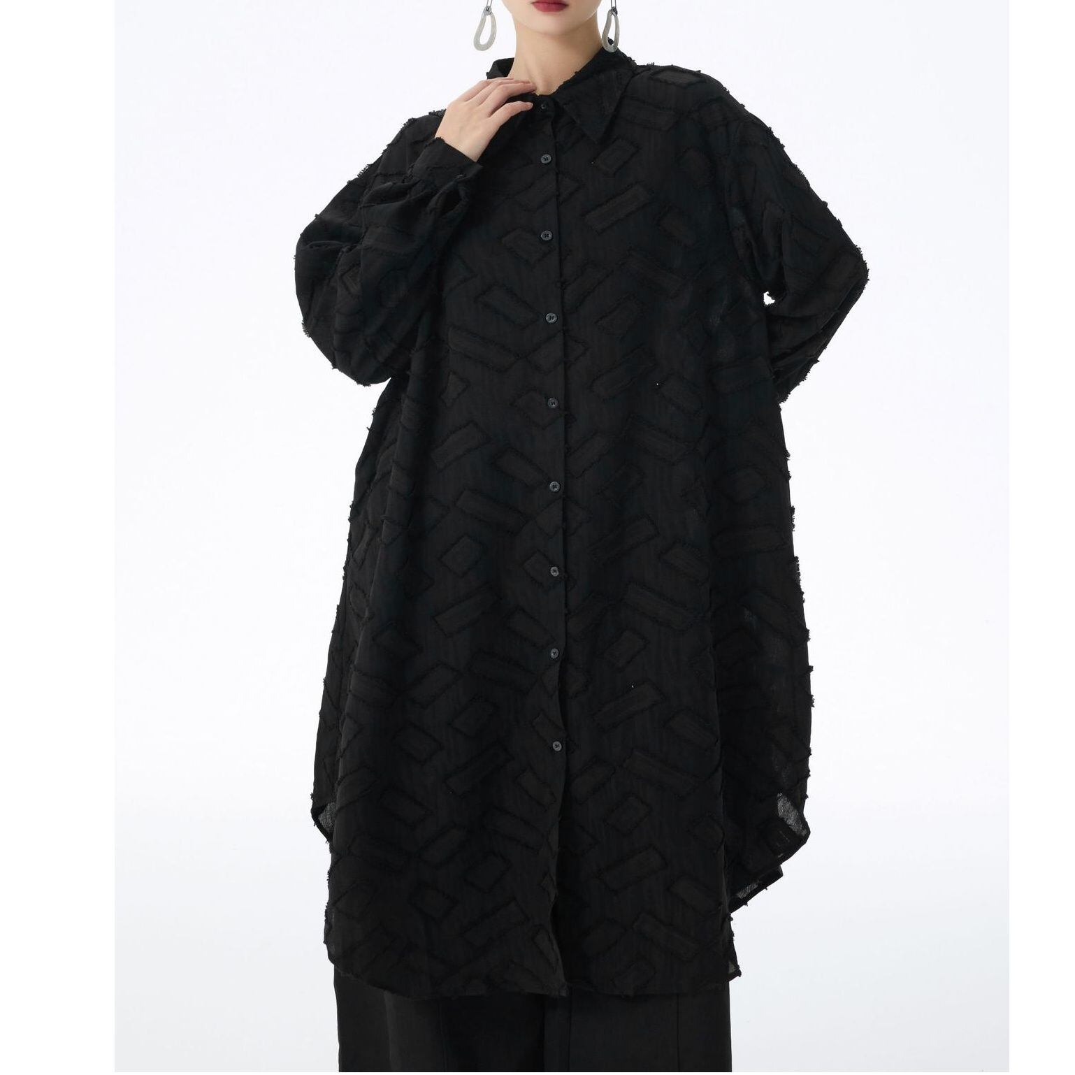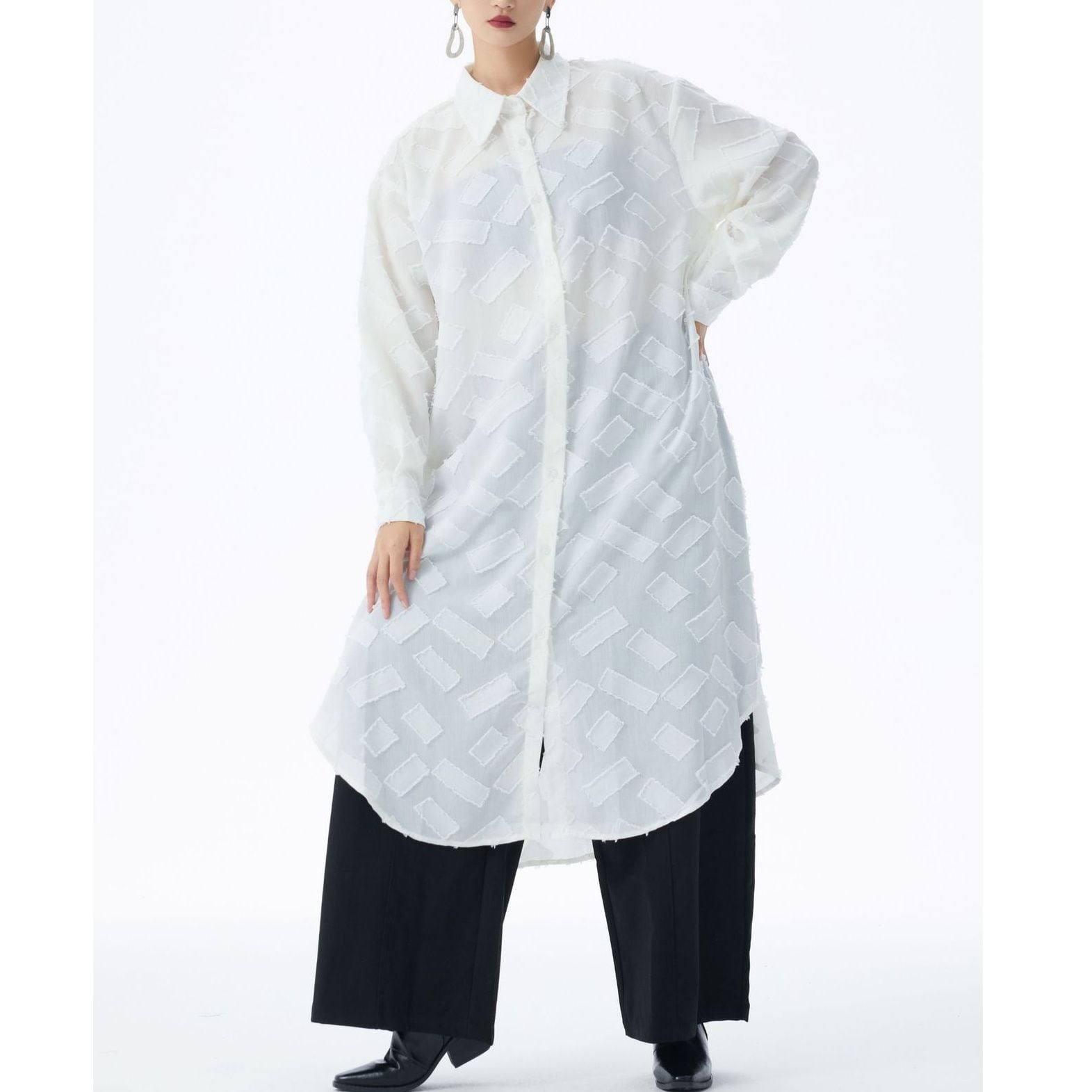 立体的な長方形の柄生地がお洒落な、ポロ襟・長袖・ラウンドカットのロングラインシャツです。ワンピースやシャツジャケットとしても使える、単色でコーディネートしやすいアイテムです。ブラックとホワイトの2色から選べます。