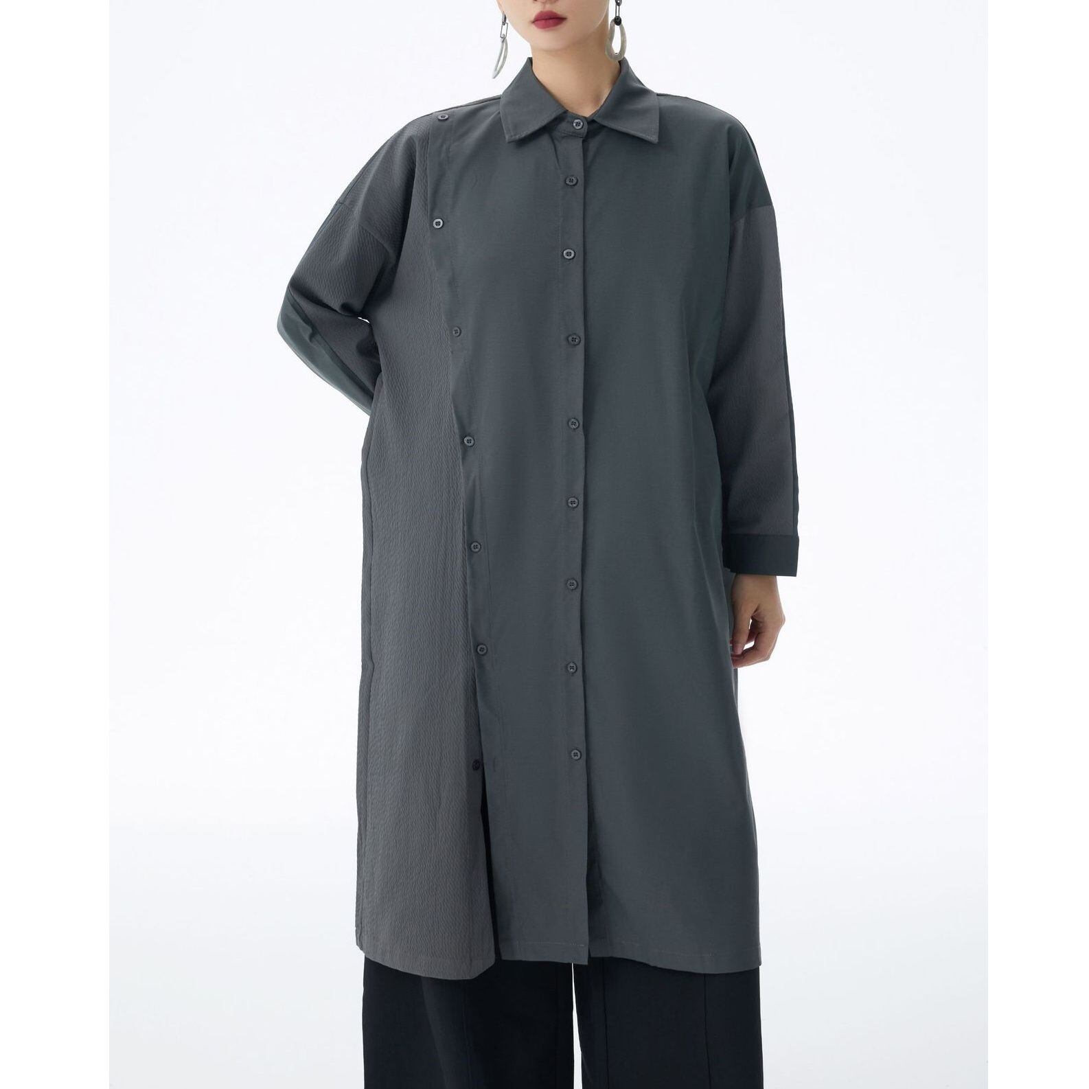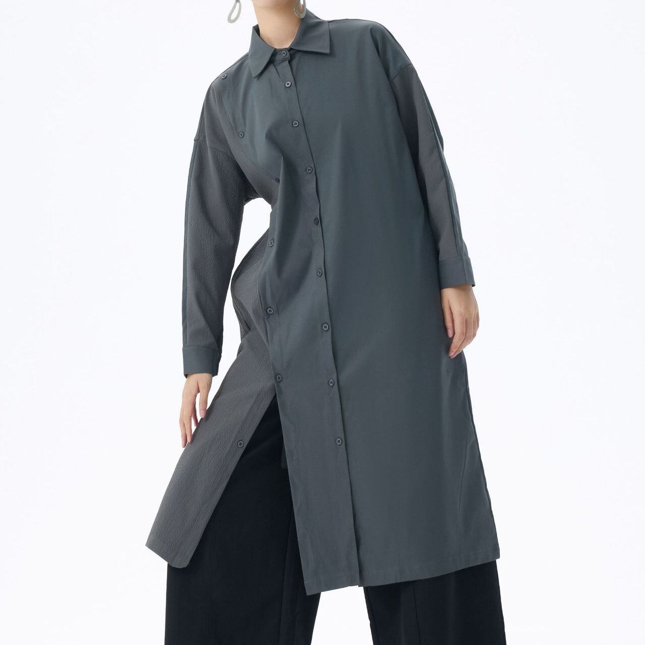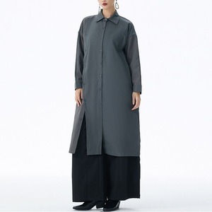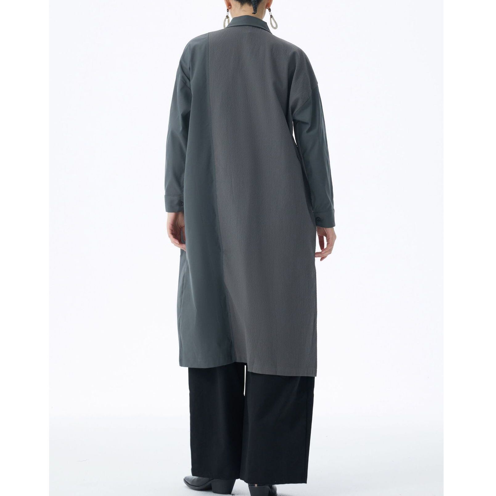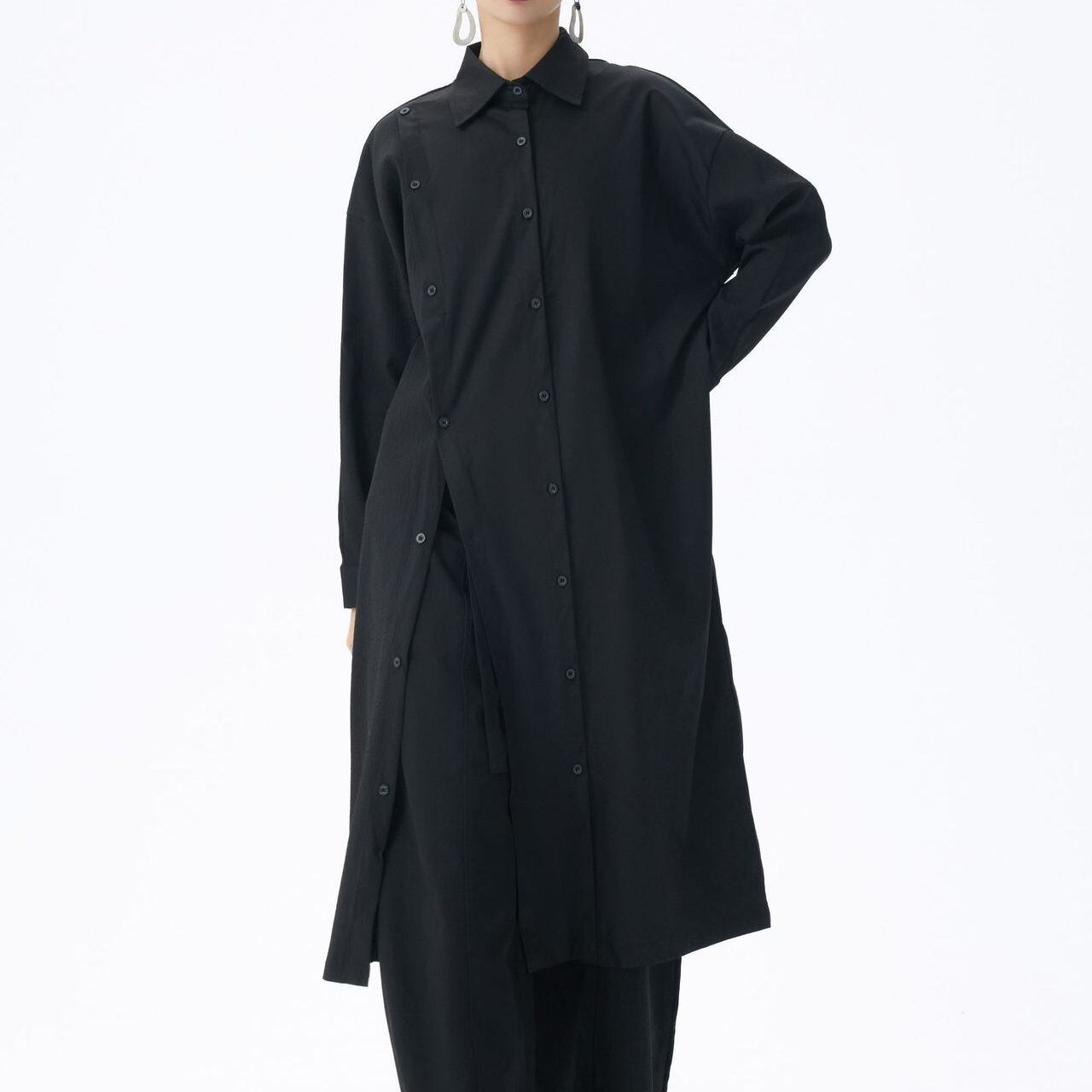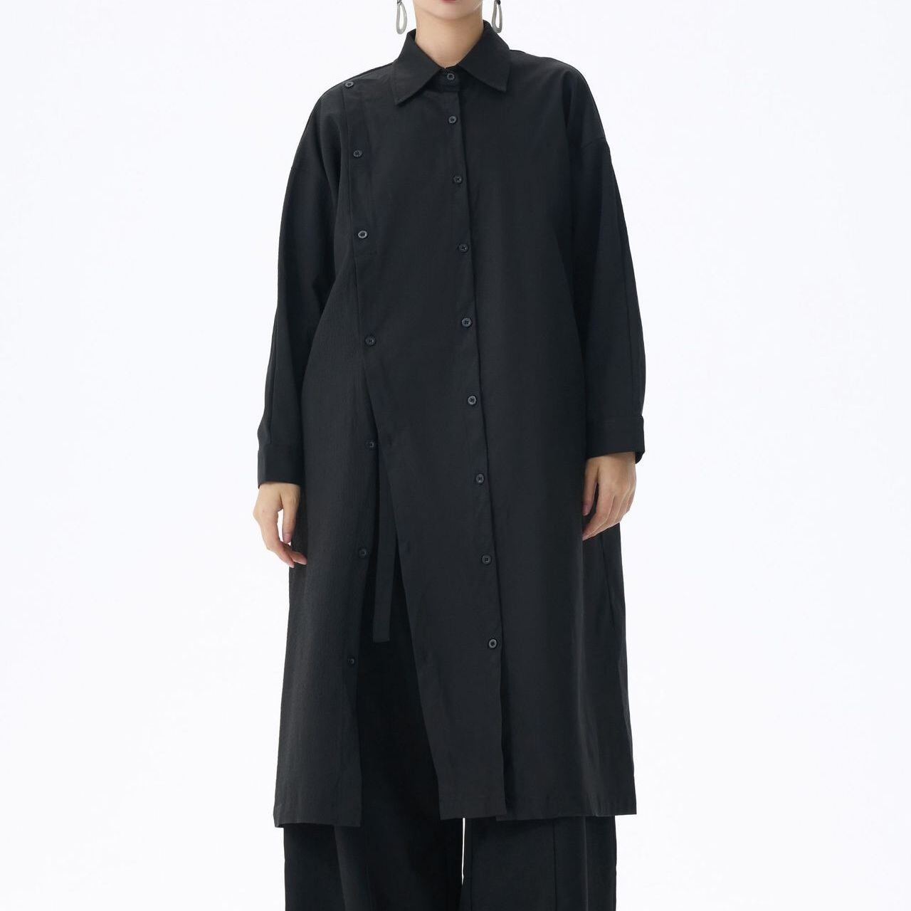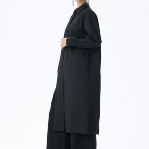 2本のボタンラインデザインが特徴的な、ポロ襟・長袖・膝下丈のロングラインシャツです。単色のすっきりとしたシルエットがクールな、シャツワンピースとしても使えるアイテムです。ブラックとグレーの2色から選べます。