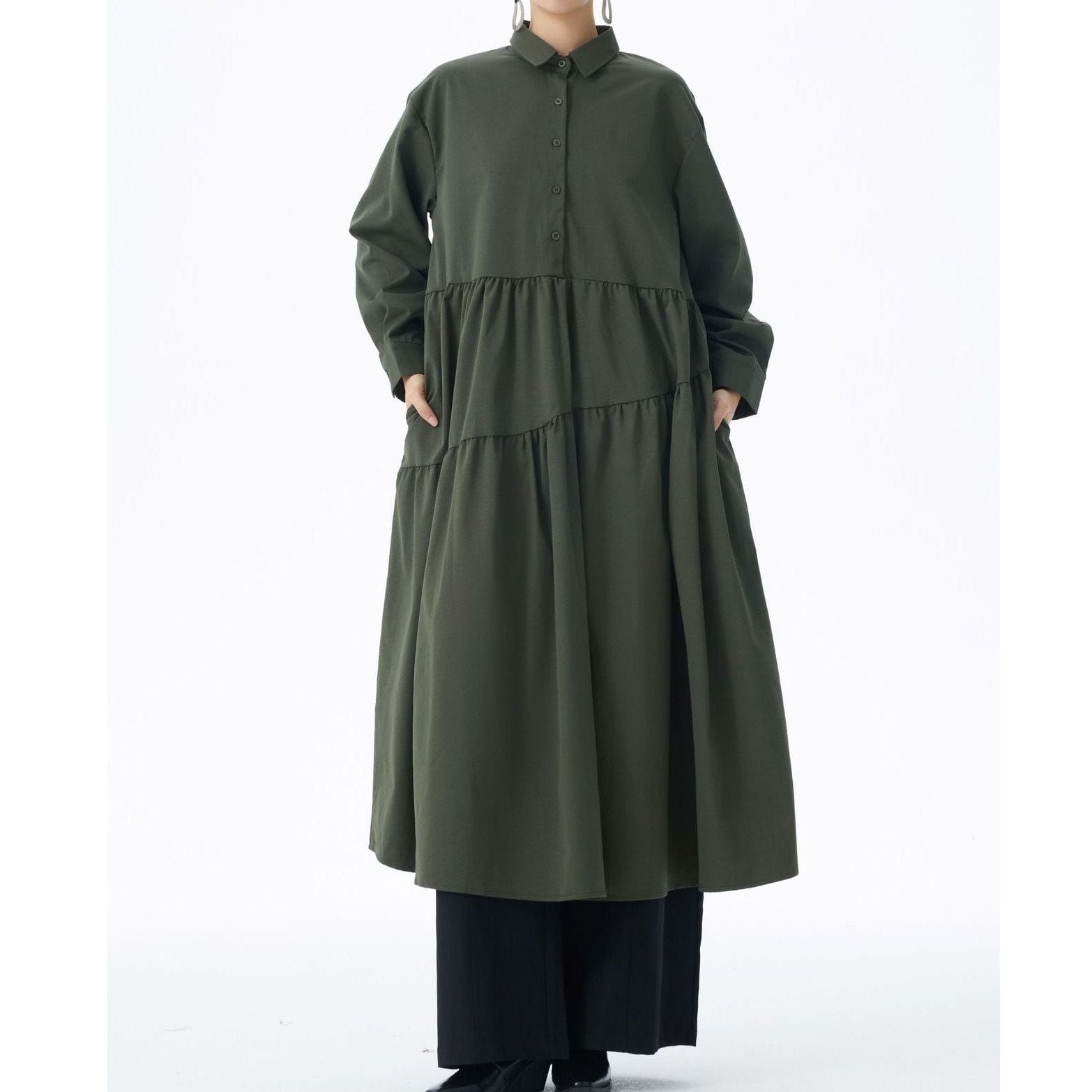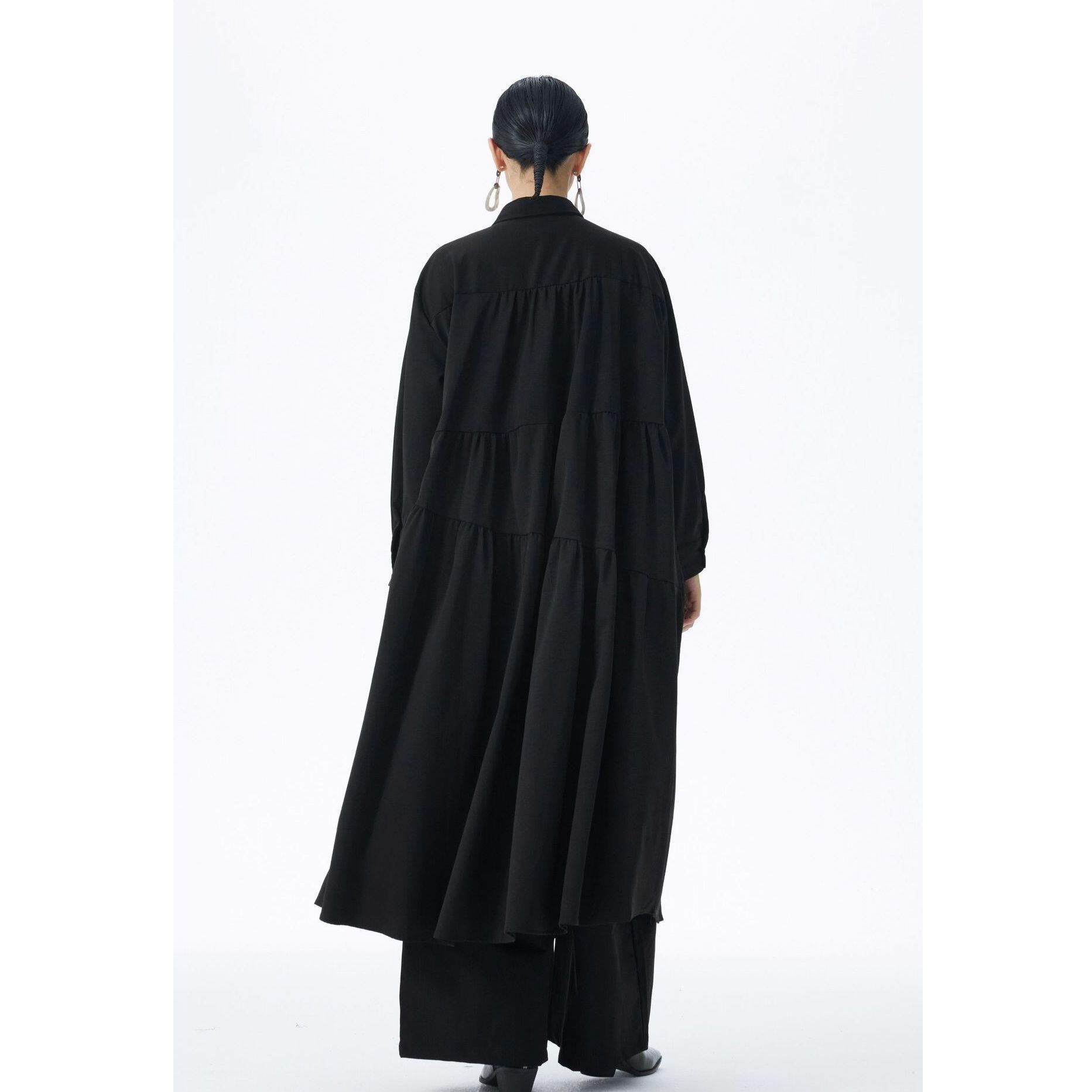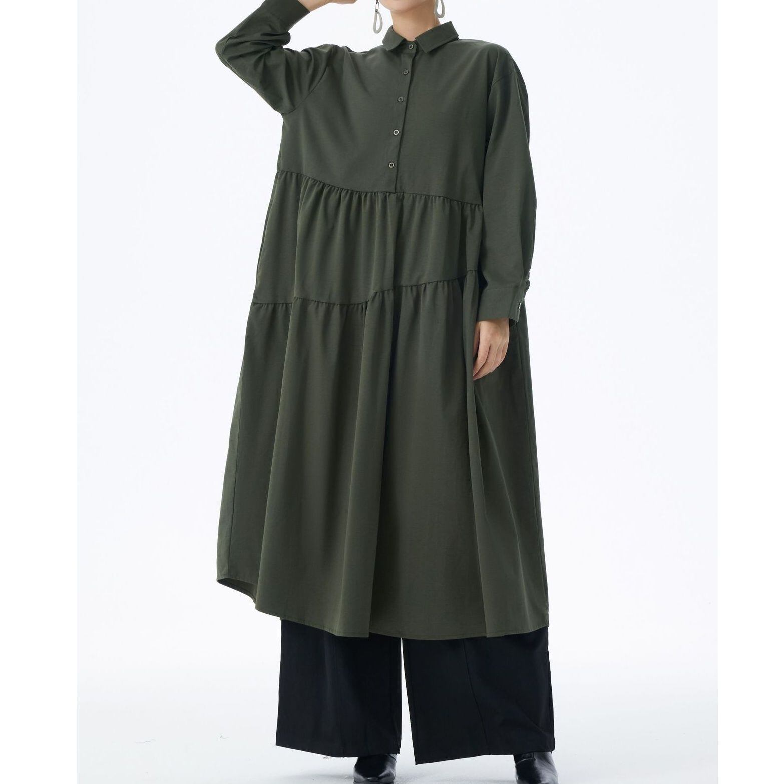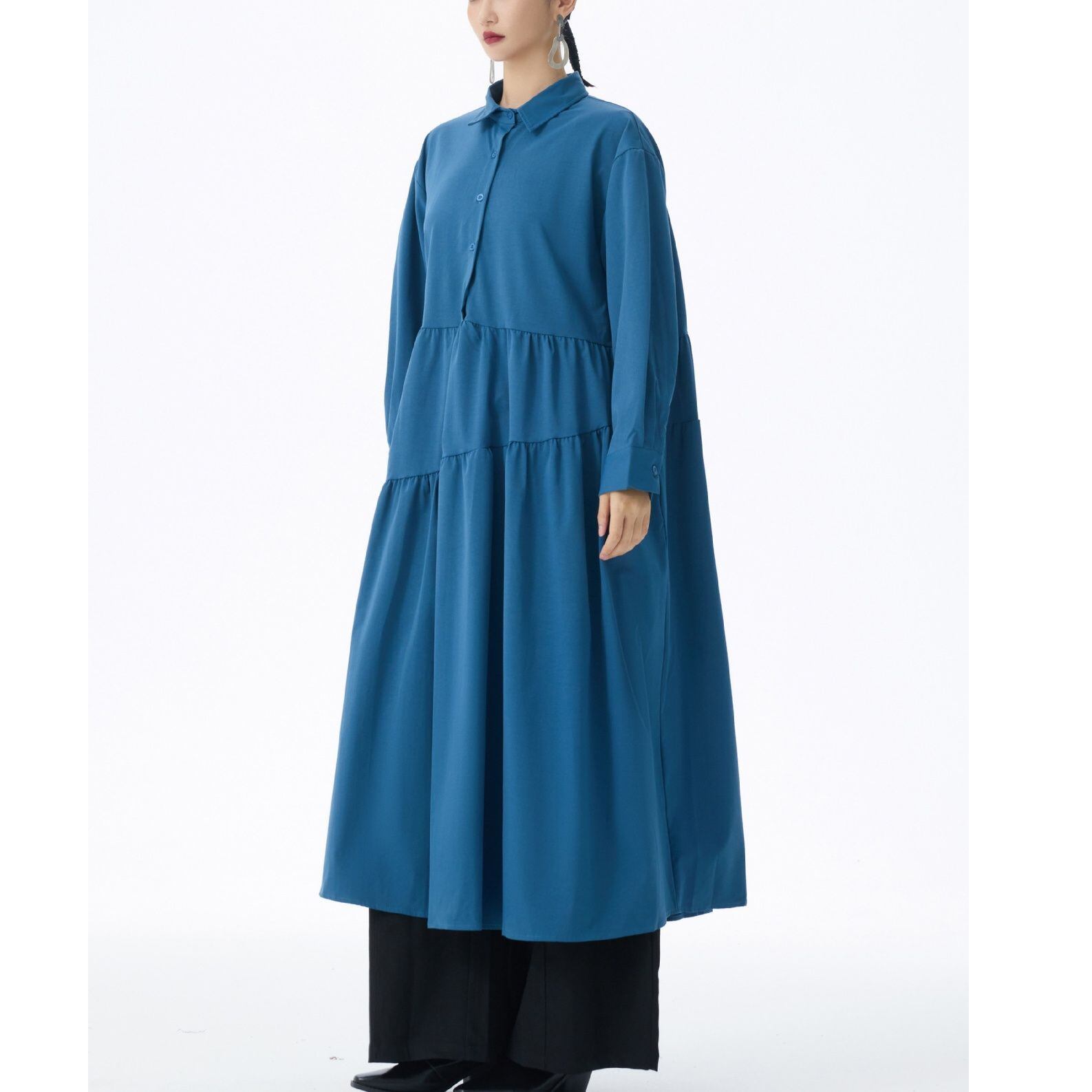 アシンメトリックなティアードデザインがお洒落な、ポロ襟・ハーフボタン・長袖・膝下丈のシャツワンピースです。ふんわりとしたAラインのシルエットが魅力的な、単色で小物アレンジが利くアイテムです。ブルー・ブラック・アーミーグリーンの3色から選べます。