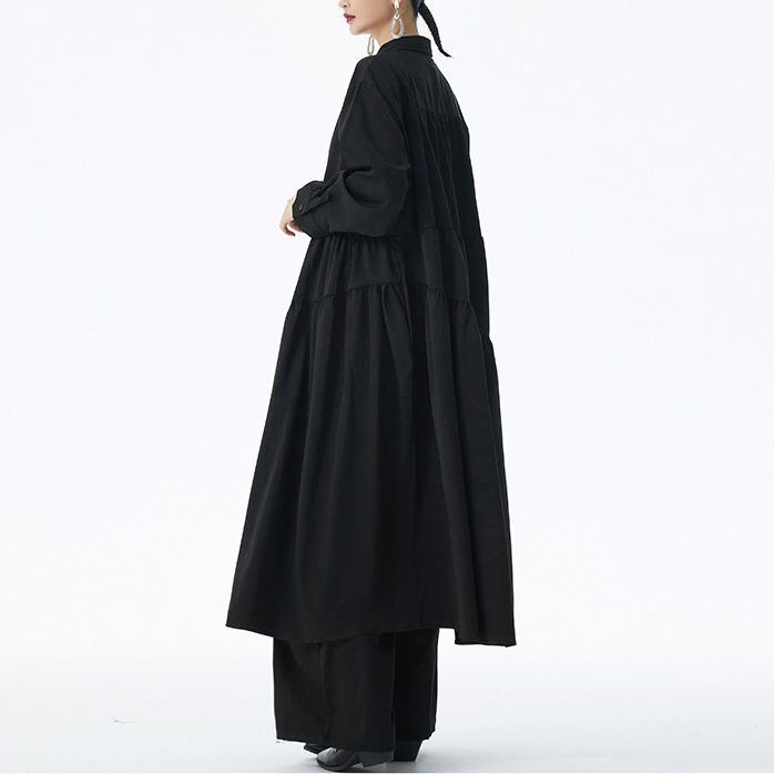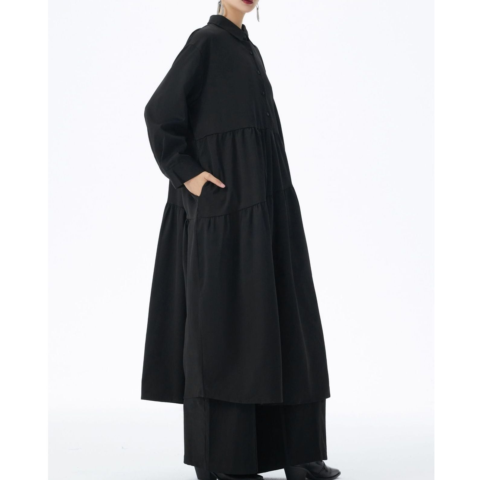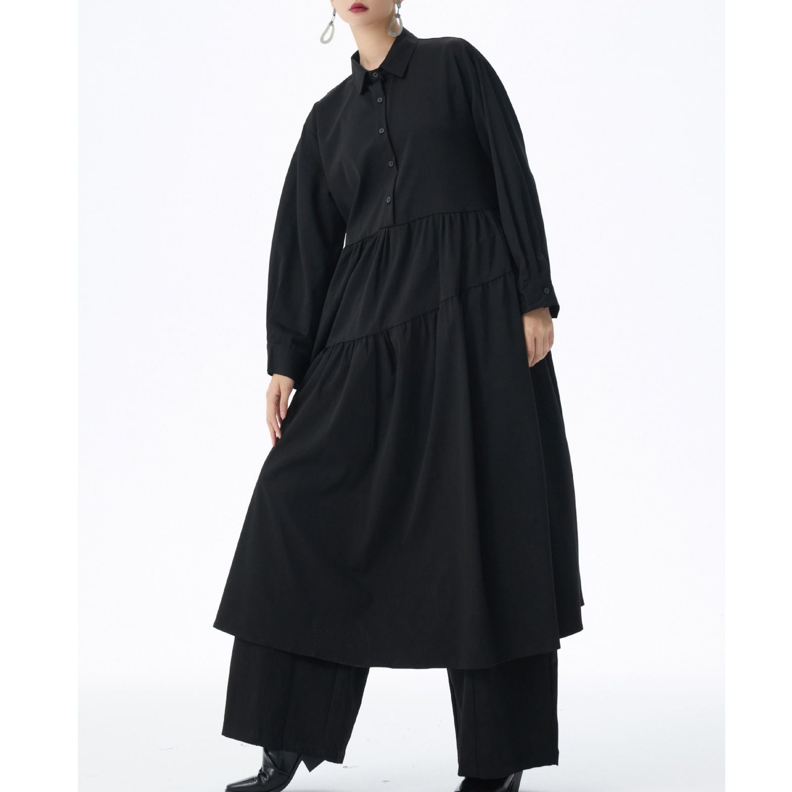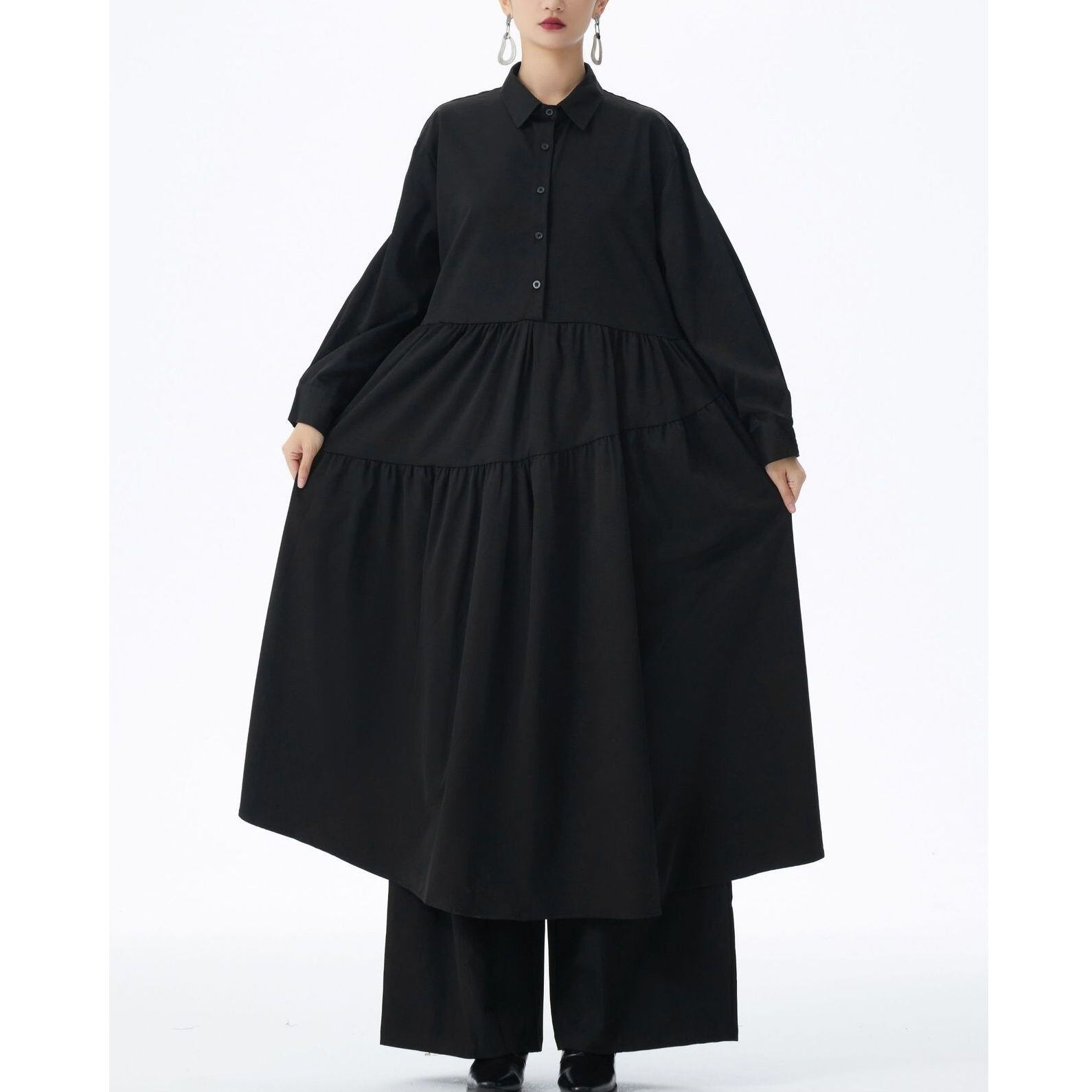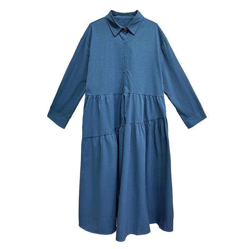 アシンメトリックなティアードデザインがお洒落な、ポロ襟・ハーフボタン・長袖・膝下丈のシャツワンピースです。ふんわりとしたAラインのシルエットが魅力的な、単色で小物アレンジが利くアイテムです。ブルー・ブラック・アーミーグリーンの3色から選べます。