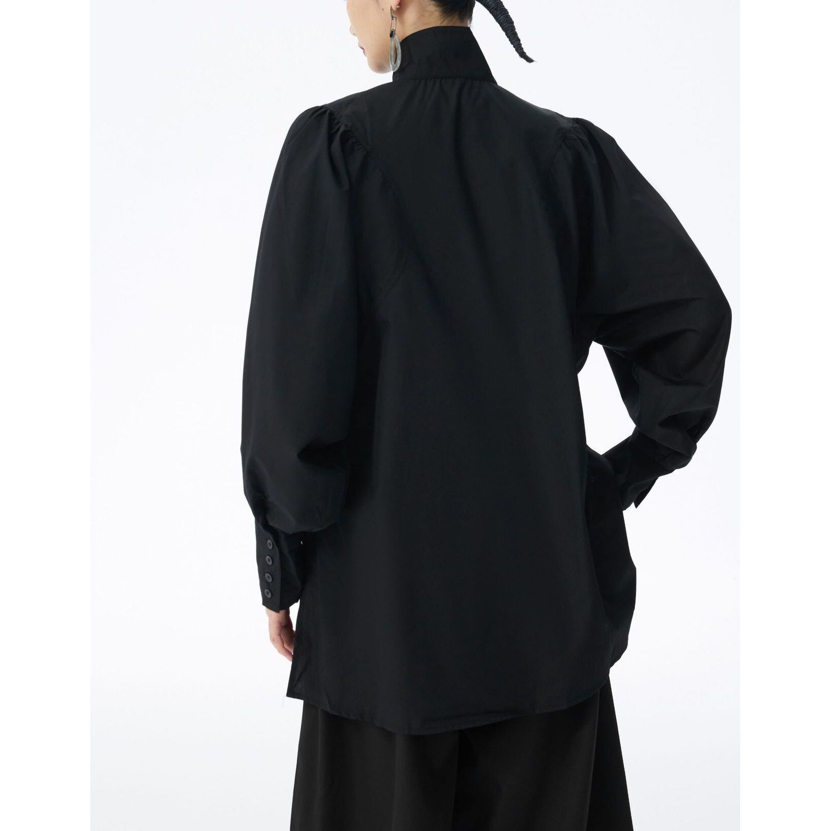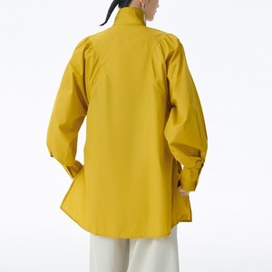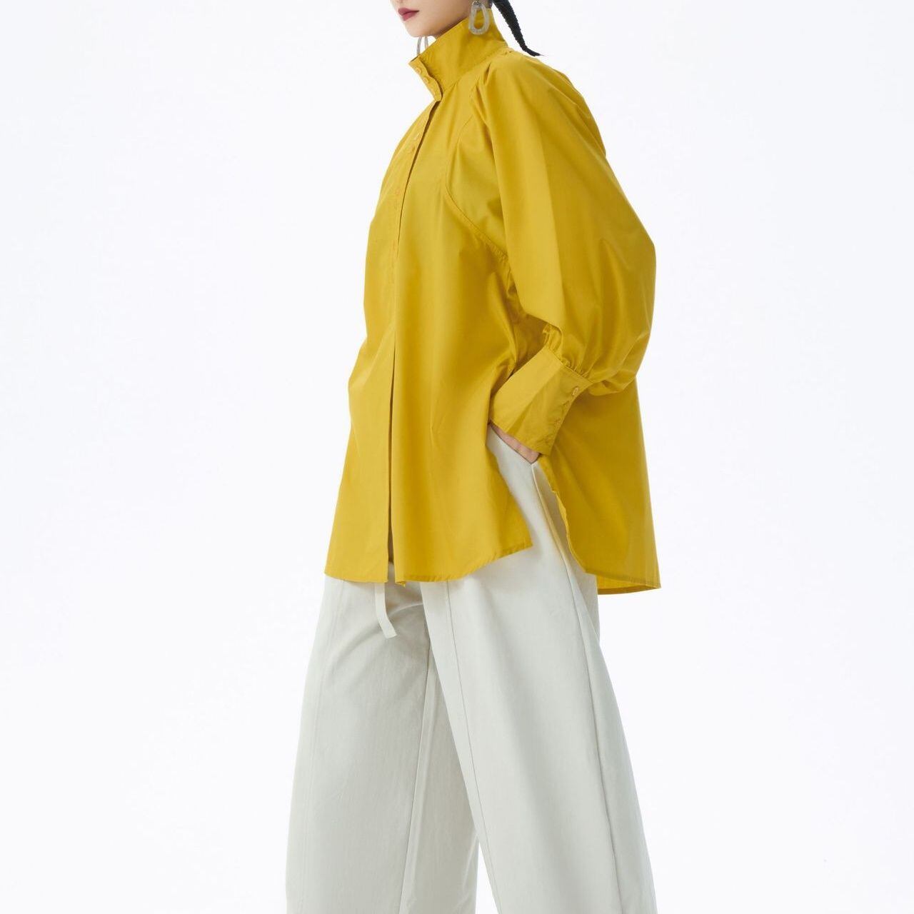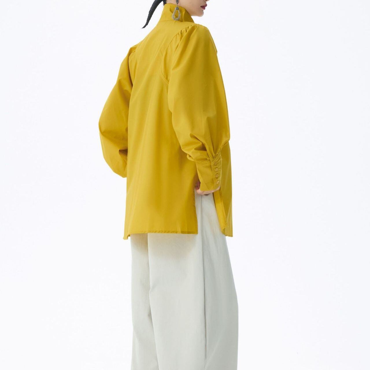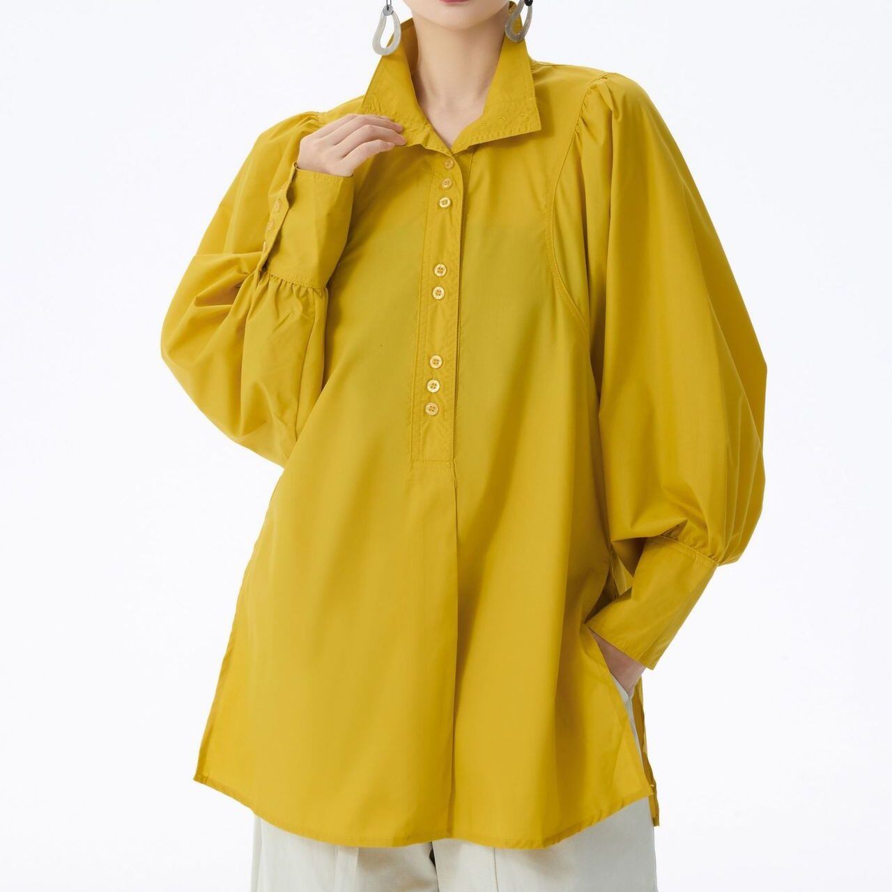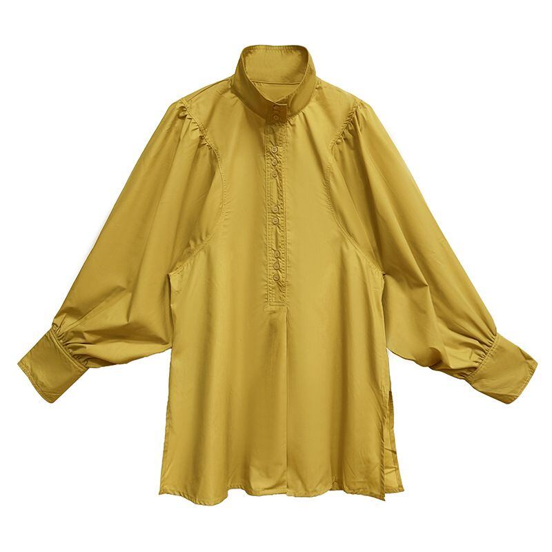 美しいランタンスリーブのシルエットが目を惹く、ハイネック・長袖・チュニック丈のデザインシャツです。ボタンの並びやサイドのスリットなど、バランスのいいデザインでモードな印象のお洒落アイテムです。ブラック・ホワイト・イエローの3色から選べます。