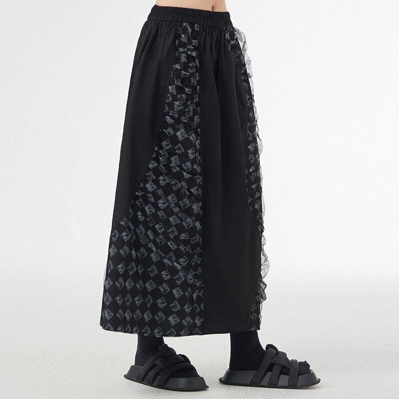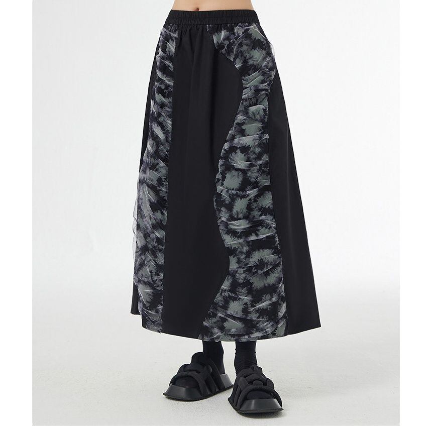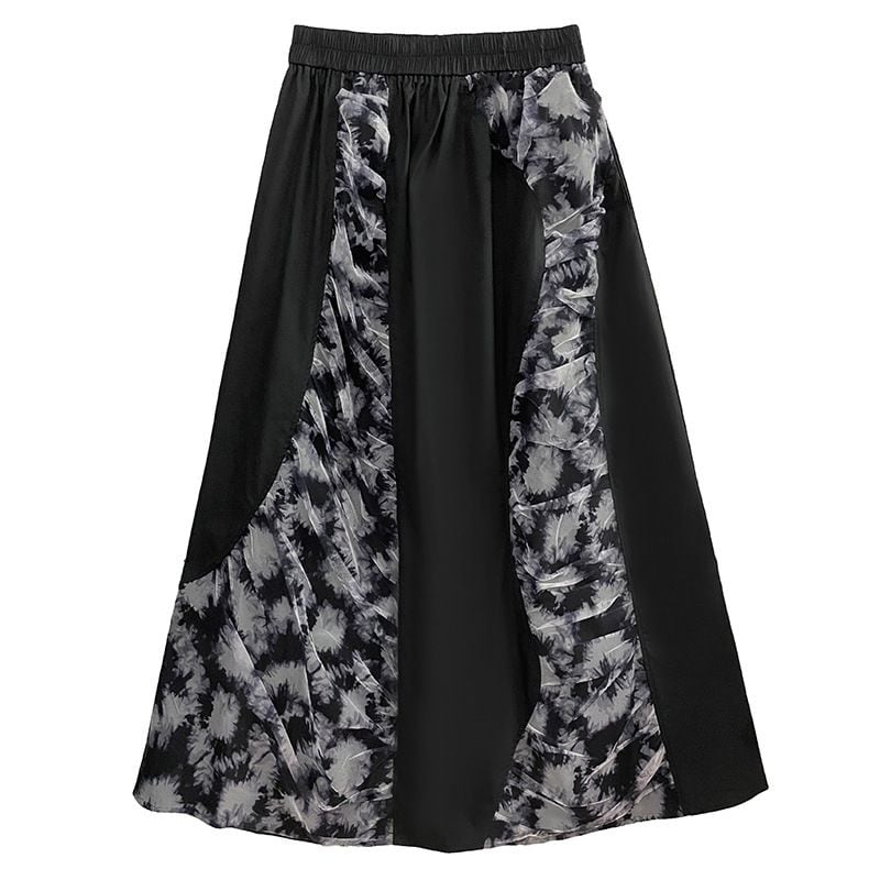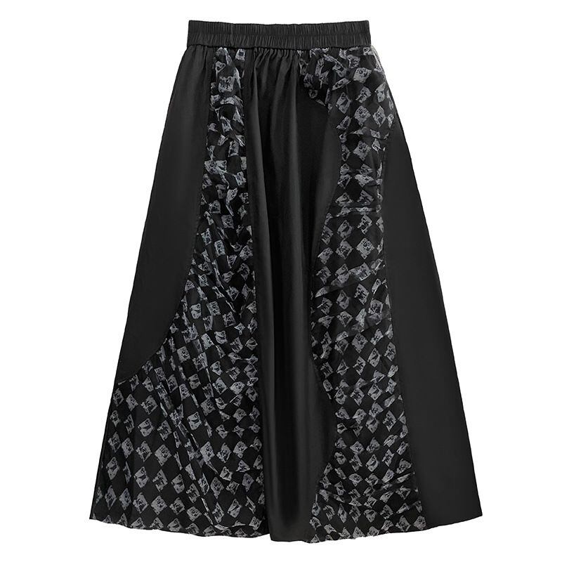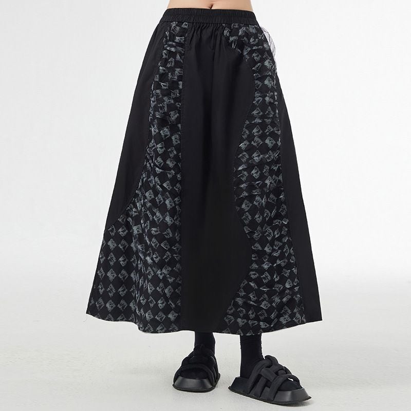 立体的な柄生地のコーラージュスティッチがお洒落な、Aライン・ロング丈のデザインスカートです。ウエストはゴムなので、着脱が簡単で履き心地が良いです。ブラックベースでクールな印象の、合わせやすいアイテムです。柄は2種類から選べます。