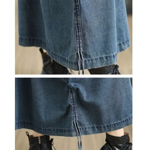 サイドの大きな立体ポケットがキュートな、Aライン・ミドル丈・デニム地のストラップジャンパースカートです。ストラップはバックルが付いて長さを調節できます。ウエストやサイドのドローストリングでシルエットをアレンジできる、レトロな印象のカジュアルアイテムです。