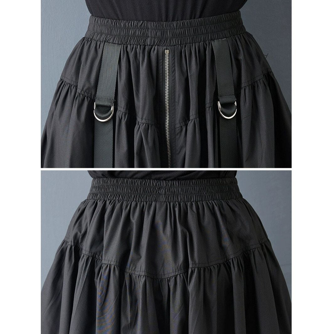 フルジップデザインやダブルDリングの付いたストラップ飾りがクールな、Aライン・ロング丈・デザインスカートです。ウエストはゴムなので、着脱が簡単で履き心地が良いです。ランタンのようなシルエットが魅力的な、ブラックでコーディネートしやすいアイテムです。