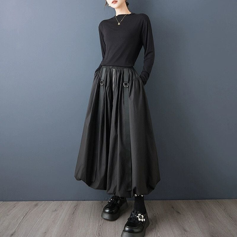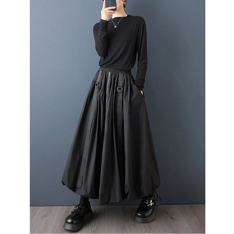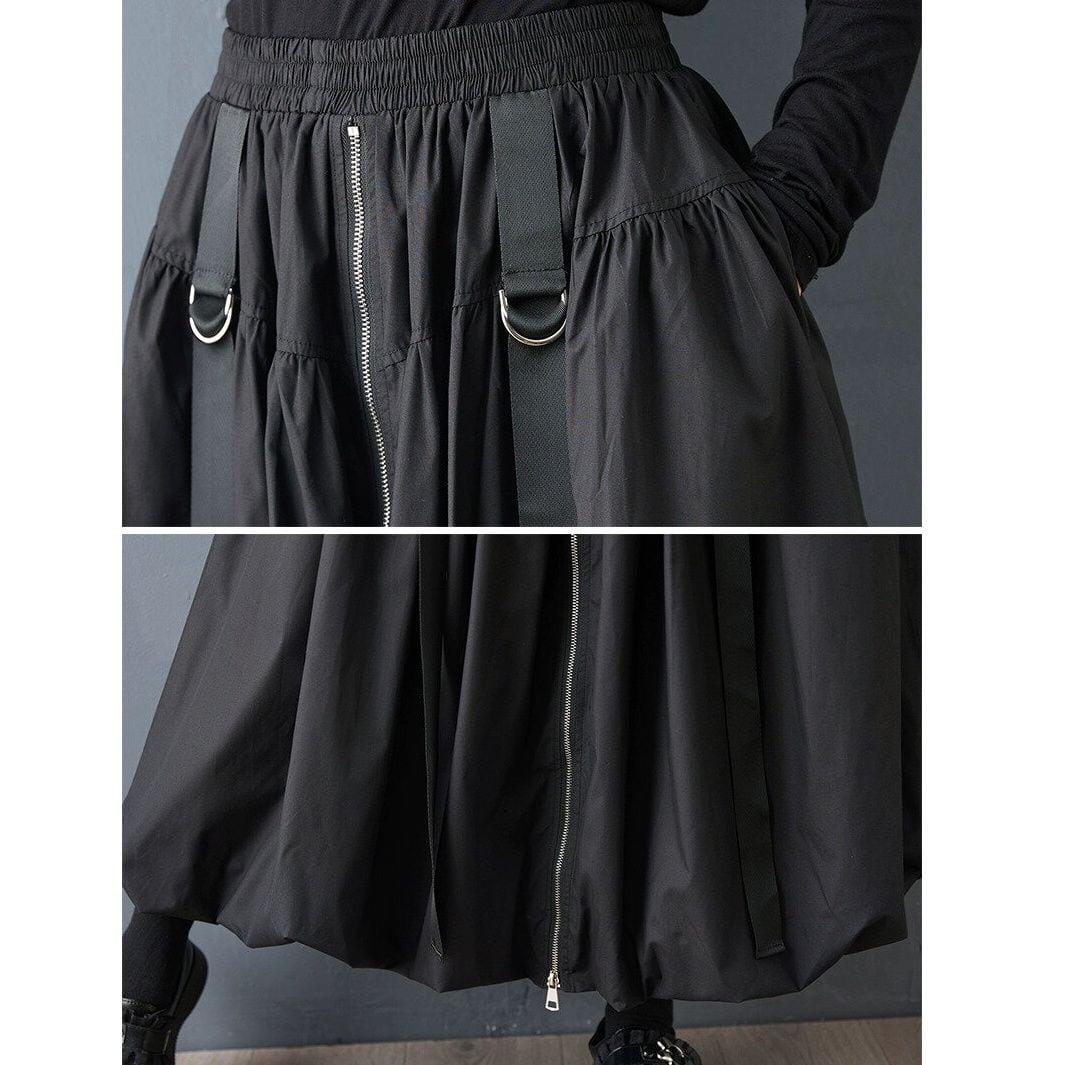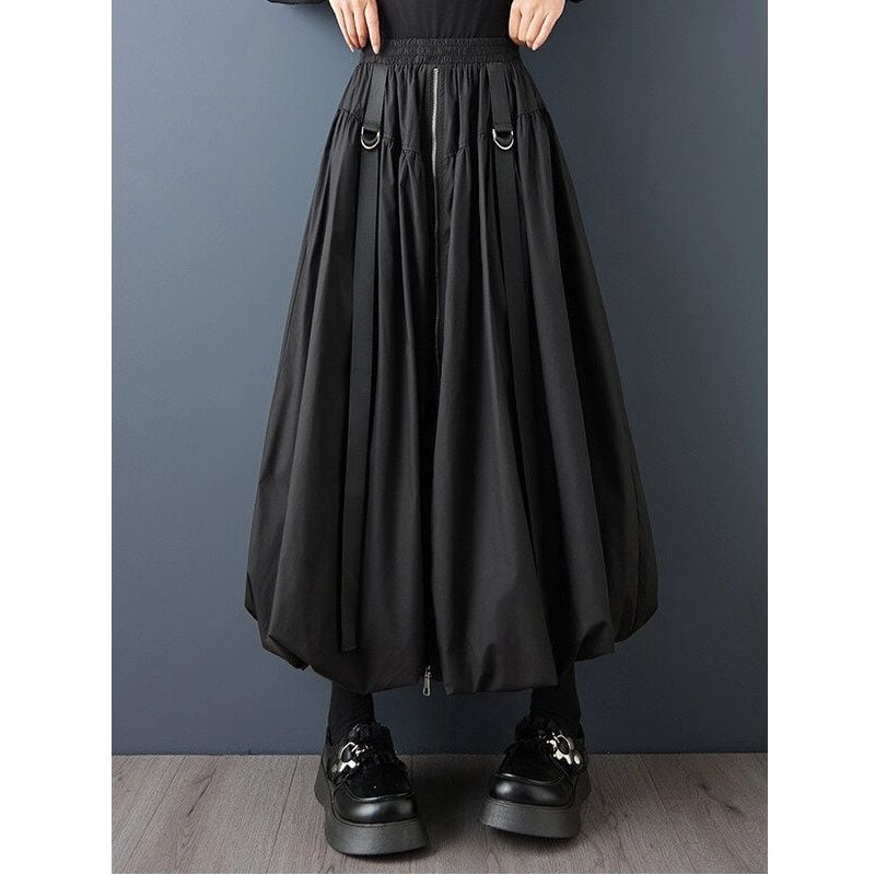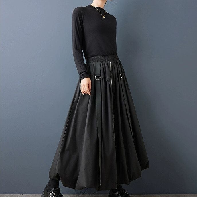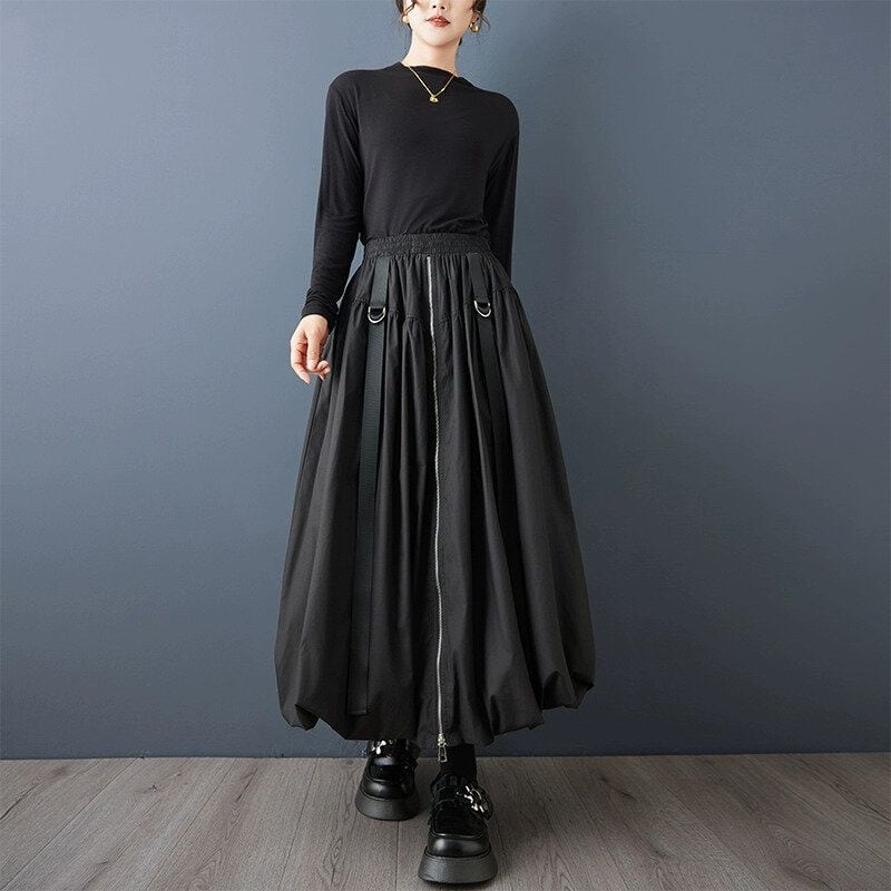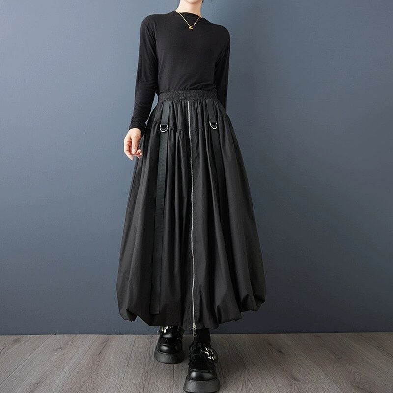 BLACK ELASTIC WAIST FULLZIP LONG LANTERN SKIRT 1color M-14904