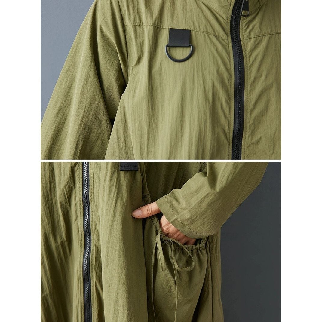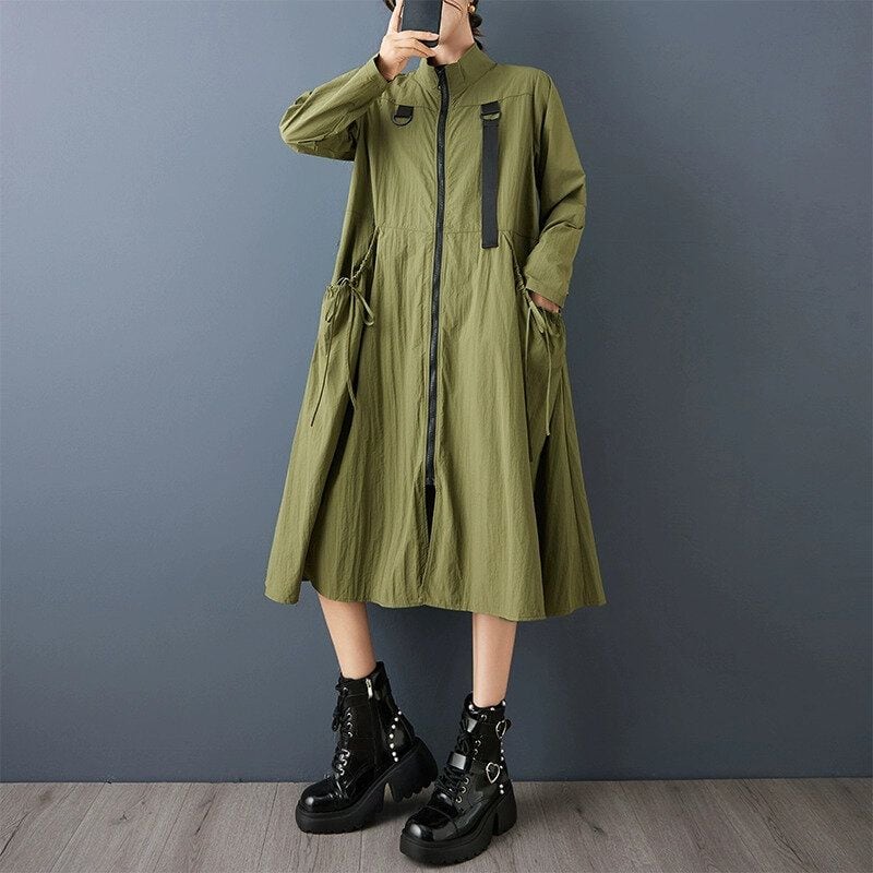 ストラップ飾りやドローストリングのポケットがアクセントになった、スタンドカラー・長袖・膝下丈のフルジップ・ウインドブレーカーコートです。ウエストの切り返しでギャザー加工された、ワンピースのようなAラインシルエットが魅力的なアカジュアルイテムです。