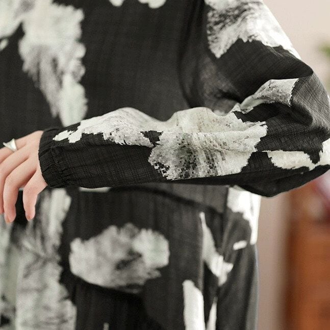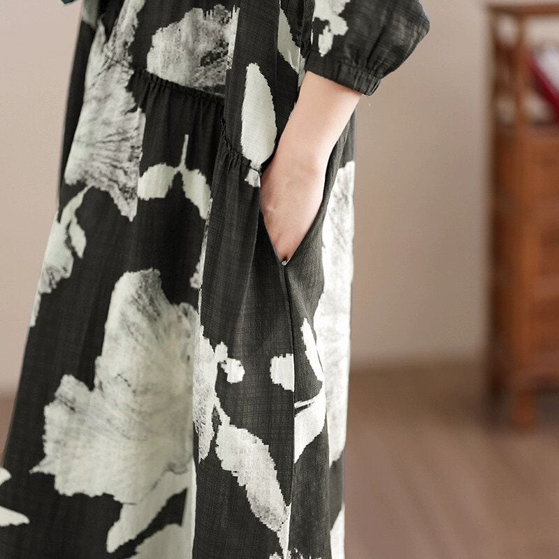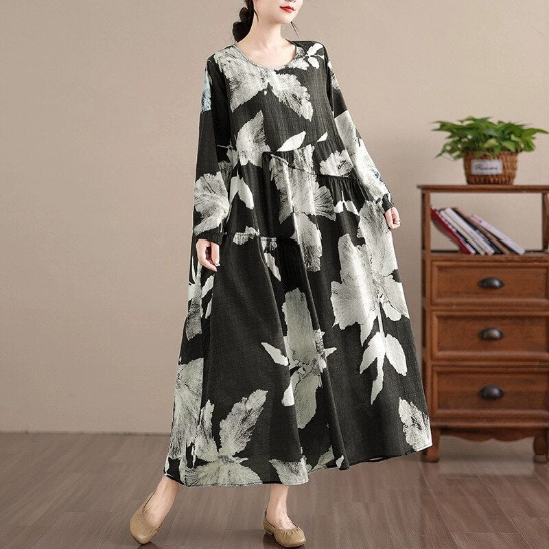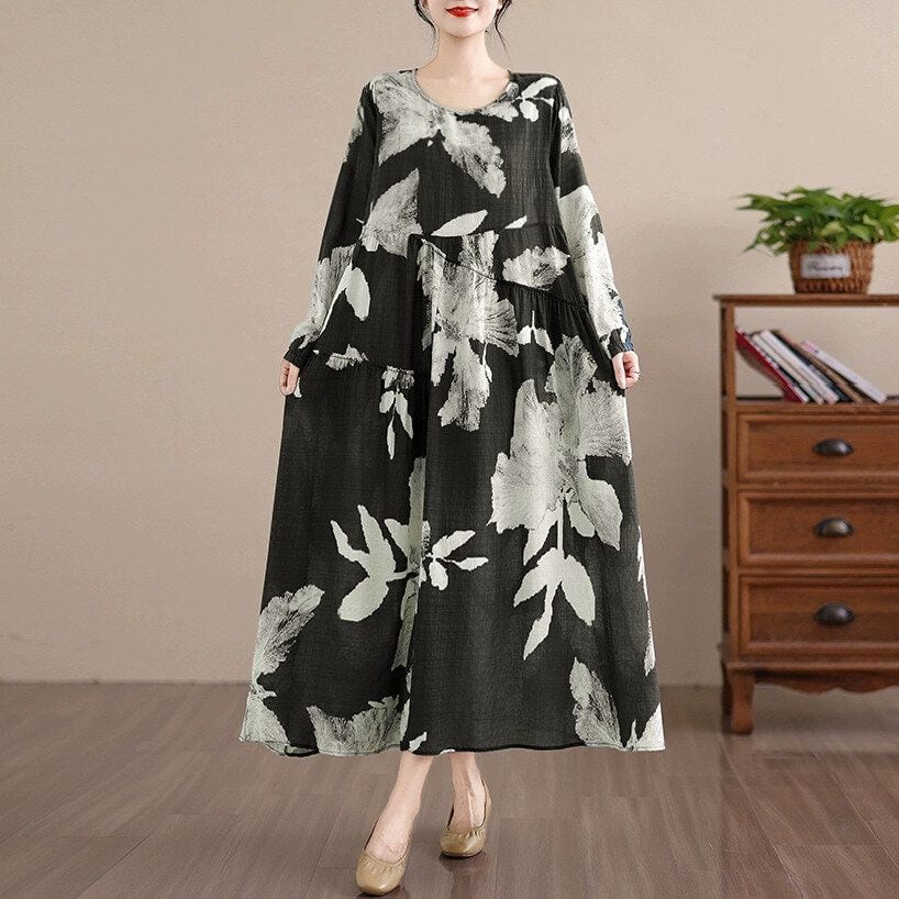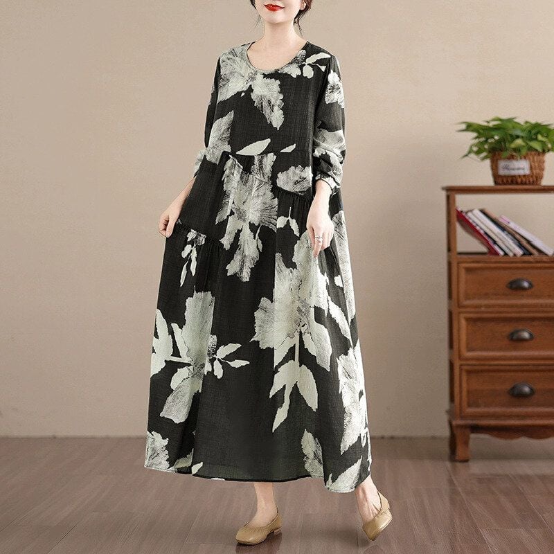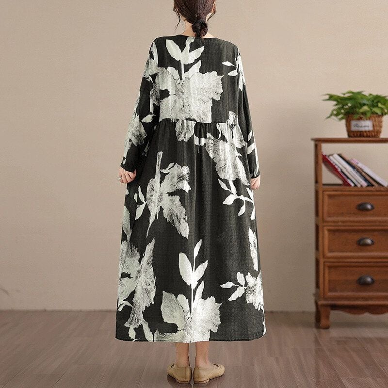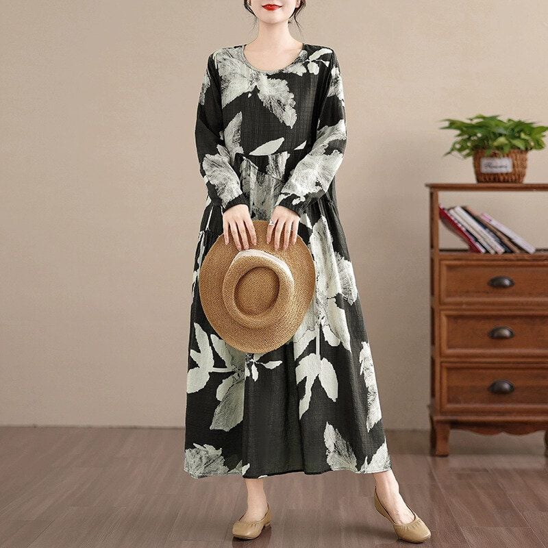 MONOTONE FLOWER PRINT BOAT NECK A-LINE LONG PULLOVER DRESS 1color M-14909