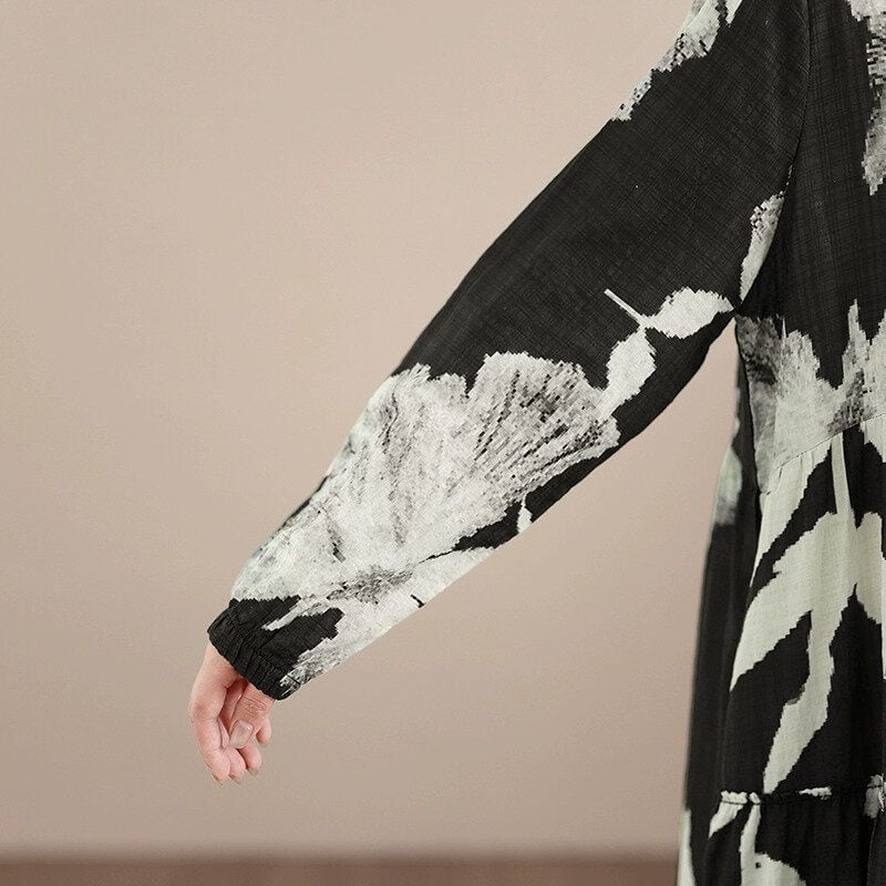 ブラック地に大きな花の写真のようなプリントが目を惹く、ボートネック・長袖・ロング丈のプルオーバーワンピースです。ゆったりとしたAラインのシルエットがエレガントな、リラックスした雰囲気のアイテムです。