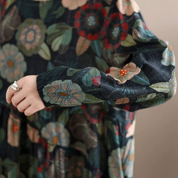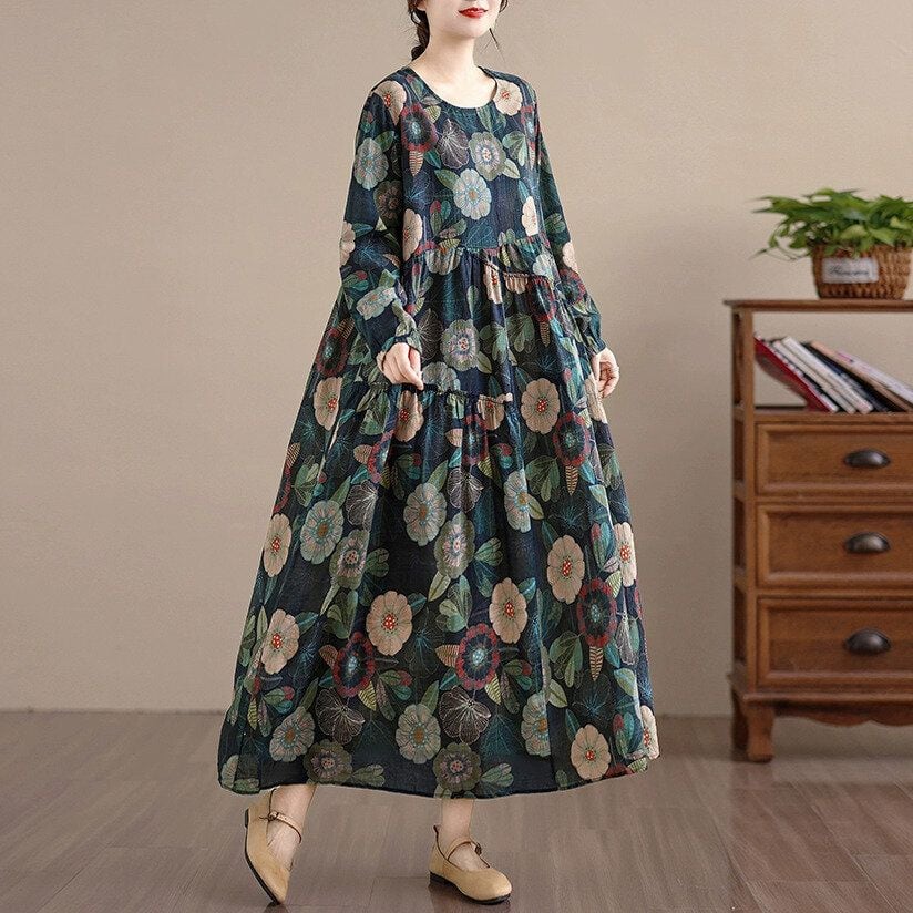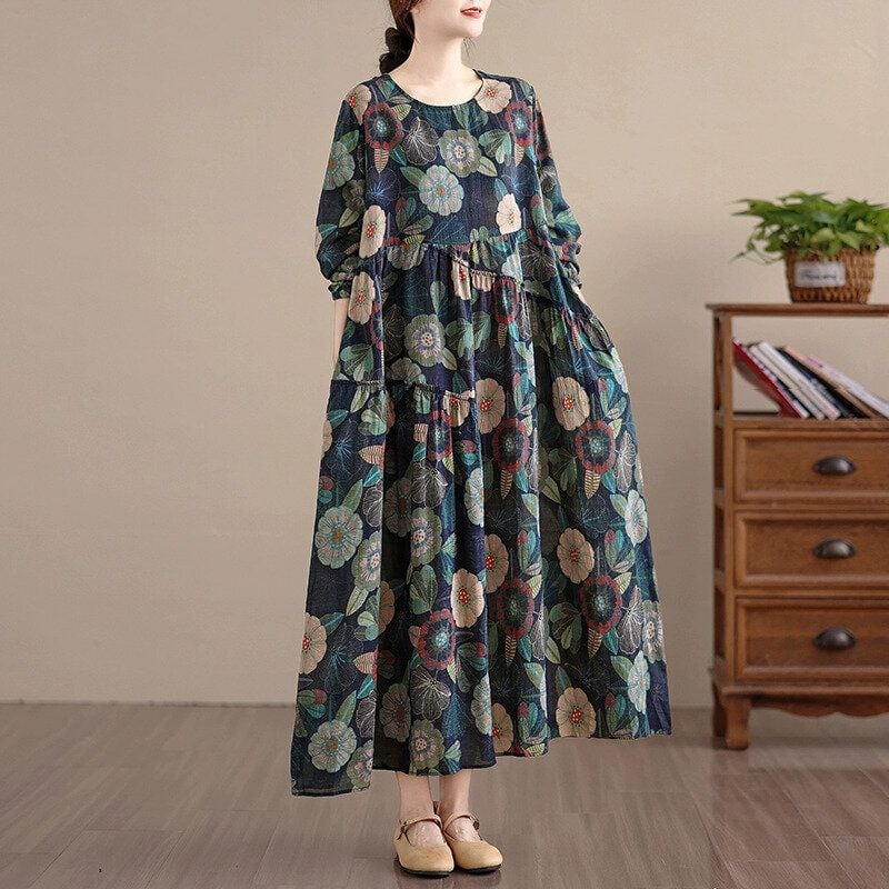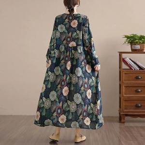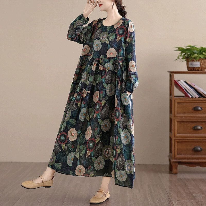 FLOWER PRINT BOAT NECK A-LINE LONG PULLOVER DRESS 1color M-14911