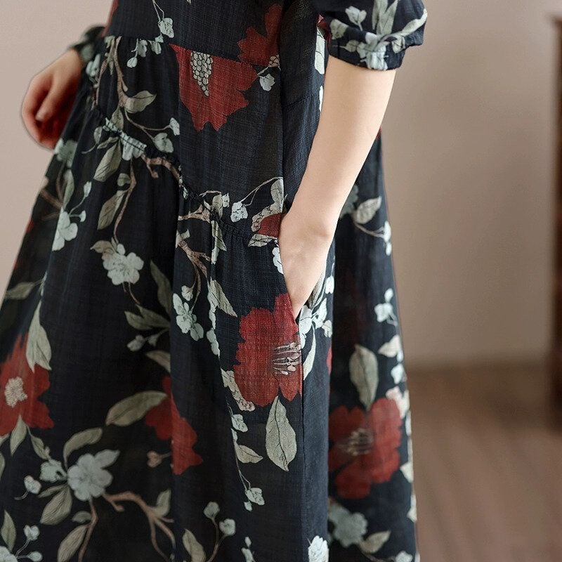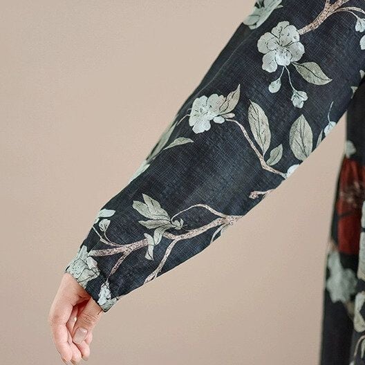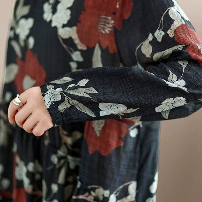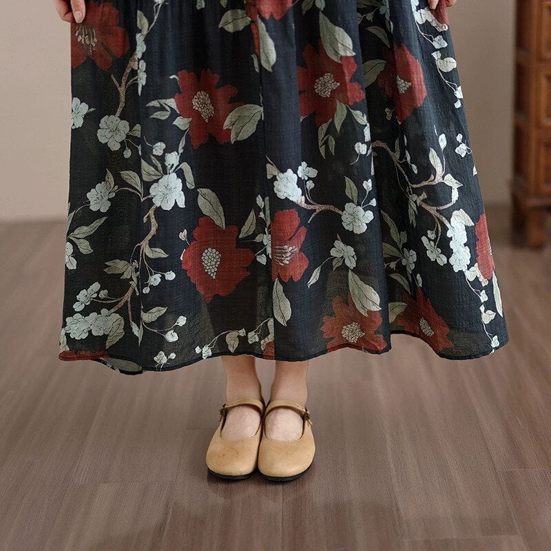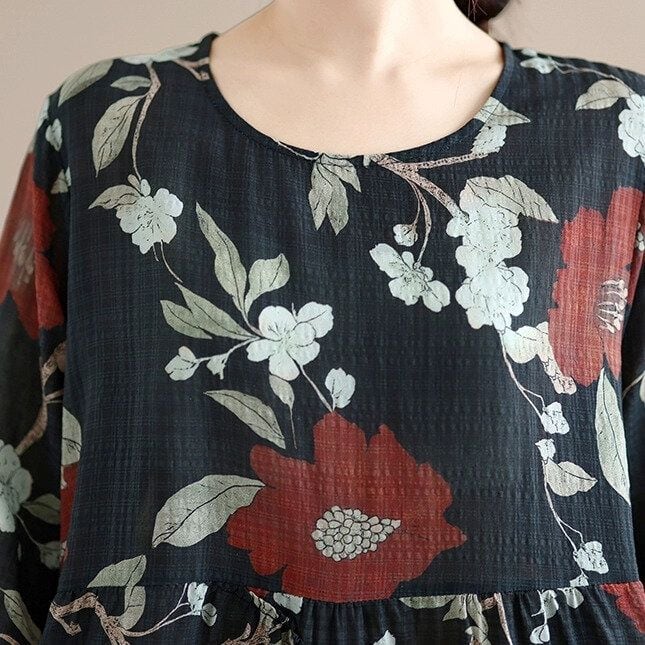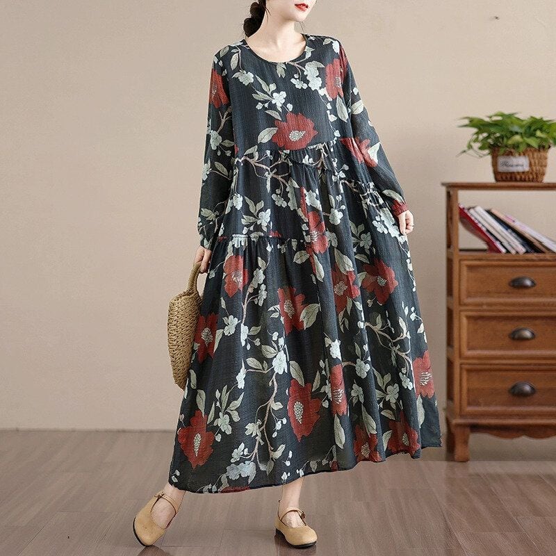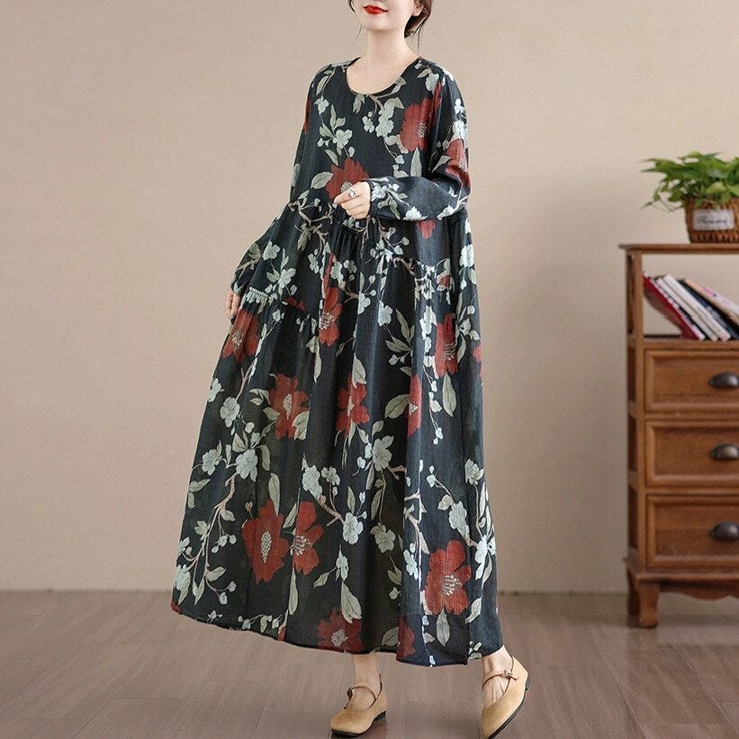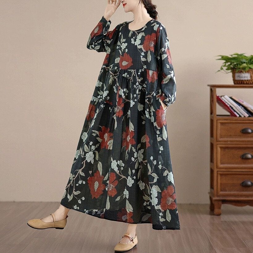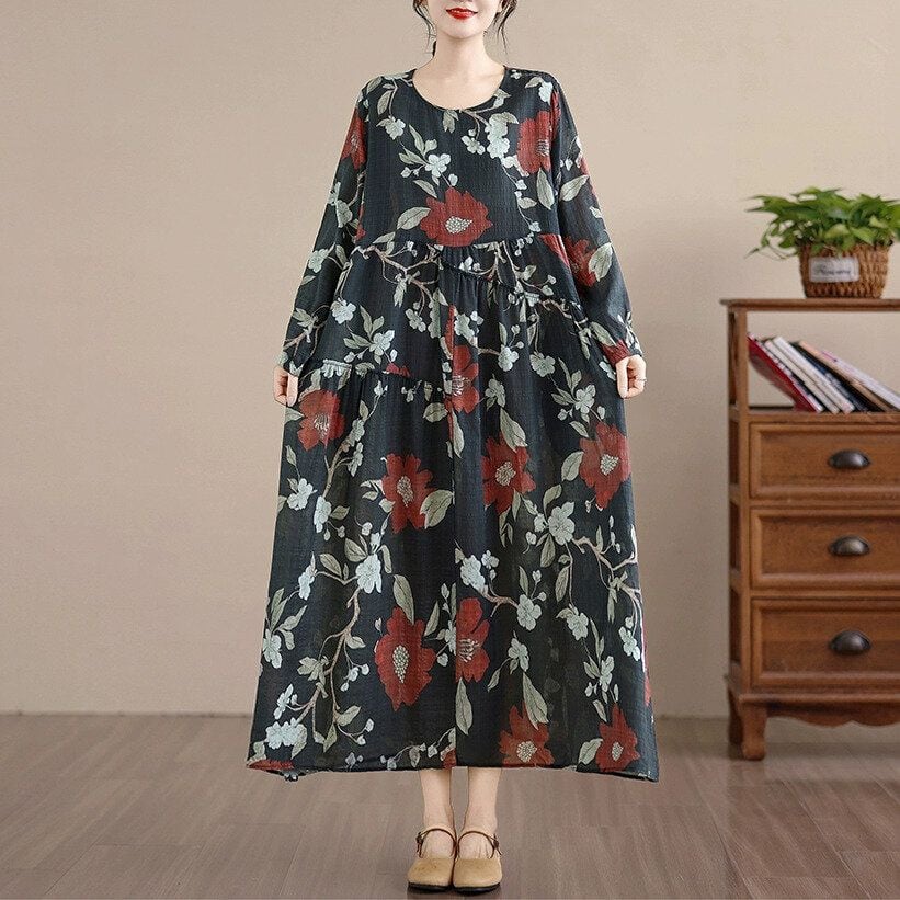 FLOWER PRINT BOAT NECK A-LINE LONG PULLOVER DRESS 1color M-14912
