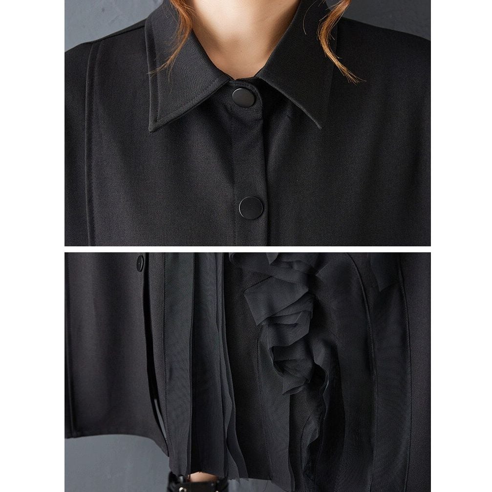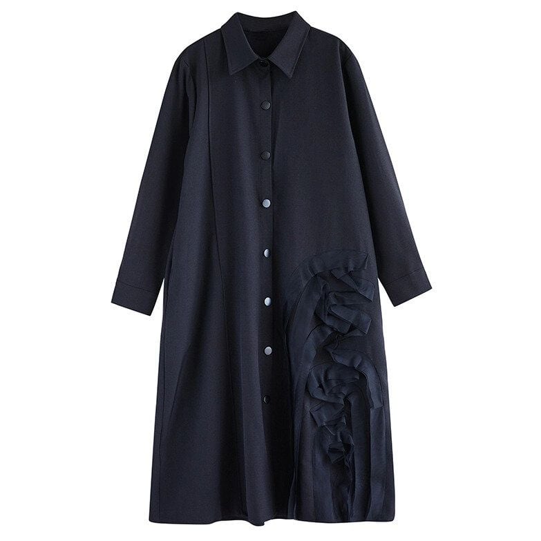 リボンラインで作られたアーティスティックなモチーフがアクセントになった、ポロ襟・長袖・ミドル丈のシャツワンピースです。スナップボタンが使いやすい、Aラインンシルエットが美しいアイテムです。ブラックとグレーの2色から選べます。