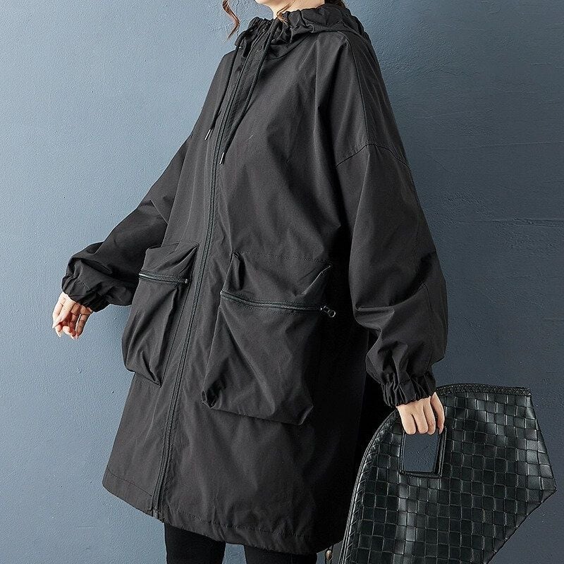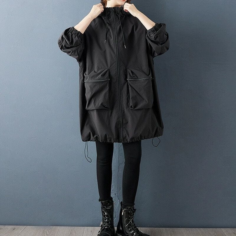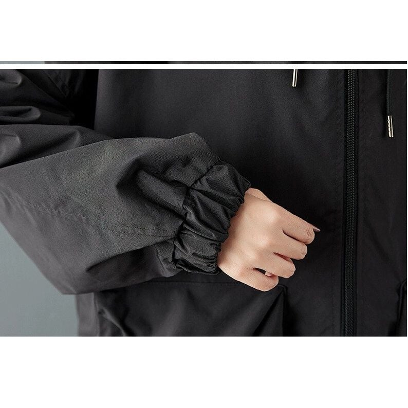 ジッパー付きの立体的な大きなポケットがキュートな、フード付き・長袖・ミドル丈のフルジップ・ウインドブレーカーコートです。フードにはドローストリング、袖口はゴム加工、裾はドローコードが付いて、冷たい風の侵入を防ぎます。ブラックの単色とゆったりとしたシルエットが使いやすいアイテムです。