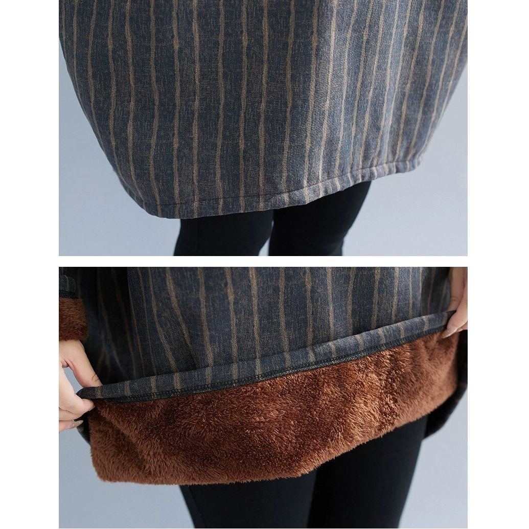 デニムのような色合いのストライプ生地でできた、フード付き・長袖・チュニック丈のプルオーバートップです。ブラウンのボア素材のライニングが暖かな、ゆったりとしたシルエットで着心地の良いアイテムです。