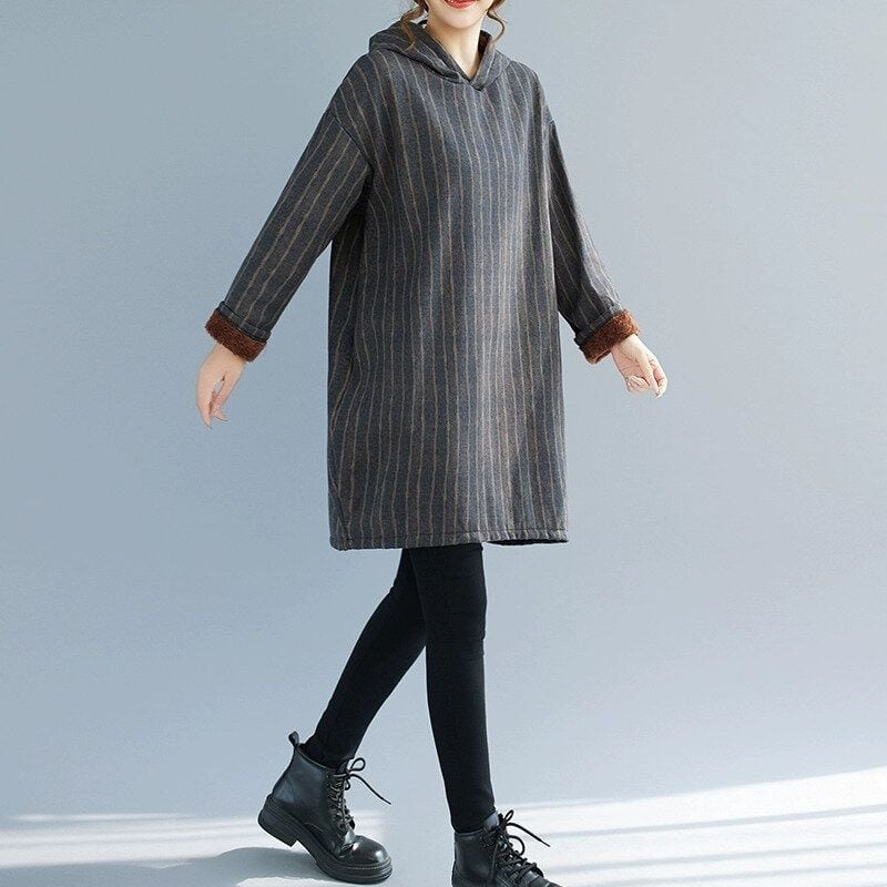 STRIPE HOODED SHERPA LINING PULLOVER TUNIC TOP 1color M-14927