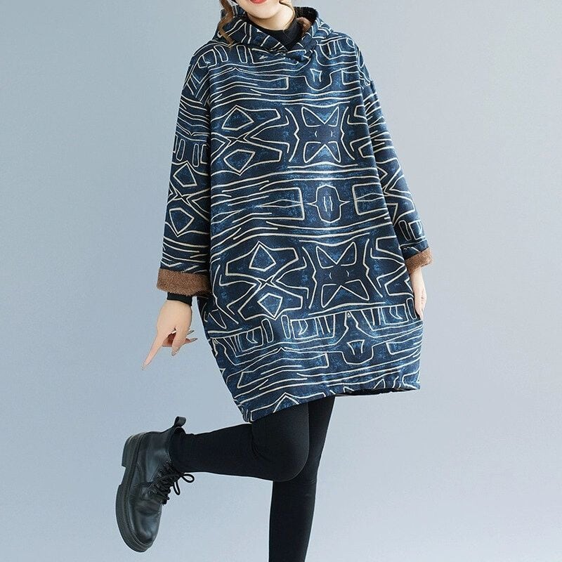 PRINT HOODED SHERPA LINING PULLOVET TUNIC TOP 1color M-14929