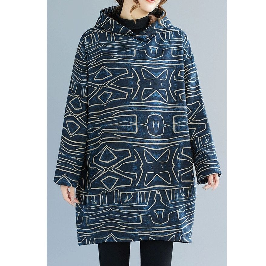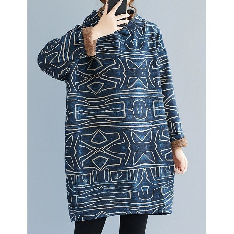 ブルーのマーブル地にエスニックな模様が目を惹く、フード付き・長袖・チュニック丈のプルオーバートップです。ブラウンのボア素材のライニングが暖かな、ゆったりとしたシルエットで着心地の良いアイテムです。