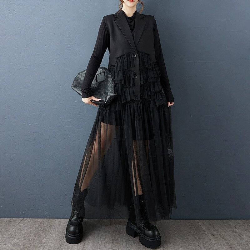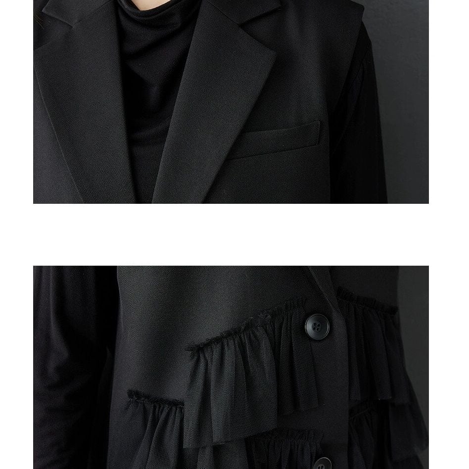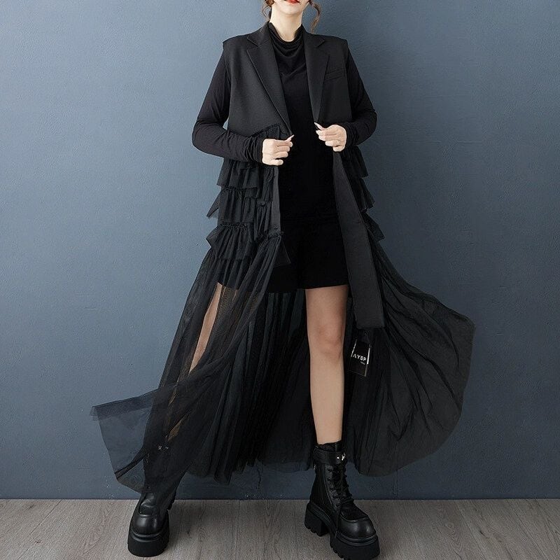 メッシュ素材のフリル飾りやスカートのような裾のスティッチが豪華な、ブラックのラペル付きVネック・ノースリーブ・ロング丈のドレススタイルジャケットです。Aラインのシルエットが美しい、パーティやイベントの衣装としても活躍するアイテムです。