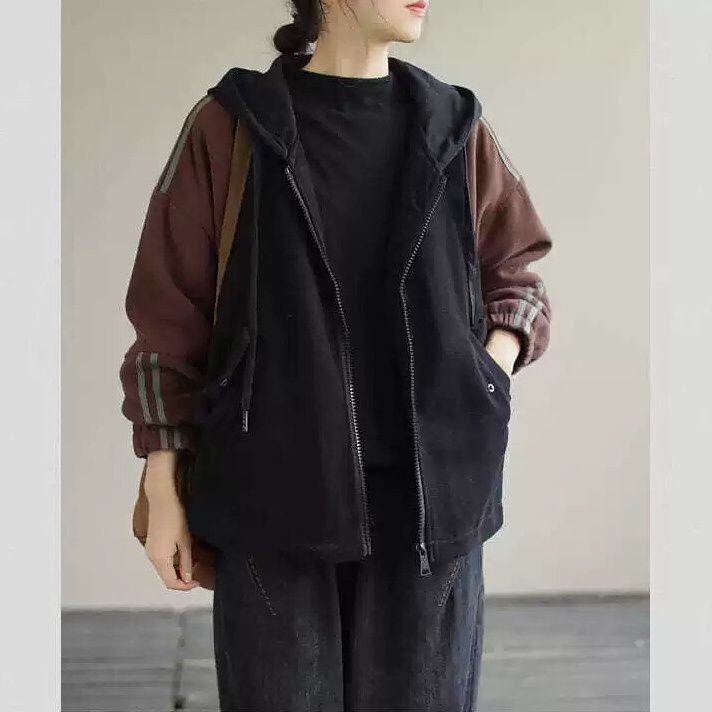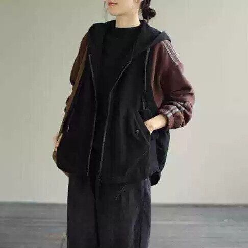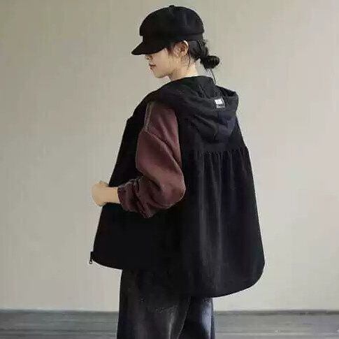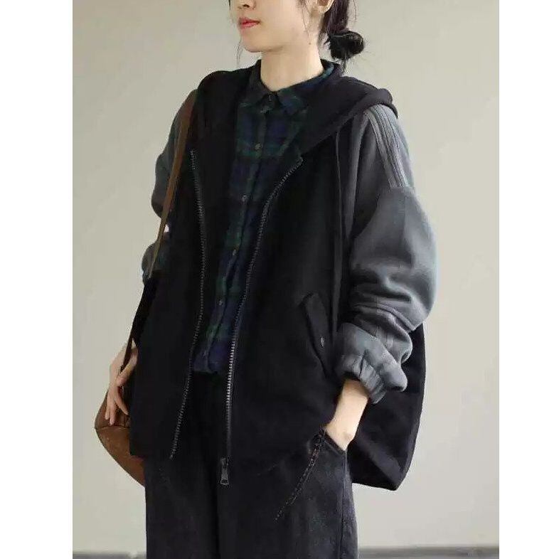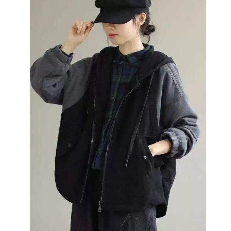 スウェットとベストジャケットを合わせたフェイクツーピースデザインがお洒落な、フード付き・長袖・フルジップのカジュアルジャケットです。袖のダブルラインがアクセントになった、ゆったりとしたシルエットの合わせやすいアイテムです。