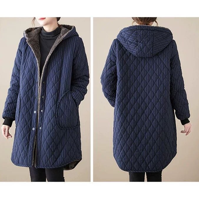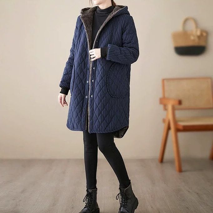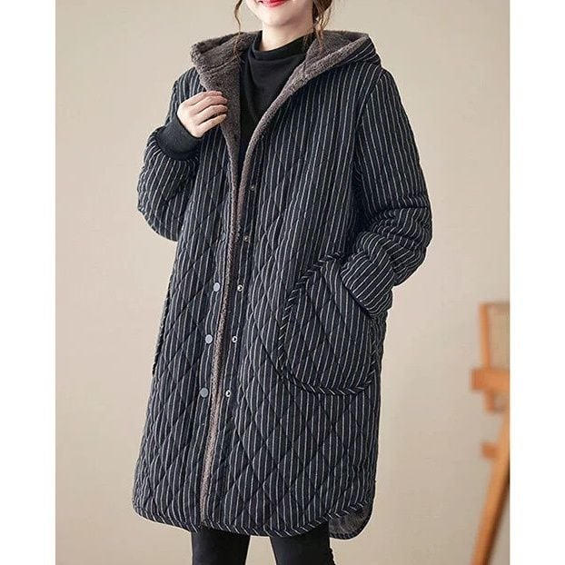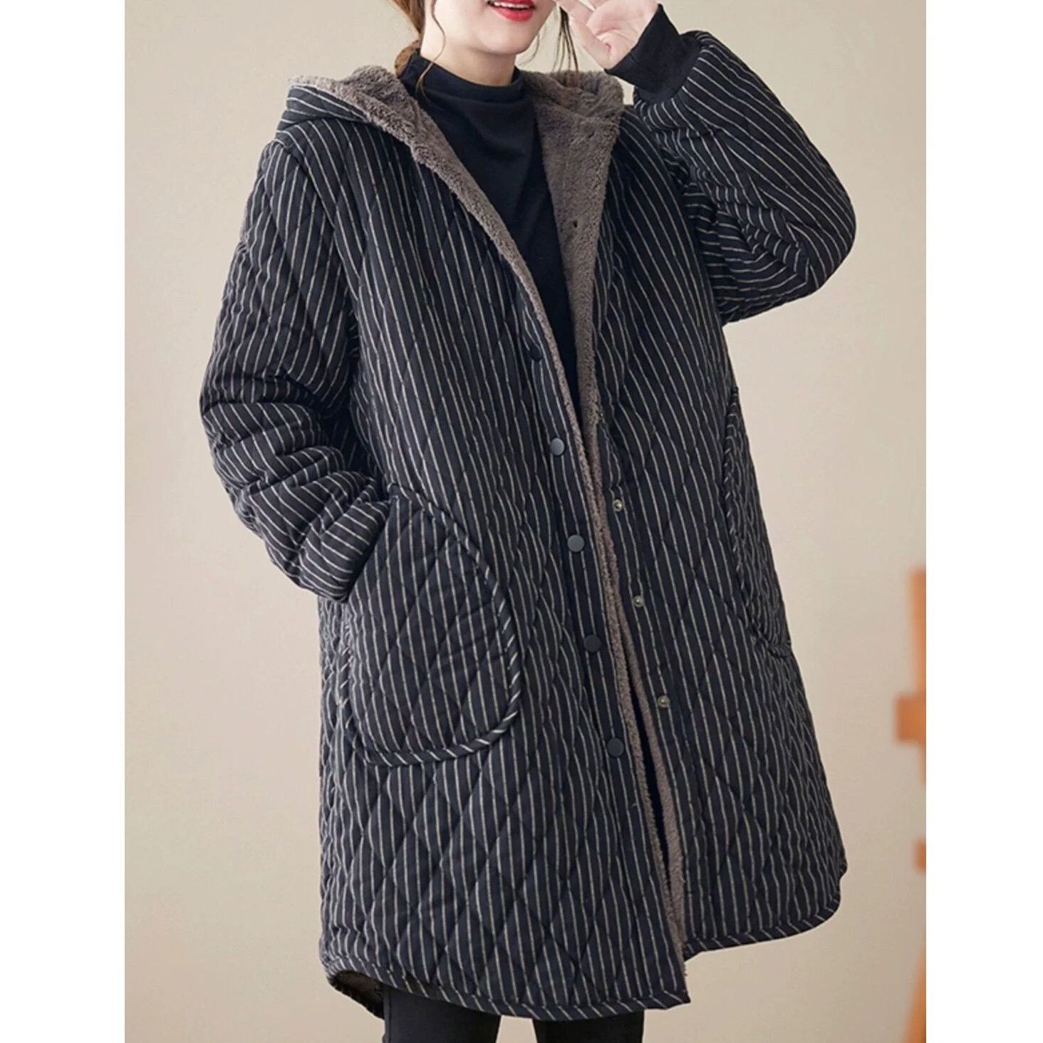 ストライプ柄のキルティングにボア素材の裏地が暖かな、フード付き・長袖・チュニック丈のカジュアルコートです。丸みのあるデザインのポケットがキュートな、スナップボタンで使いやすいアイテムです。ブラックとネイビーの2色から選べます。 SIZE:※測り方によって2-3cmの差が生じる場合がございます。 【L】バスト112cm 肩幅42cm 袖丈61cm 着丈92cm 【XL】バスト116cm 肩幅43cm 袖丈61.5cm 着丈92.5cm 【2XL】バスト120cm 肩幅44cm 袖丈62cm 着丈93cm 【3XL】バスト124cm 肩幅45cm 袖丈62.5cm 着丈93.5cm COLOR:Black、Navy 素材:ポリエステル、その他 モデル着用サイズ:L モデル情報:身長161cm 体重49kg お届けについて こちらの商品は海外店舗より直接発送となる為、 ご決済から到着までは、多くの場合【10日-2週間前後】でお届けしております。 ※在庫状況や輸送の混雑により、4週間前後かかる場合がございます。 注意事項 ・商品在庫切れにより注文キャンセルとさせていただく恐れもございますので、予めご了承くださいませ。 ・仕入れ工場を変えることがあるため、記載サイズと若干異なる場合がございます。 ・商品の色味は、お手持ちのスマートフォンの画面によって実物と若干異なる場合がございます。 ・イメージ違いやサイズ交換等、お客さまご都合による交換・返品はご遠慮ください。 送料について 全国一律580円。ただし10,000円以上のご注文で送料無料となります。 お支払い方法について ・クレジットカード決済(VISA/Mastercard/JCB/アメリカン・エクスプレス/ Diners Club) ・コンビニ決済/Pay-easy ※前払いのお支払い方法 ・Pay ID あと払い(コンビニ払い、口座振替) ※あと払いのお支払い方法 ・キャリア決済(d払い/au PAY(auかんたん決済)/ソフトバンク・ワイモバイルまとめて支払い) 管理番号:M-14943