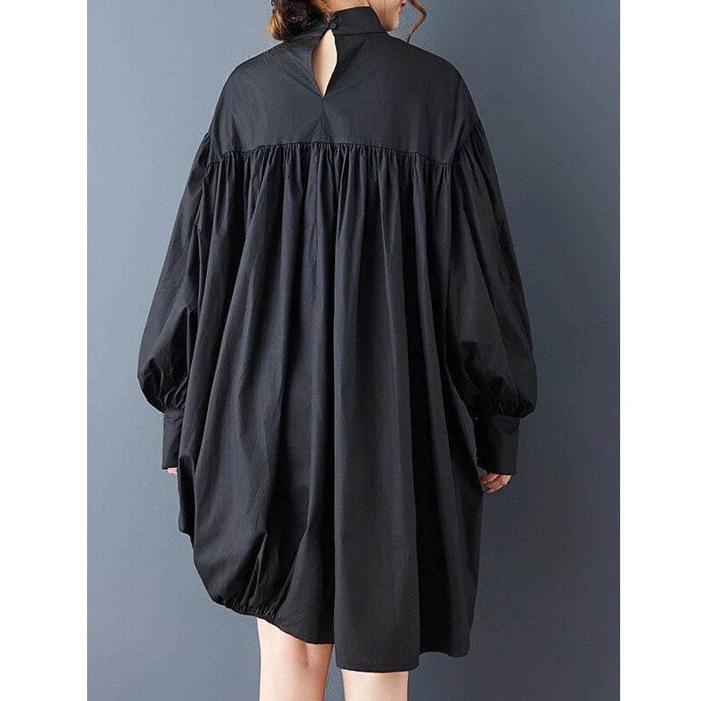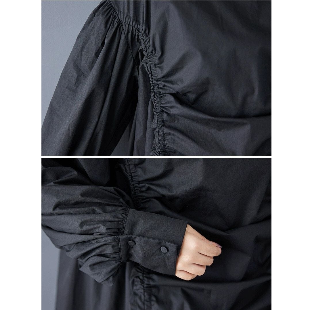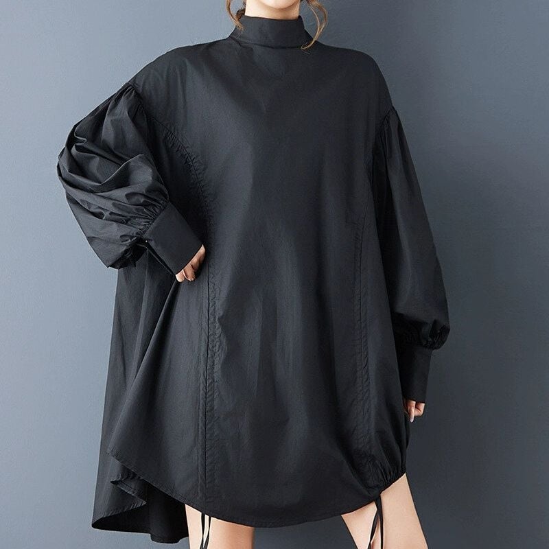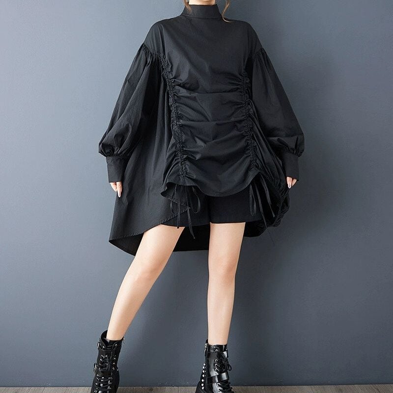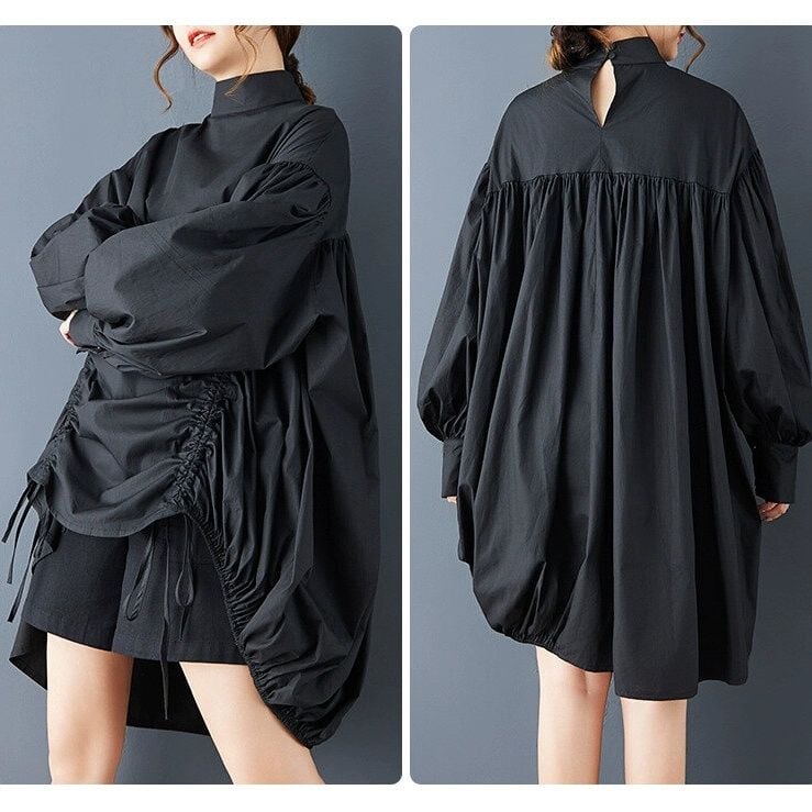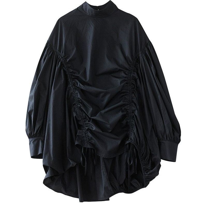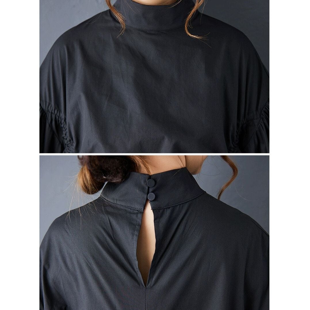 フロントとバックで印象の異なるデザインがお洒落な、ハイネック・長袖・チュニック丈のプルオーバーシャツです。ドローコートでシルエットをアレンジできるフロントやランタンスリーブなど、細部までこだわりを感じるデザインです。ブラックの単色で、ミニ丈のワンピースとしても使えるアイテムです。