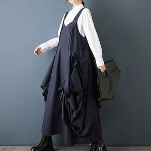 サイドの大きなフリルのようなフラップ飾りが豪華な、ロング丈のストラップ・ジャンパースカートです。2本ずつの紐飾りがあしらわれたお洒落なショルダーストラップは、ボタンで長さを調節できます。シルエットが特徴的な、単色で小物アレンジの利くアイテムです。色は2色から選べます。