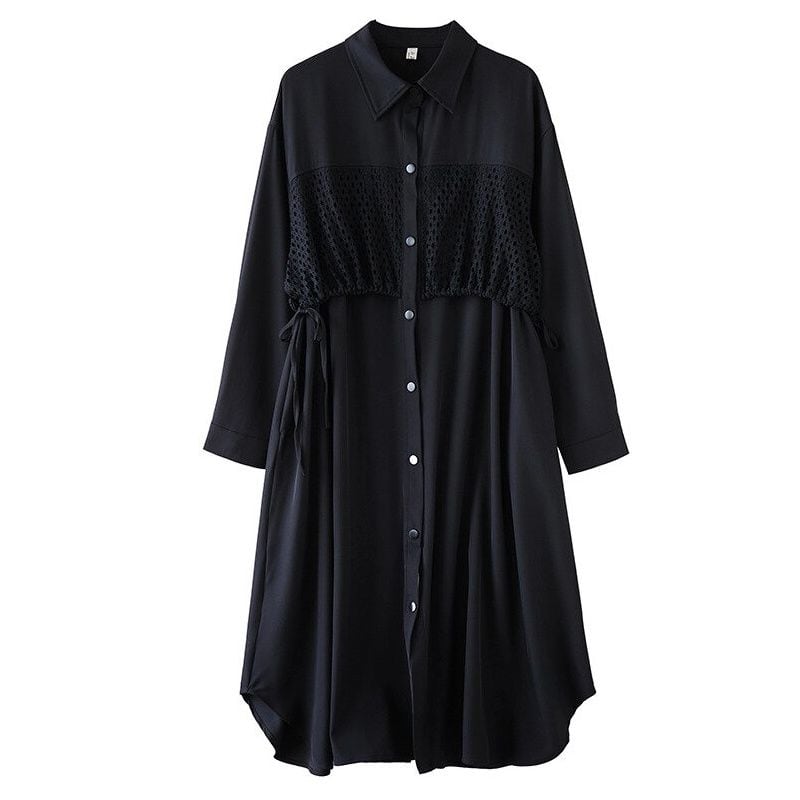 BLACK MESH STITCH A-LINE MIDI SHIRT DRESS 1color M-14964