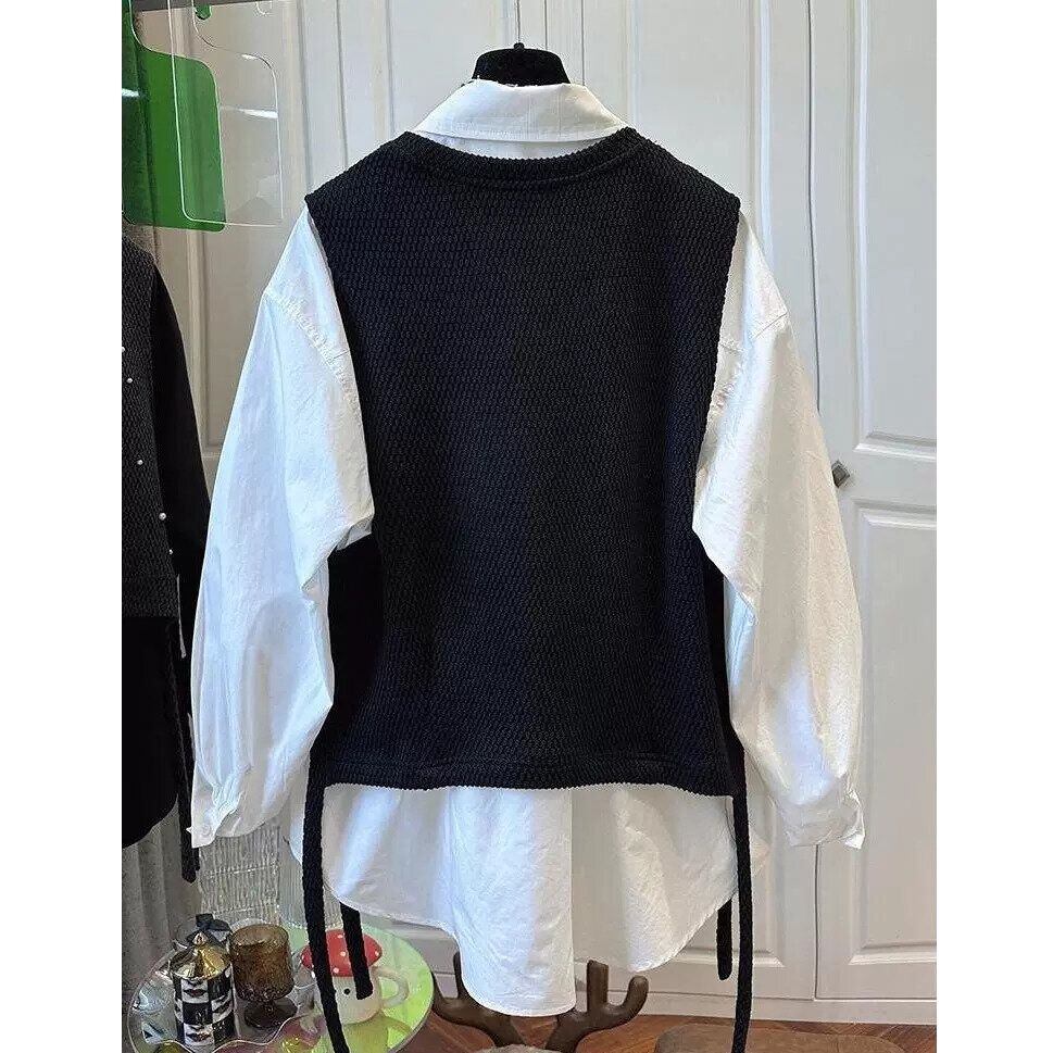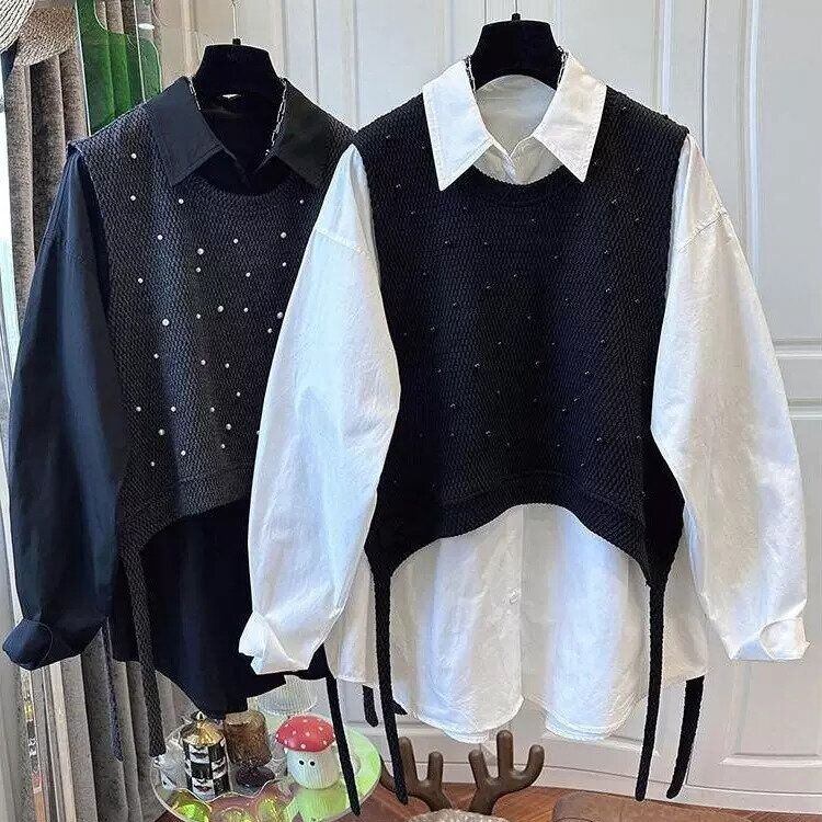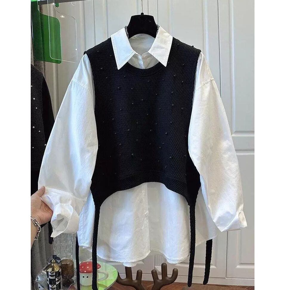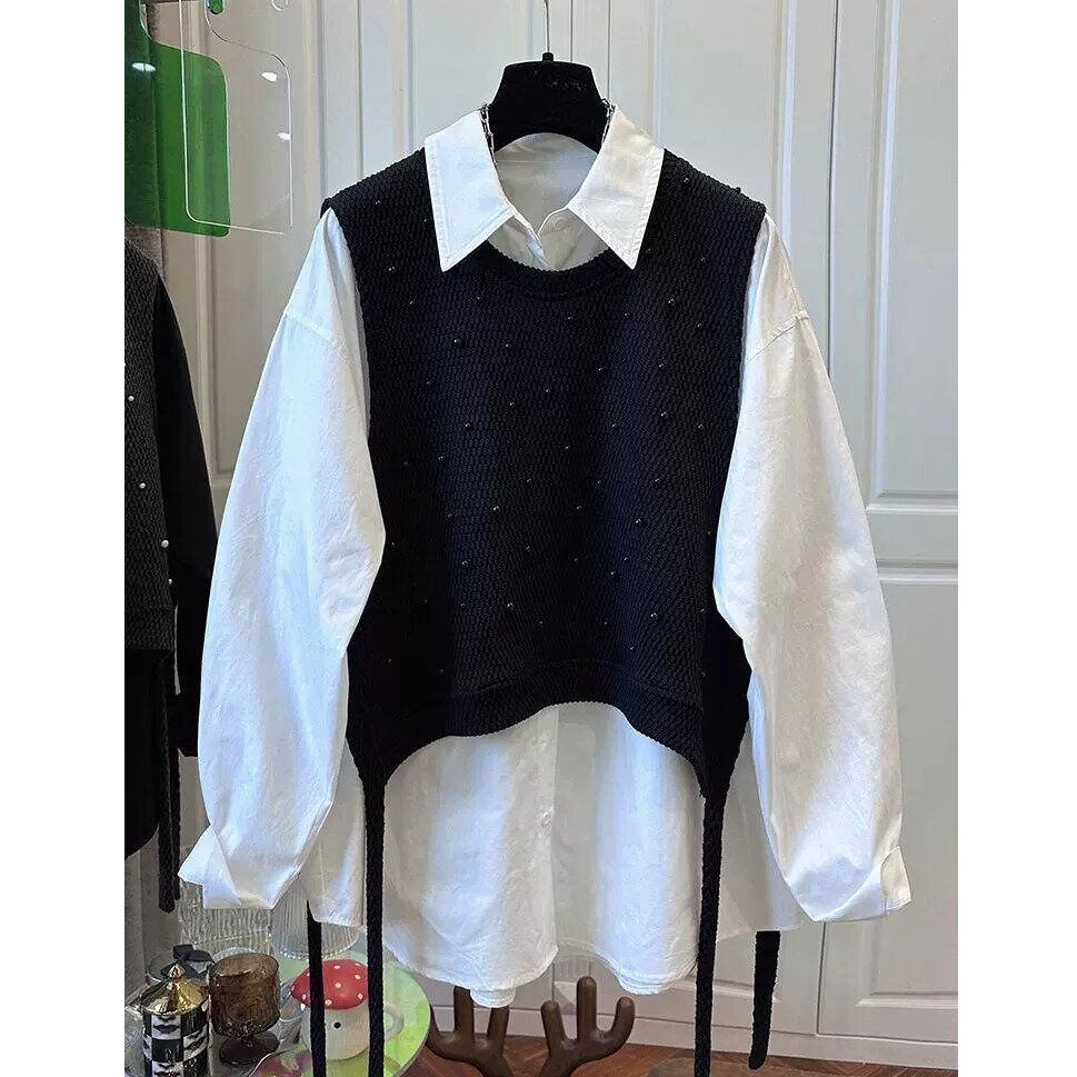 無地のポロ襟・長袖・ラウンドカットのシャツと、パールビーズ飾りがキュートなラウンドネック・プルオーバー・ニットベストのセットです。ベストはショート丈で、前後のサイドに計4本のストラップが垂れたデザインが特徴的です。ブラックとホワイトの2色から選べます。 SIZE:※測り方によって2-3cmの差が生じる場合がございます。 【M】バスト105cm 着丈70cm 【L】バスト110cm 着丈71cm 【XL】バスト115cm 着丈72cm 【2XL】バスト120cm 着丈73cm COLOR:White、Black 素材:ポリエステル、その他 STYLE CALENDAR:春◎ 夏〇 秋◎ 冬〇 お届けについて こちらの商品は海外店舗より直接発送となる為、 ご決済から到着までは、多くの場合【10日-2週間前後】でお届けしております。 ※在庫状況や輸送の混雑により、4週間前後かかる場合がございます。 注意事項 ・商品在庫切れにより注文キャンセルとさせていただく恐れもございますので、予めご了承くださいませ。 ・仕入れ工場を変えることがあるため、記載サイズと若干異なる場合がございます。 ・商品の色味は、お手持ちのスマートフォンの画面によって実物と若干異なる場合がございます。 ・イメージ違いやサイズ交換等、お客さまご都合による交換・返品はご遠慮ください。 送料について 全国一律580円。ただし10,000円以上のご注文で送料無料となります。 お支払い方法について ・クレジットカード決済(VISA/Mastercard/JCB/アメリカン・エクスプレス/ Diners Club) ・コンビニ決済/Pay-easy ※前払いのお支払い方法 ・Pay ID あと払い(コンビニ払い、口座振替) ※あと払いのお支払い方法 ・キャリア決済(d払い/au PAY(auかんたん決済)/ソフトバンク・ワイモバイルまとめて支払い) 管理番号:M-14974