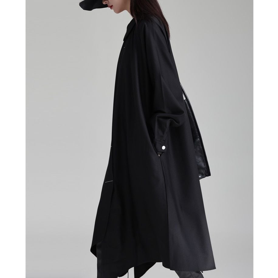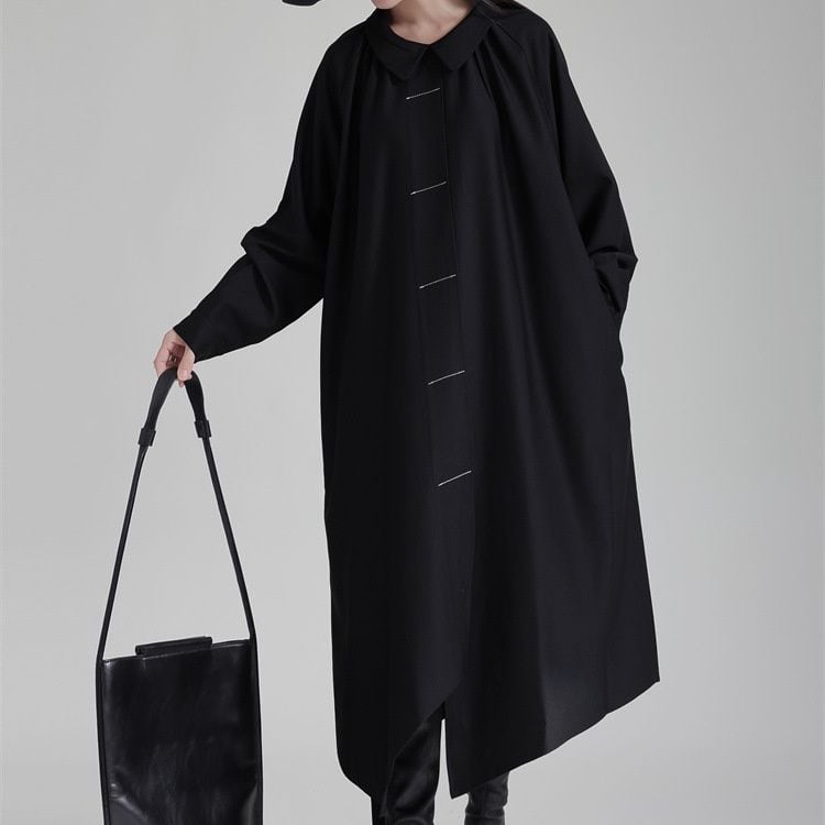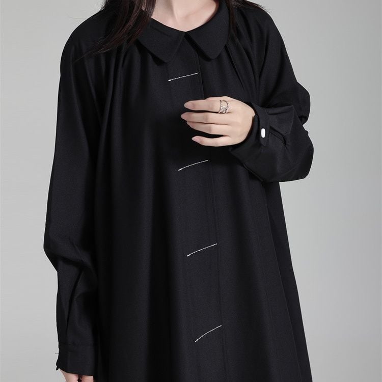 ブラックの滑らかな生地に白いボタンが目を惹く、スモールラウンドカラー・長袖・ロング丈のシャツワンピースです。バックのボタンラインやイレギュラーな裾が魅力的な、モードな印象のアイテムです。