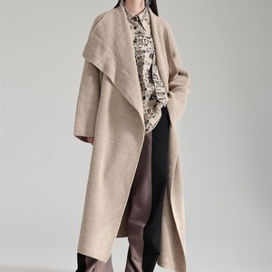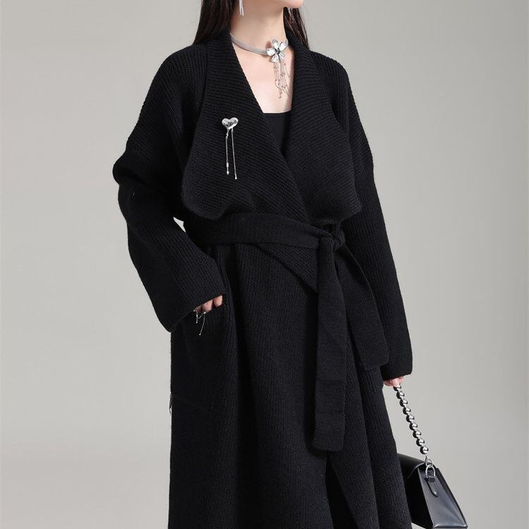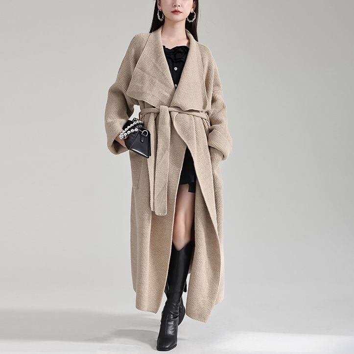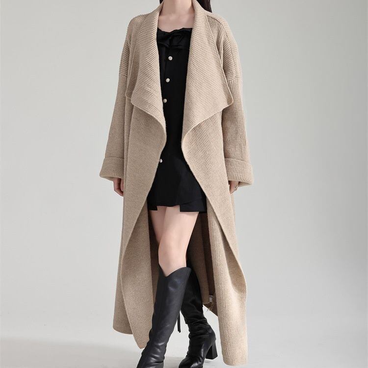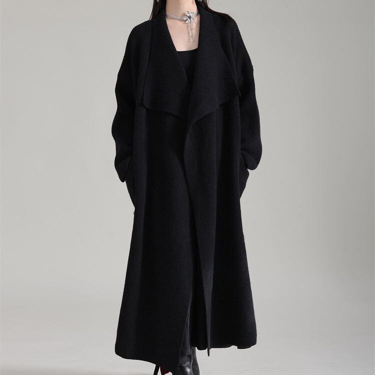 単色のリブニット素材でできた、ロング丈のカーディガンコートです。留め具がなくストラップベルトを結んで留めるデザインで、大きな襟やゆったりとしたシルエットがガウンのような、エレガントなアイテムです。ブラックとアプリコットの2色から選べます