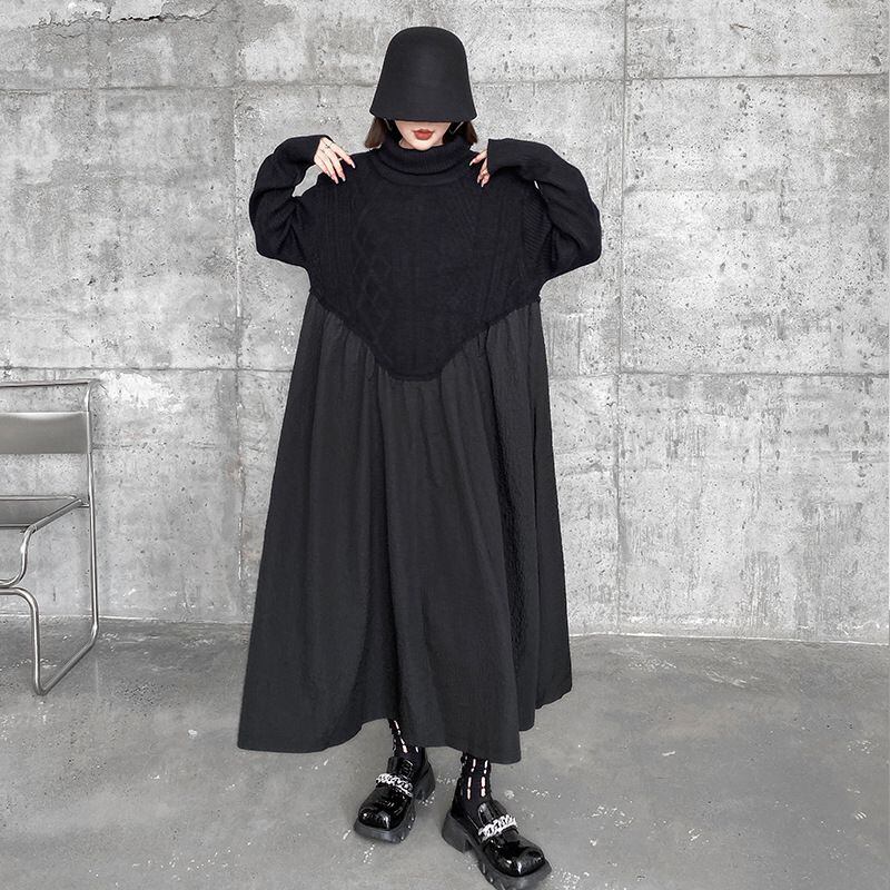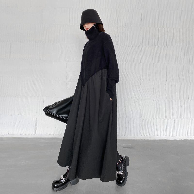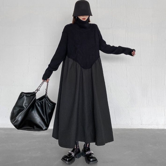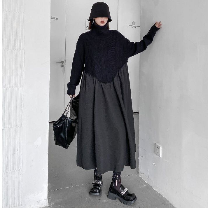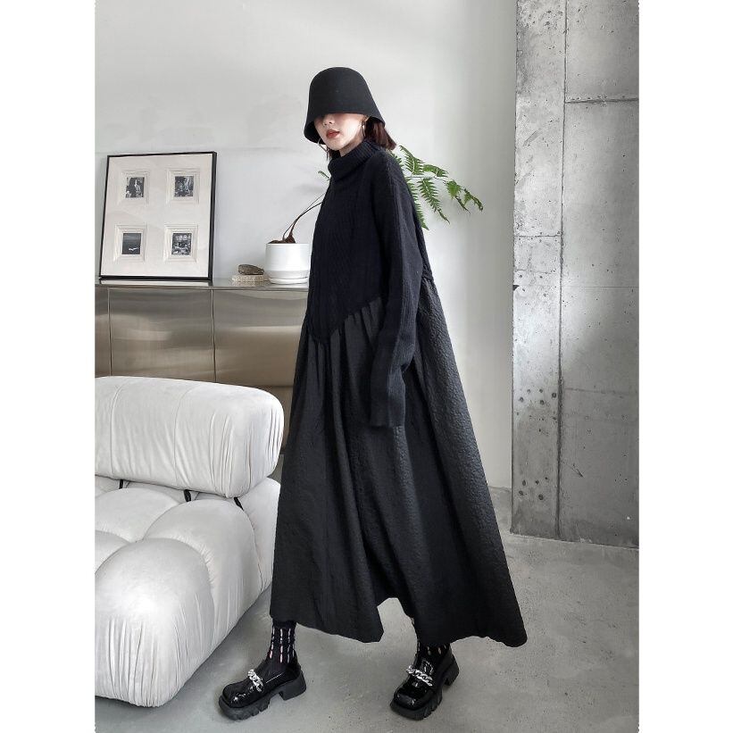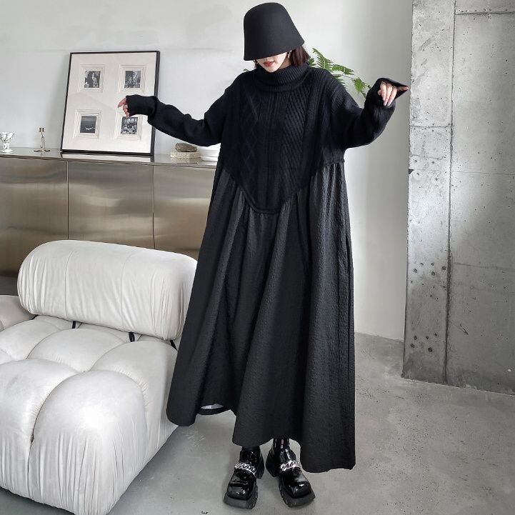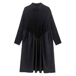 BLACK TURTLE NECK KNIT A-LINE STITCH LONG PULLOVER DRESS 1color M-14985