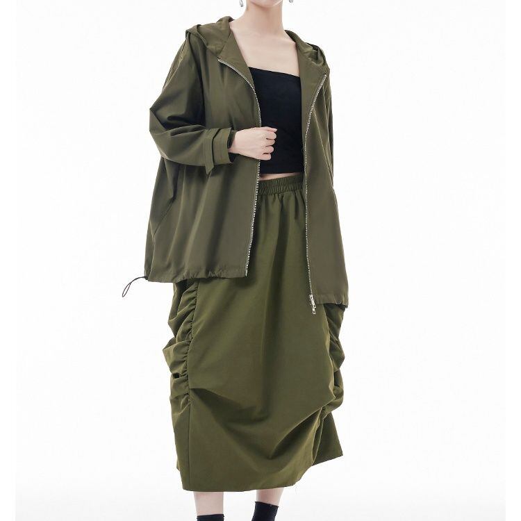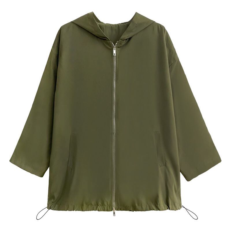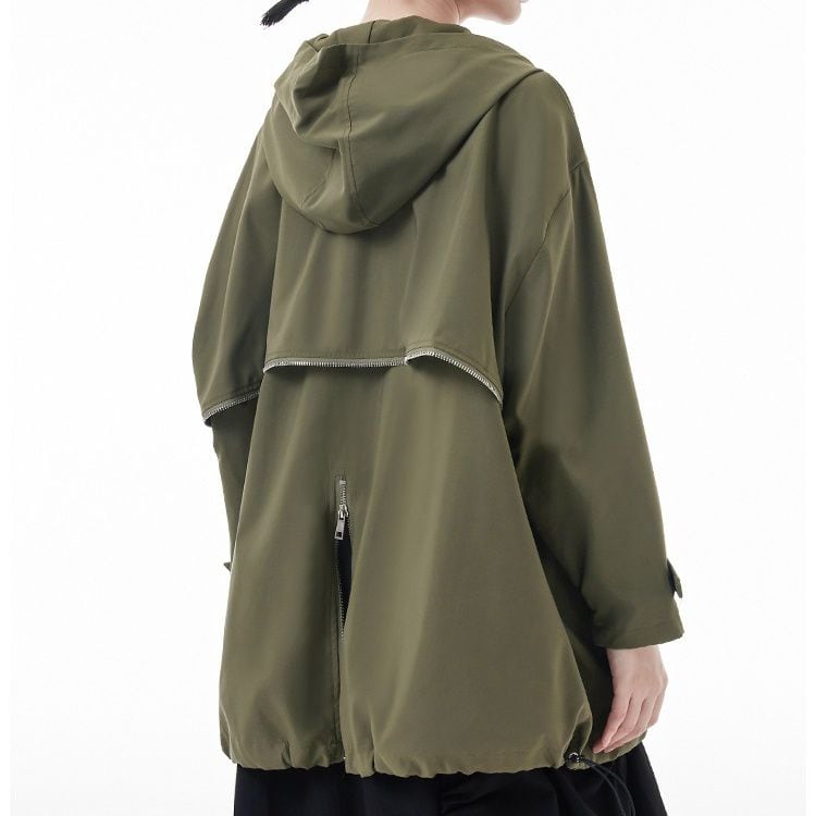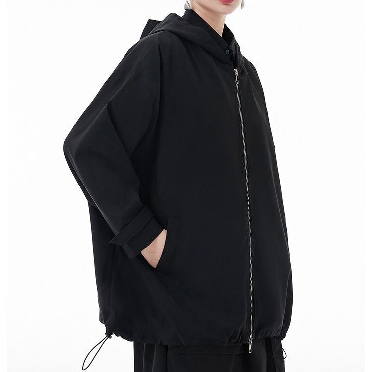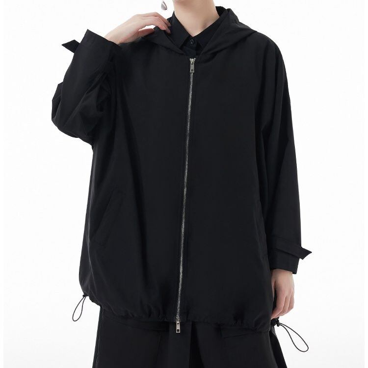 滑らかな薄手の単色素材でできた、フード付き・長袖・フルジップジャケットです。ダブルジップや裾のドローコードで、シルエットをアレンジでいます。ジップやフラップがあしらわれた、バックのデザインにもこだわりを感じるカジュアルアイテムです。色は2色から選べます。
