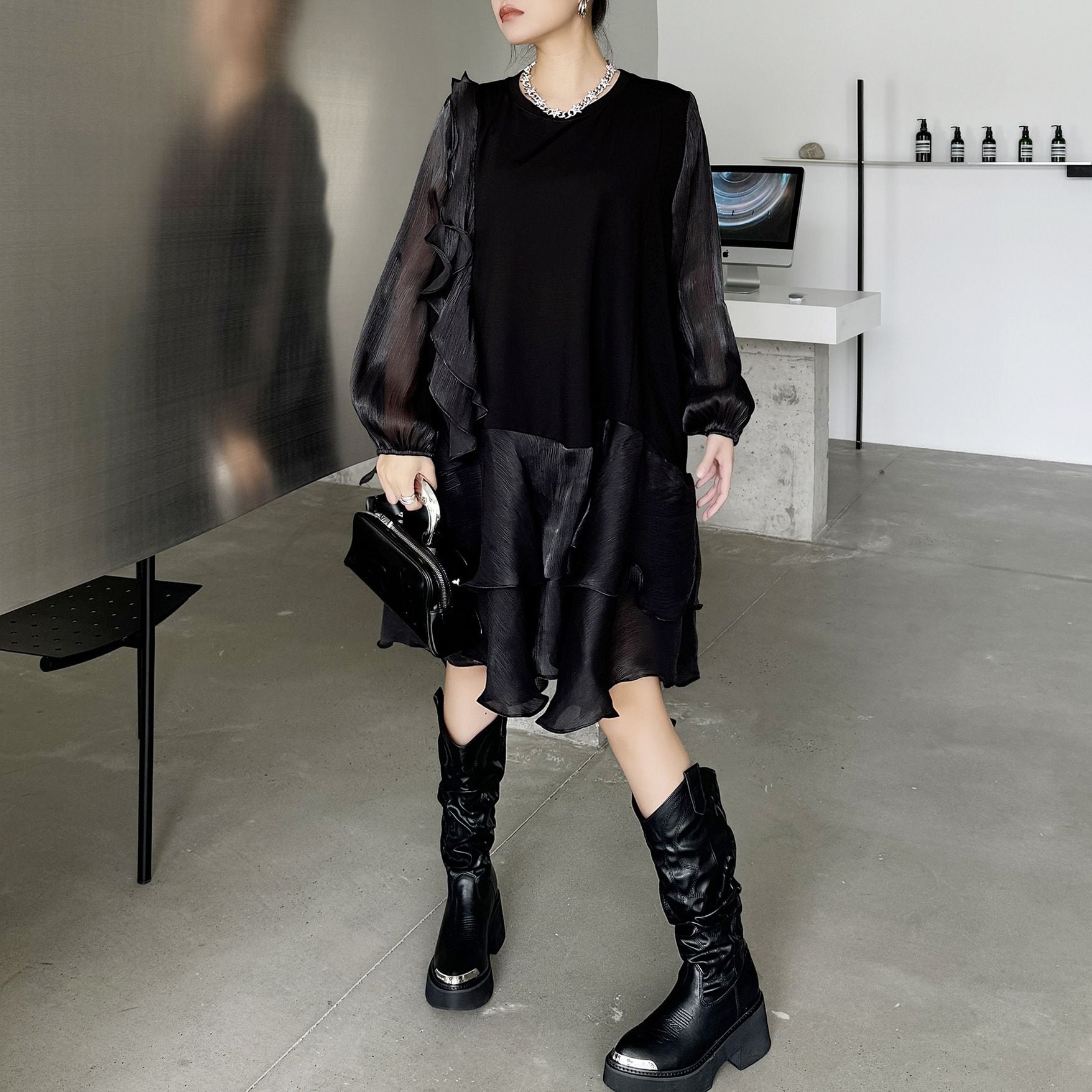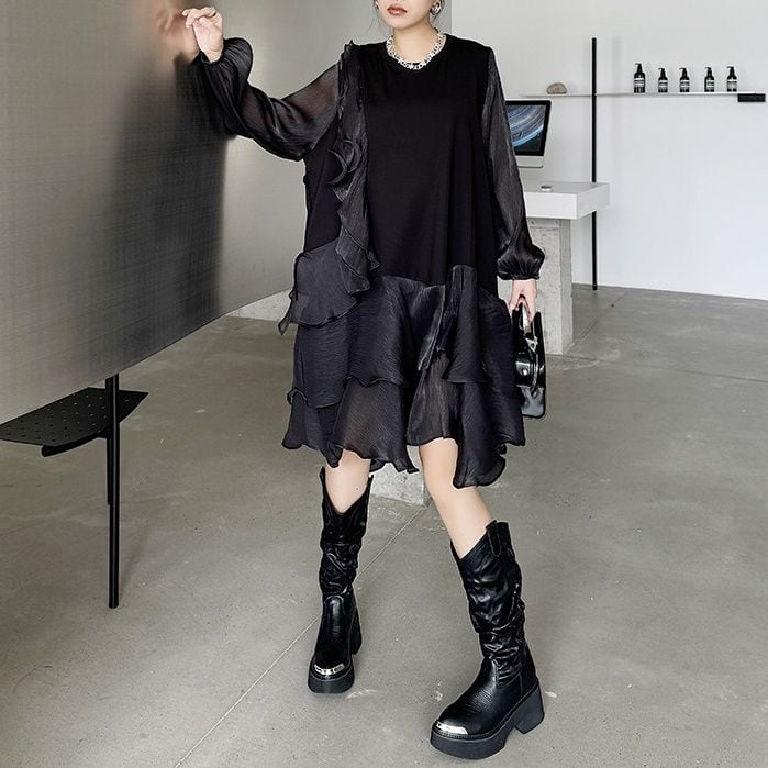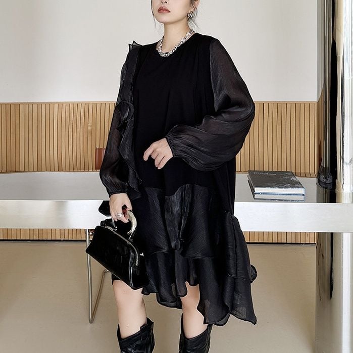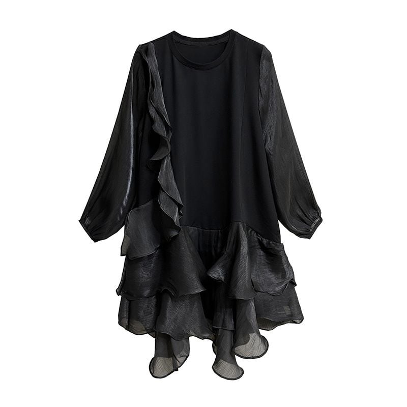 両袖とフリルを重ねたスカートが透け感のある素材でできた、ラウンドネック・長袖・ミドル丈のスティッチデザインワンピースです。妖精ドレスのようなシルエットが魅力的な、ブラックの単色で小物アレンジが利くアイテムです。