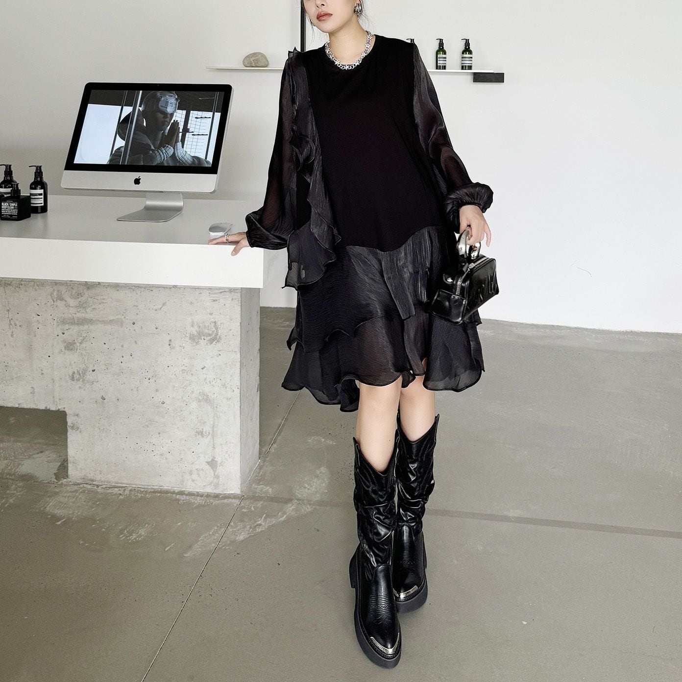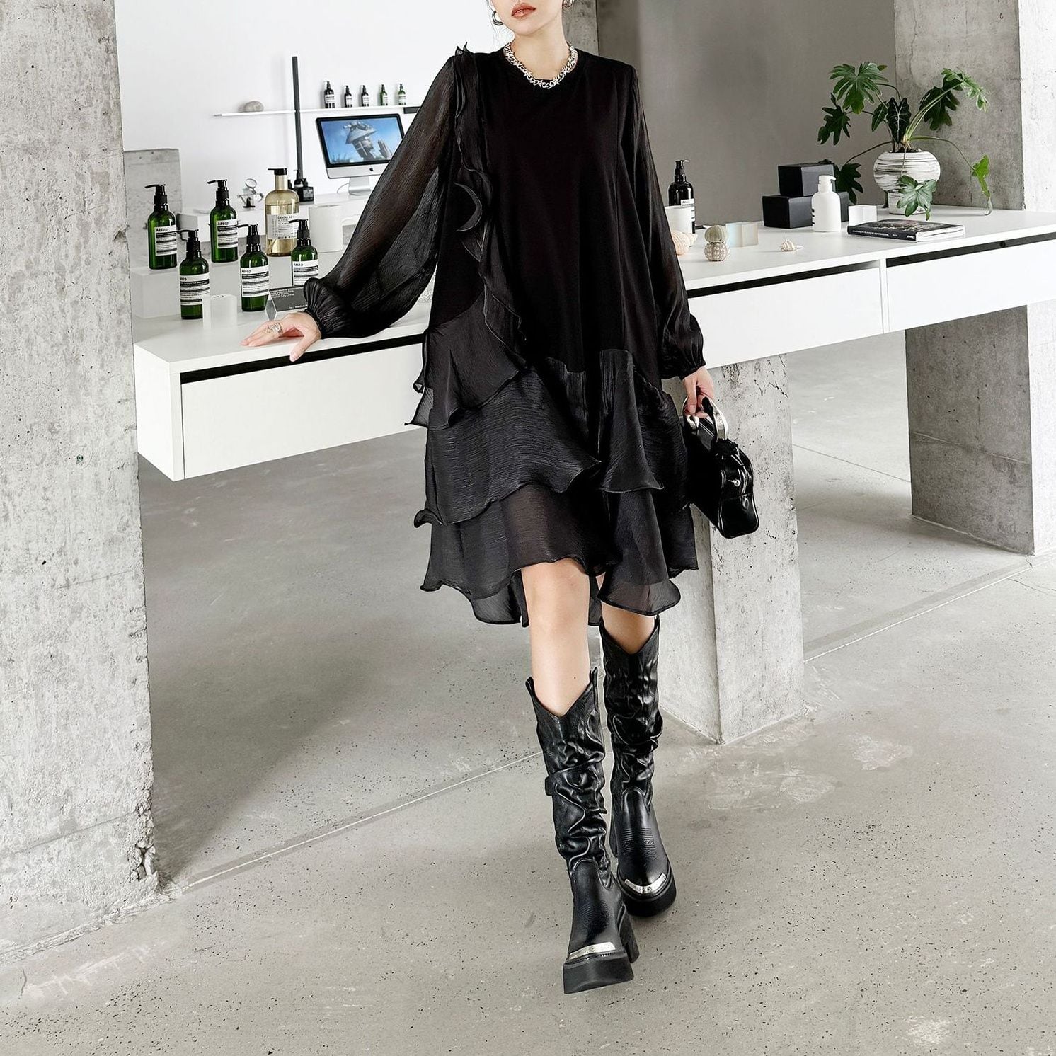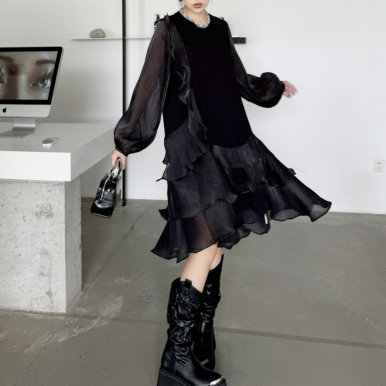 両袖とフリルを重ねたスカートが透け感のある素材でできた、ラウンドネック・長袖・ミドル丈のスティッチデザインワンピースです。妖精ドレスのようなシルエットが魅力的な、ブラックの単色で小物アレンジが利くアイテムです。