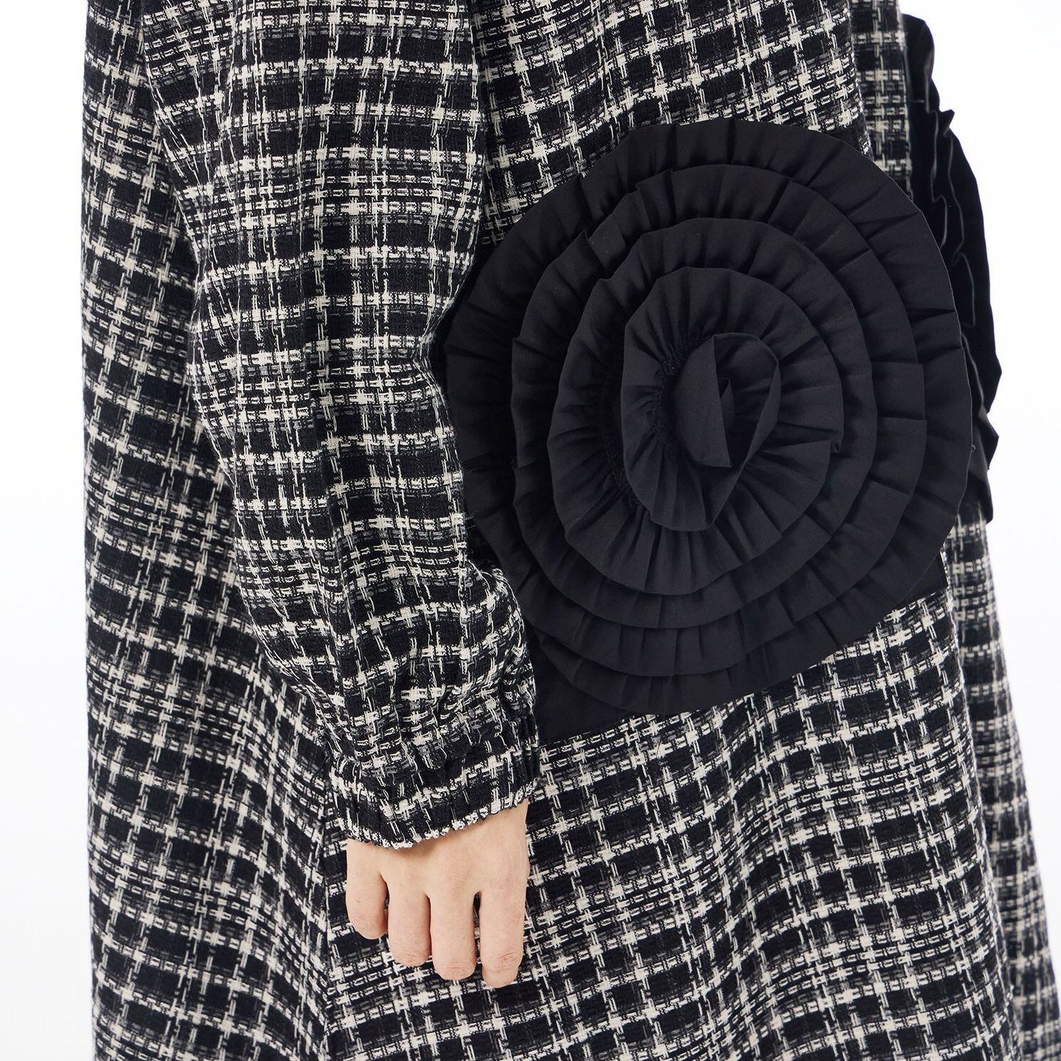 プリーツリボンで作られた立体的なお花のモチーフが付いたポケットがアクセントになった、ポロ襟・長袖・ミドル丈のデザインコートです。Aラインのシルエットが美しい、クラシカルな印象のアイテムです。チェック柄とストライプ柄の2種類から選べます。