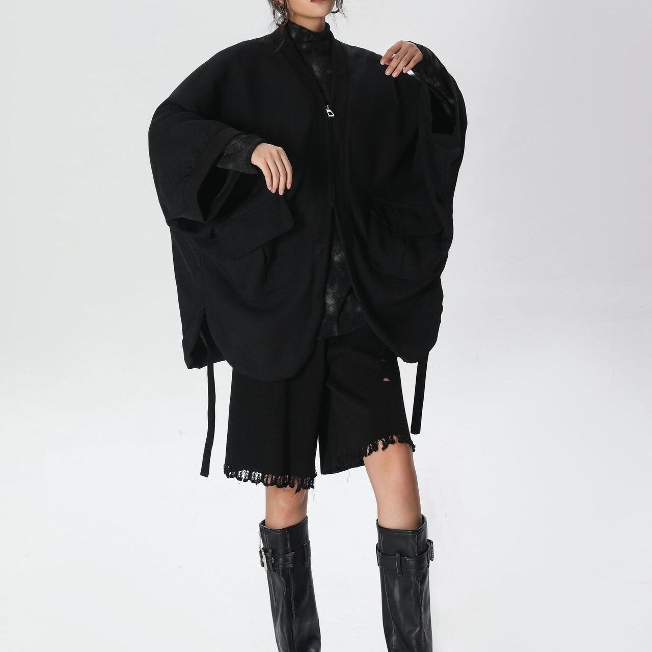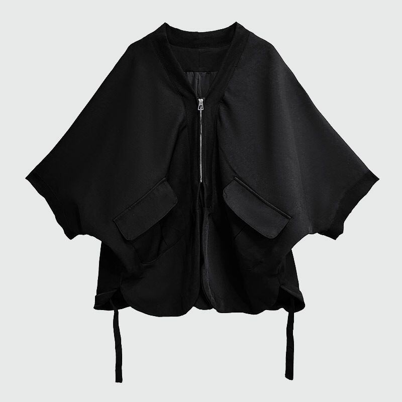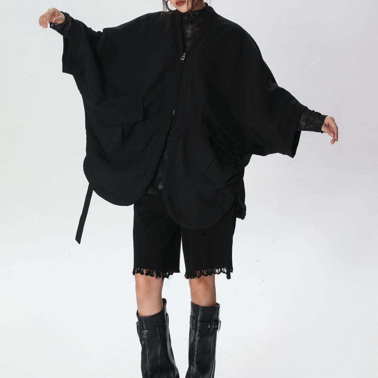 バットスリーブの半纏のようなシルエットが特徴的な、Vネック・7分袖・イレギュラーヘムのデザインジャケットです。短めのフルジップやデザインポケット、サイドのストラップなど細部までこだわりを感じるデザインです。ブラックで合わせやすい、コーディネートのアクセントになるアイテムです。