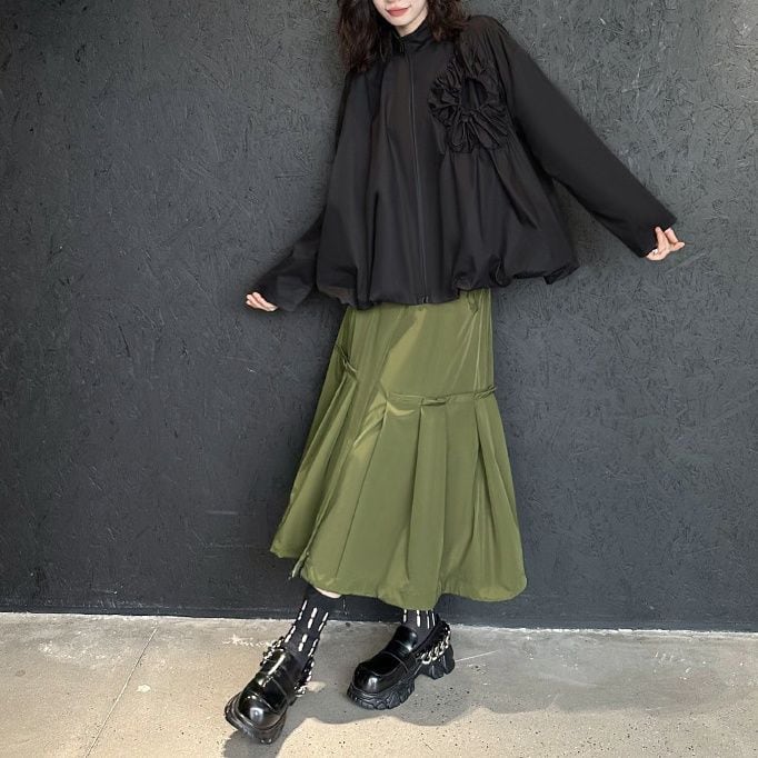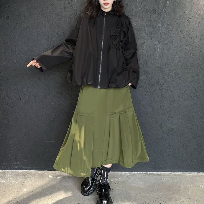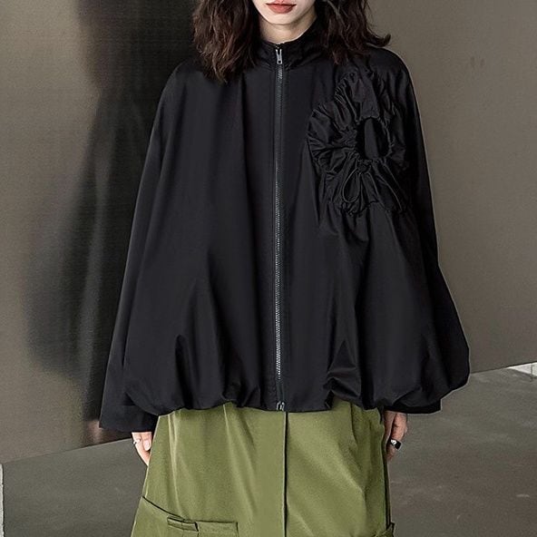 ドローコードを使ったお花のモチーフがキュートな、スタンドカラー・長袖・ショート丈のデザインジャケットです。フルジップにランタンのようなAラインのシルエットが魅力的な、ブラックの単色で合わせやすいカジュアルアイテムです。