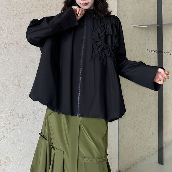 BLACK FLOWER MOTIF STAND COLLAR A-LINE FULLZIP JACKET 1color M-14999